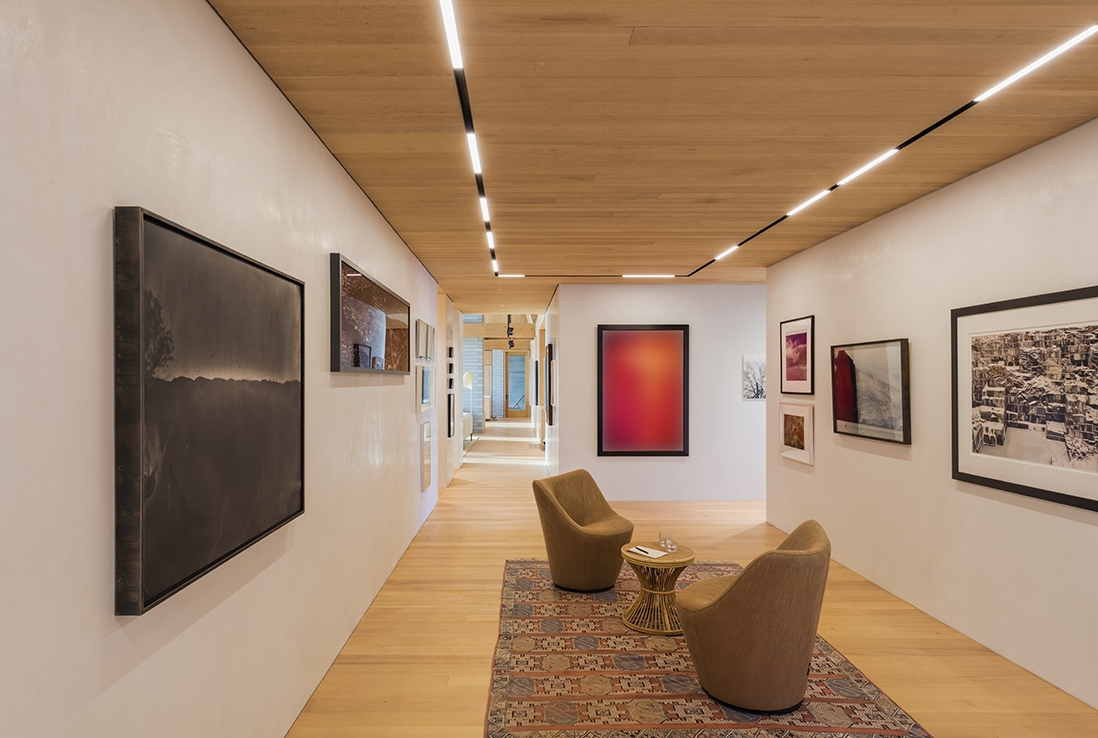 The private rooms spring off a central gallery hall which carries the owner’s favorite art pieces evenly illuminated by high efficiency LEDs with highest color fidelity. Other applications include 2” apertures at dropped ceilings, suspended stem fixtures washing the art-wall at the dining and living, suspended optical light at dining and linear shielded light at the kitchen island all controlled by dimmers.