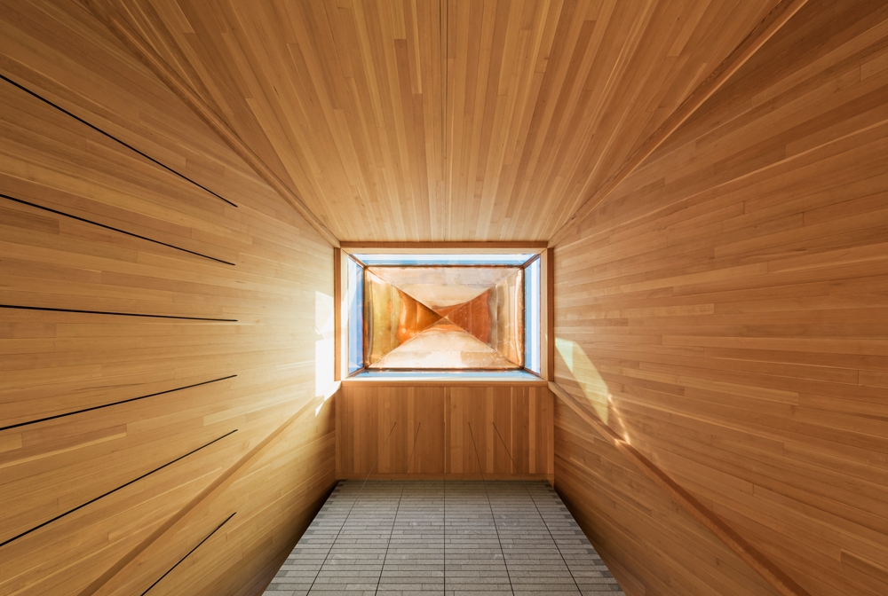 It is the high space of living, dining and kitchen that are capped with two copper-lined belvederes, which during day bathe the spaces in peach and pink hues of daylight, while at night reversely emit a soft glow of inhabitation.