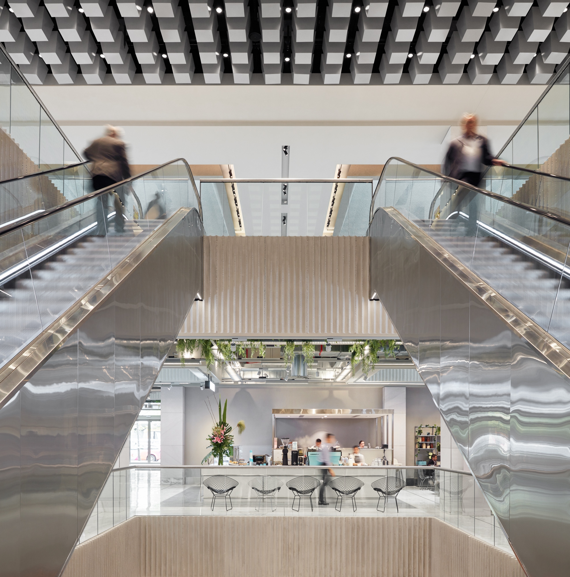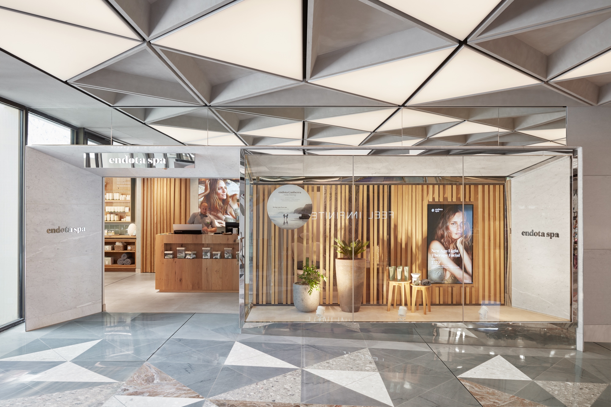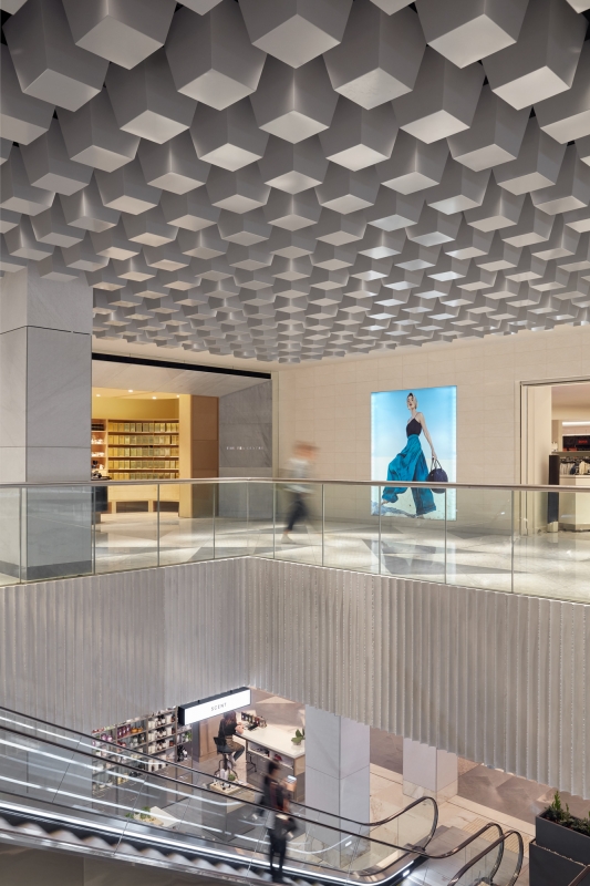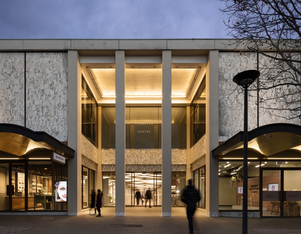 This design scheme includes restoring and redeveloping the historic 1963 centre, housing both Ainslie and Monaro Malls, with a new masterplan and newly designed facades, interiors and exterior spaces. Lighting is carefully integrated within both new and existing architectural elements celebrating the new modernist design by Universal Design Studio. Harking back to 1950s and ‘60s lighting influences of simple yet bold shapes, the lighting language of illumination, hidden luminaires within architectural details, and use of metal finishes thread together three main designed environments, connecting Ainslie Mall, Monaro Mall and the flagship Beauty Precinct as a new shopping experience in Canberra.