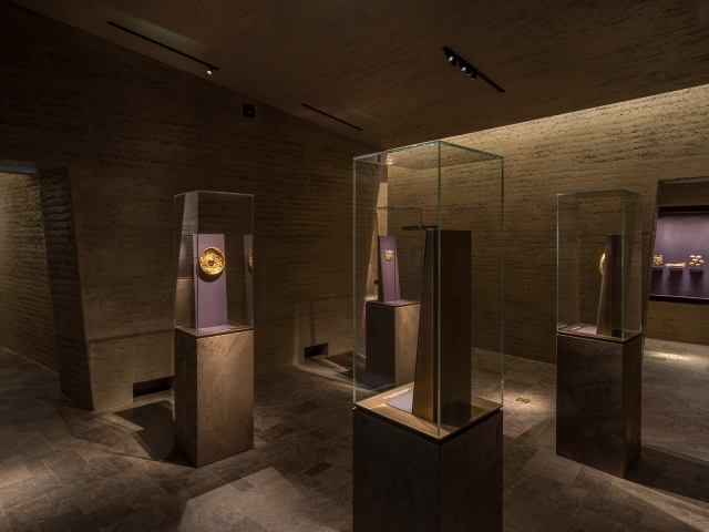 The lighting underlines the dramatic composition of the exhibition concept by emphasizing the exhibits with integrated lighting elements in an unobtrusive manner.