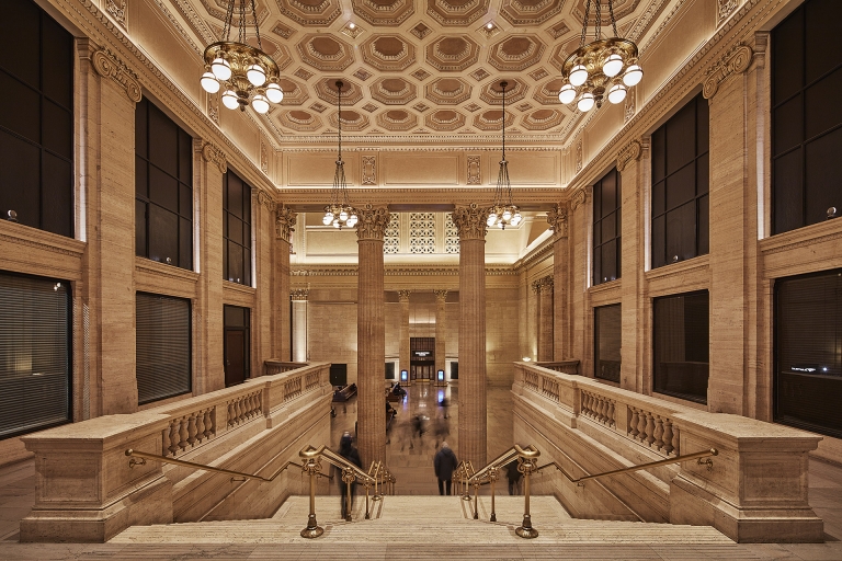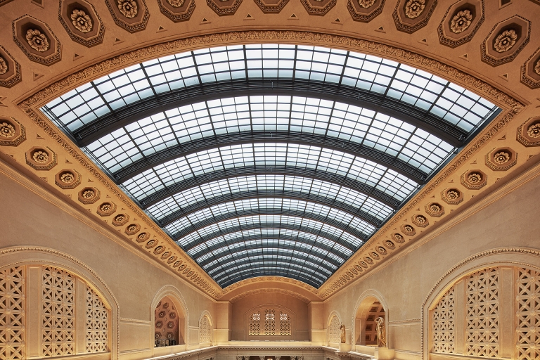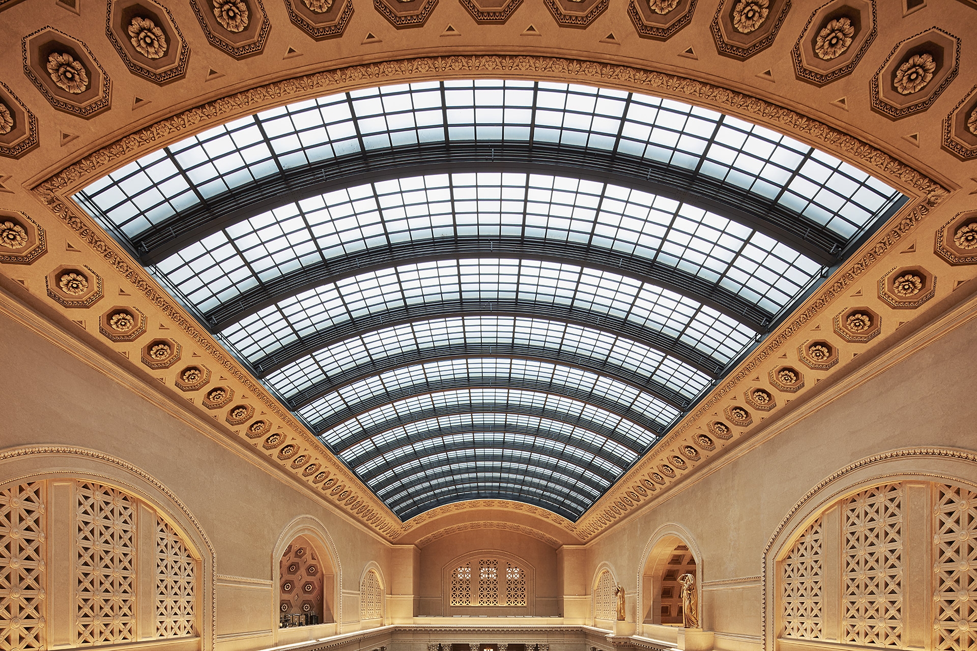 The iconic Great Hall inside Chicago’s Union Station was designed in 1925, but an aging skylight had led to water damage and deterioration. A 42-month project began to provide repairs and improvements, including restoring the skylight and original color scheme.