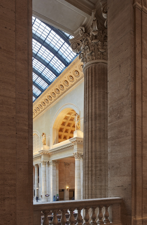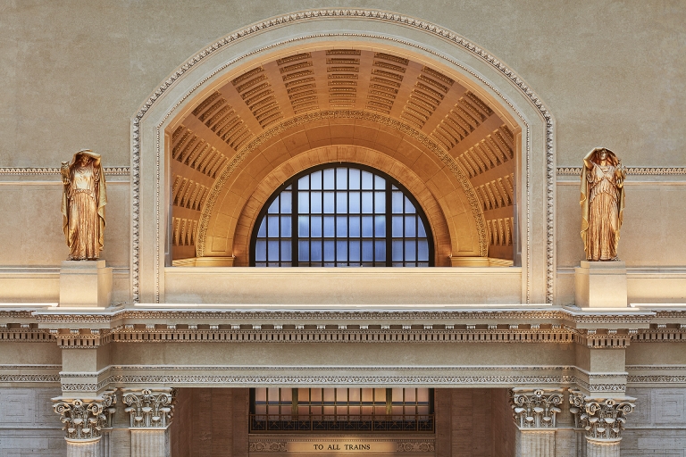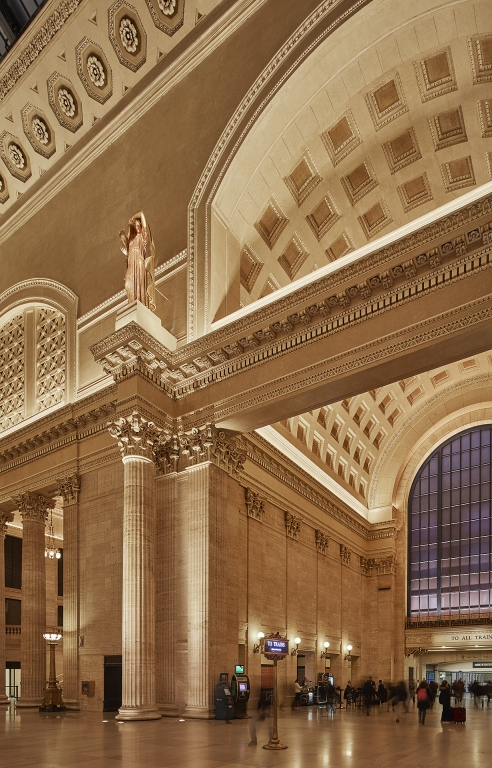 New LED cove lights on the second floor ledge wrap the hall, calling attention to space's volume and intricate plaster detailing. Inground column uplights provide brightness at pedestrian level, and color changing grazers allow the station to customize for events. At adjacent stair and mezzanine areas the original chandeliers were restored and upgraded to LED. Low profile cove lights and discreet downlights were added to increase light levels to balance with the hall. All lighting is now dimmable and controllable. With this new lighting design, the station is able to provide ambiance and a new experience to travelers and visitors alike.