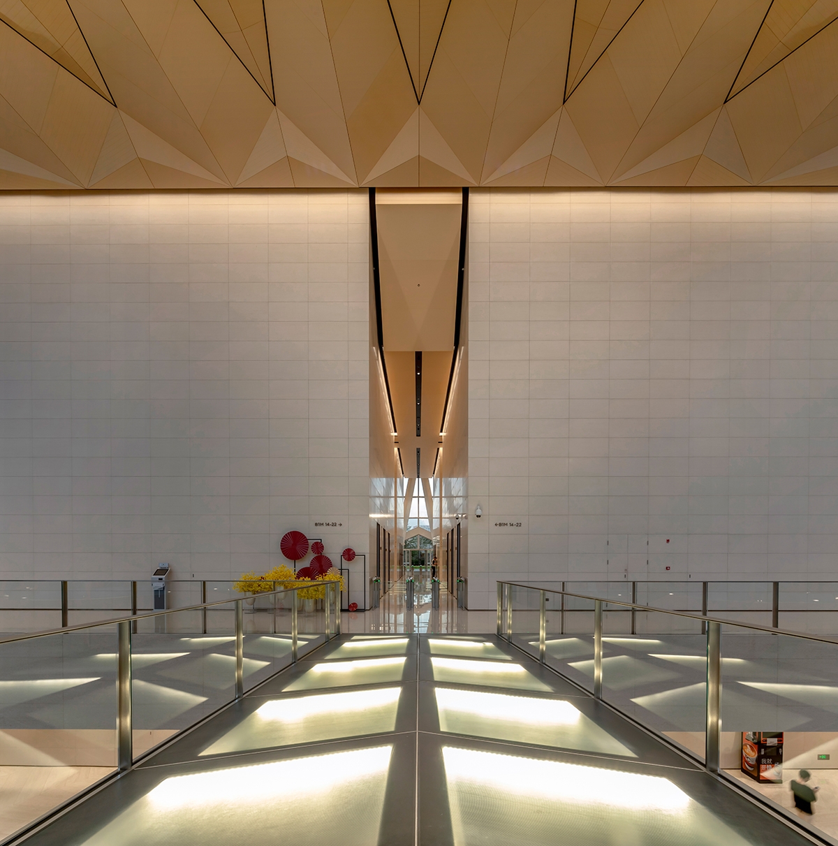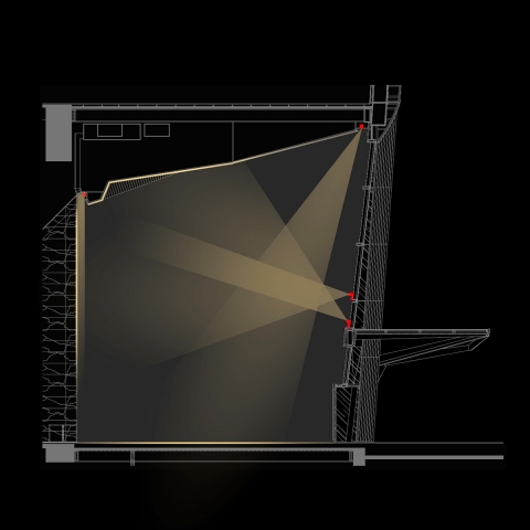 To keep surfaces lit quietly, a study of opposite versus adjacent was applied. For the flawless expression, ceiling and wall surfaces are illuminated through projected light from the curtain wall. Ambience is achieved through recessed lighting aligning the angular ceiling edges. A linear grazer provides a visual horizon between the ceiling and wall.