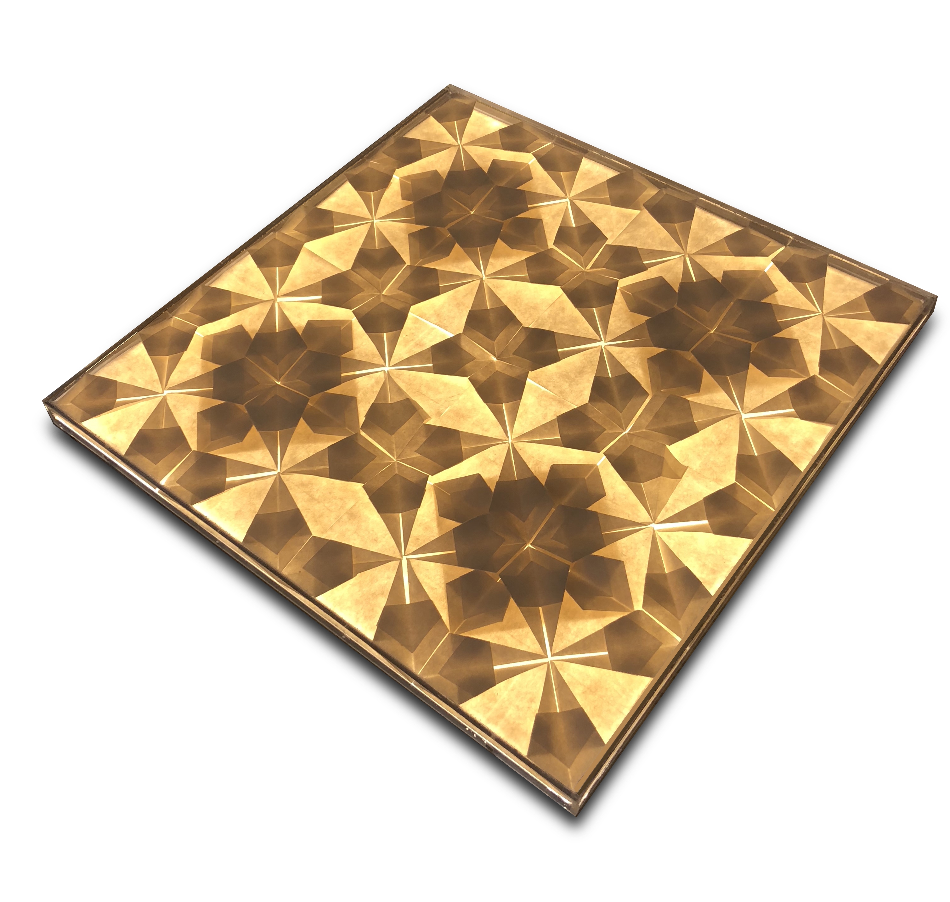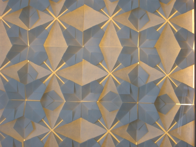 Origamilight II is a flat module made from acylic and handfolded Japanese paper. Each module is backlit by state of the art LED technology and glows in crème, apricot and orange hues depending on the brightness of the surrounding area, therefore it changes appearance throughout the day. The three dimensional paper tiles remind of a kaleidoscope when changing the angle of view.