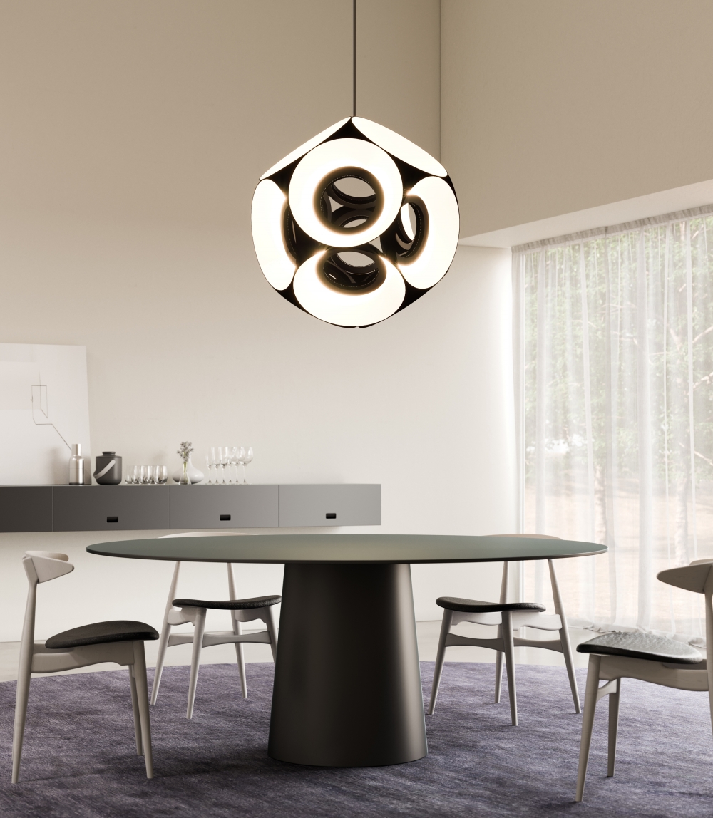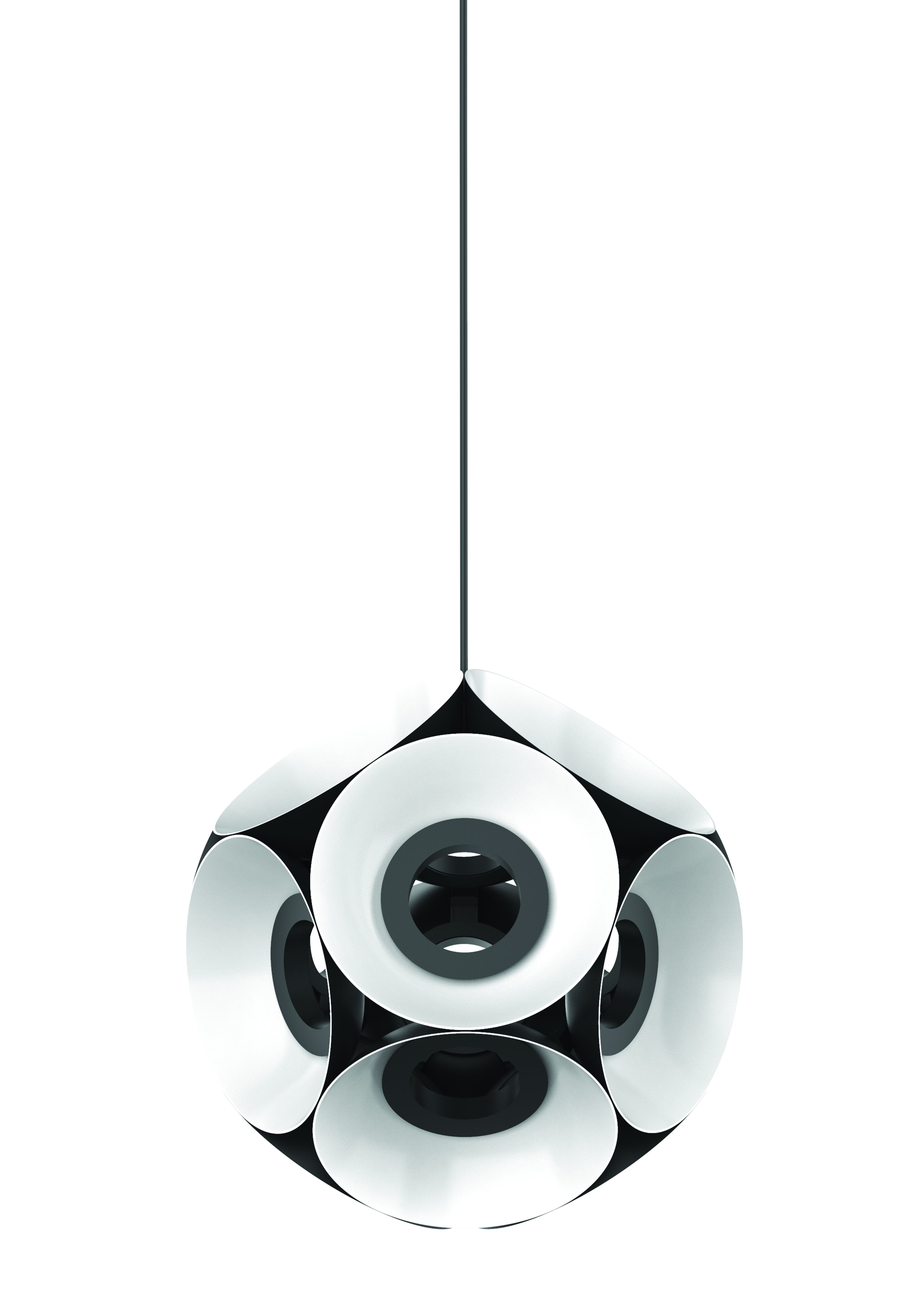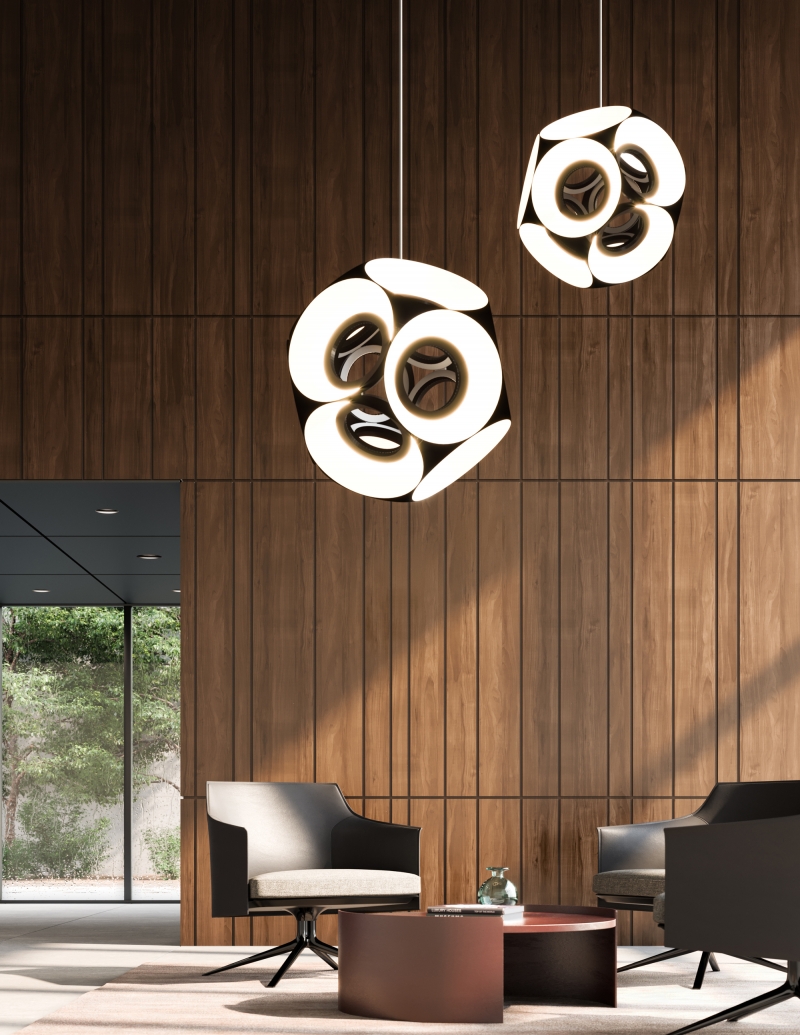Entry DescriptionThe Magellan commands contemporary spaces with elegance, and pure, concentric form. Multiple shades surround a hollow center in a static orbit, creating a soft, floral effect that invites the eye to navigate the fixture’s contoured repetition. Indirect light is cast onto the shade interiors, creating an even, ambient glow. Featured as a stand-alone or clustered in larger spaces, the Magellan is especially suitable as a dramatic focal point, available in black finish.