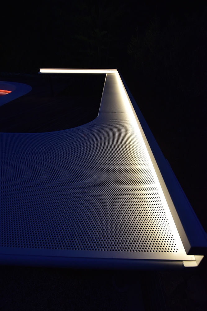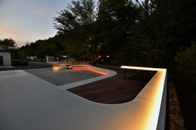 We try to set home space in the factory to communicate between workers with warm lighting. Warm orange colored lighting with the three dimension curving bench invites you the space as special lighting color in the factory. Layer lighting with table lighting and a lighting with a pole generates depth of the space and impressive space with night activities.
