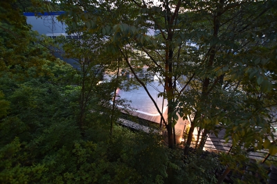 This plaza is located at the center of the factory, however in evening, there is dark because of lack of lighting and surrounding forest. Mainly lighting are equipped only for roads with only cold colored light.