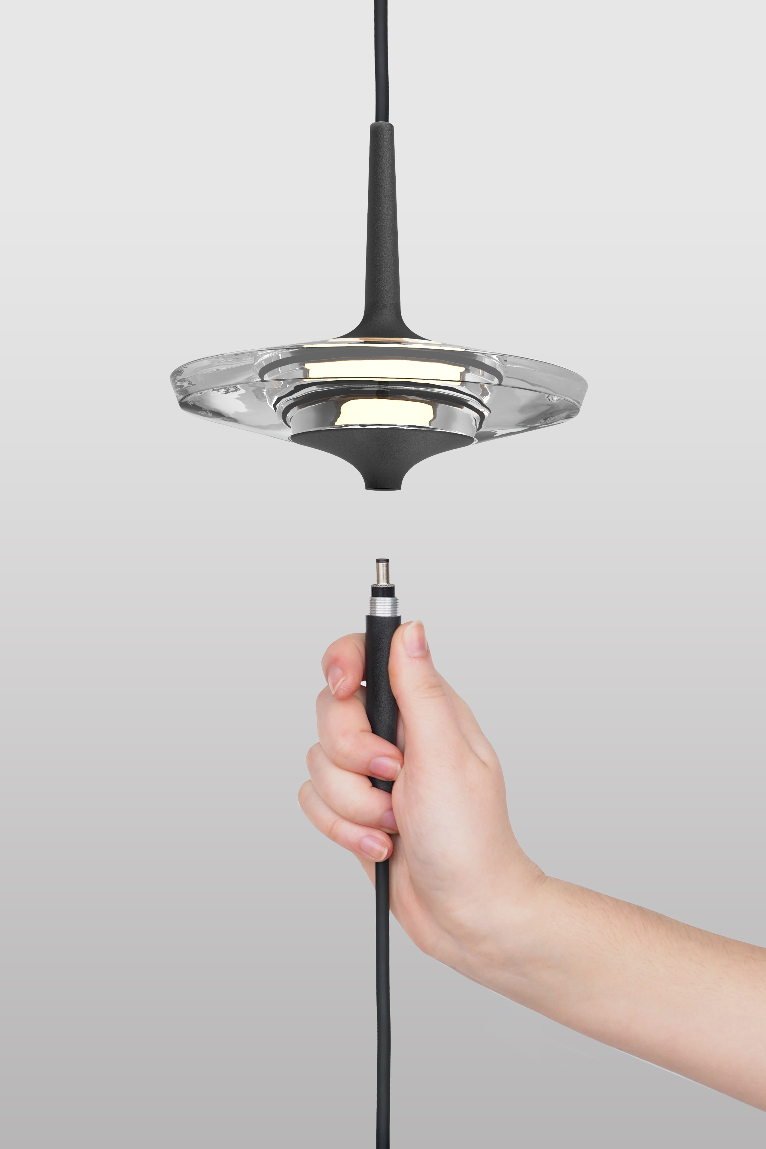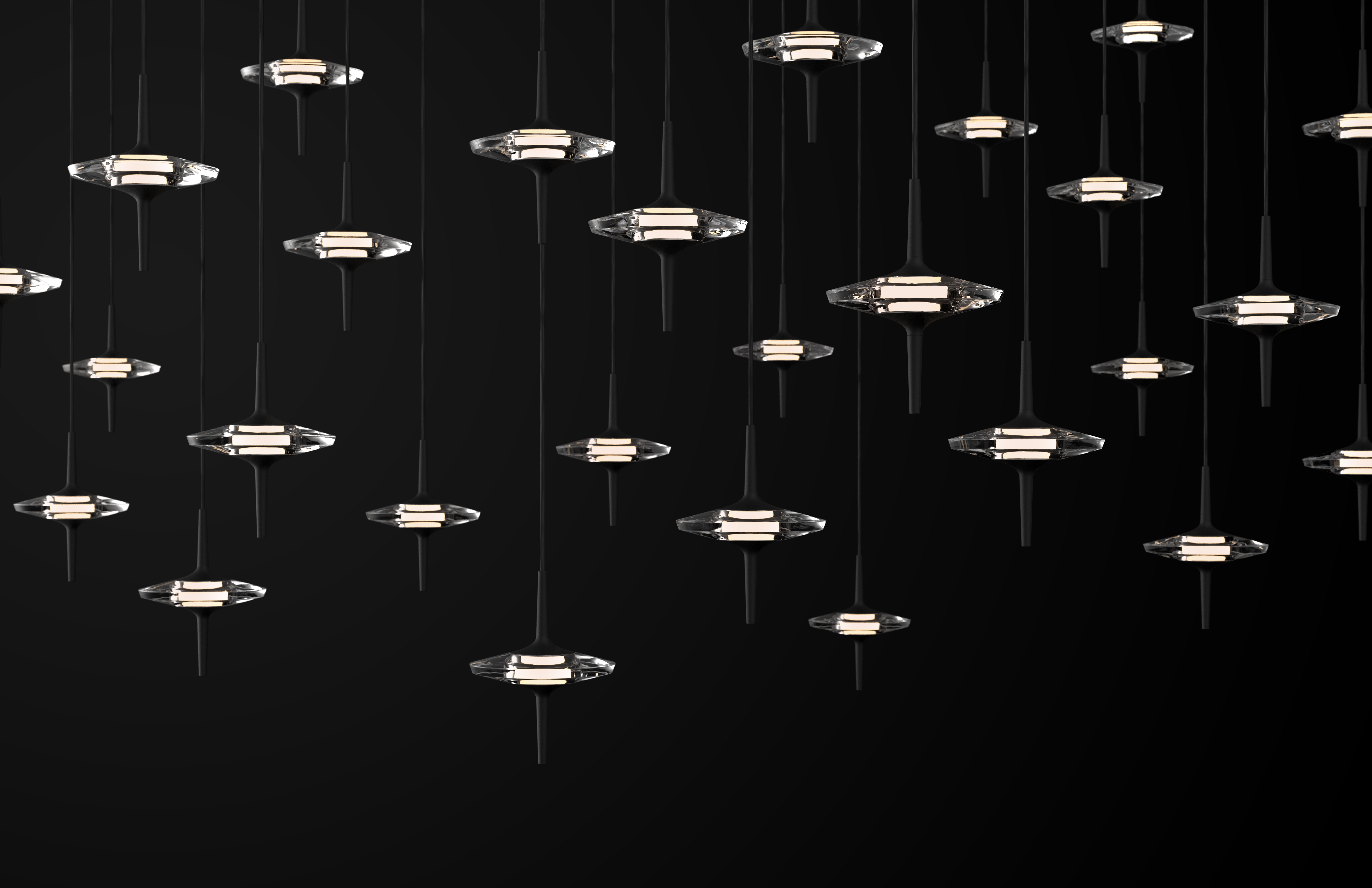 Three canopy options are available for Celeste. Droplet, available in black, is a small 3-inch canopy developed to connect a single cable Celeste seamlessly to the ceiling. Drop is a canopy for three or six cables for classic round clusters and is available in black, chrome or white. And, Array is a rectangular canopy for three or five cables to create linear arrangements.