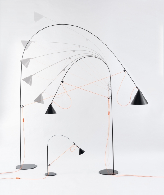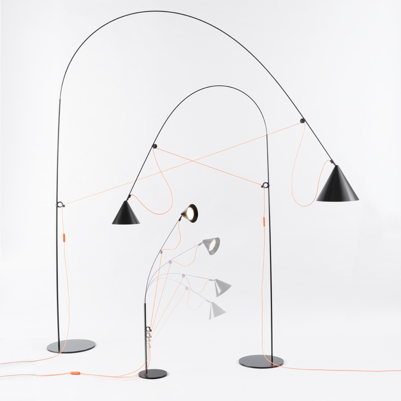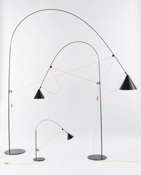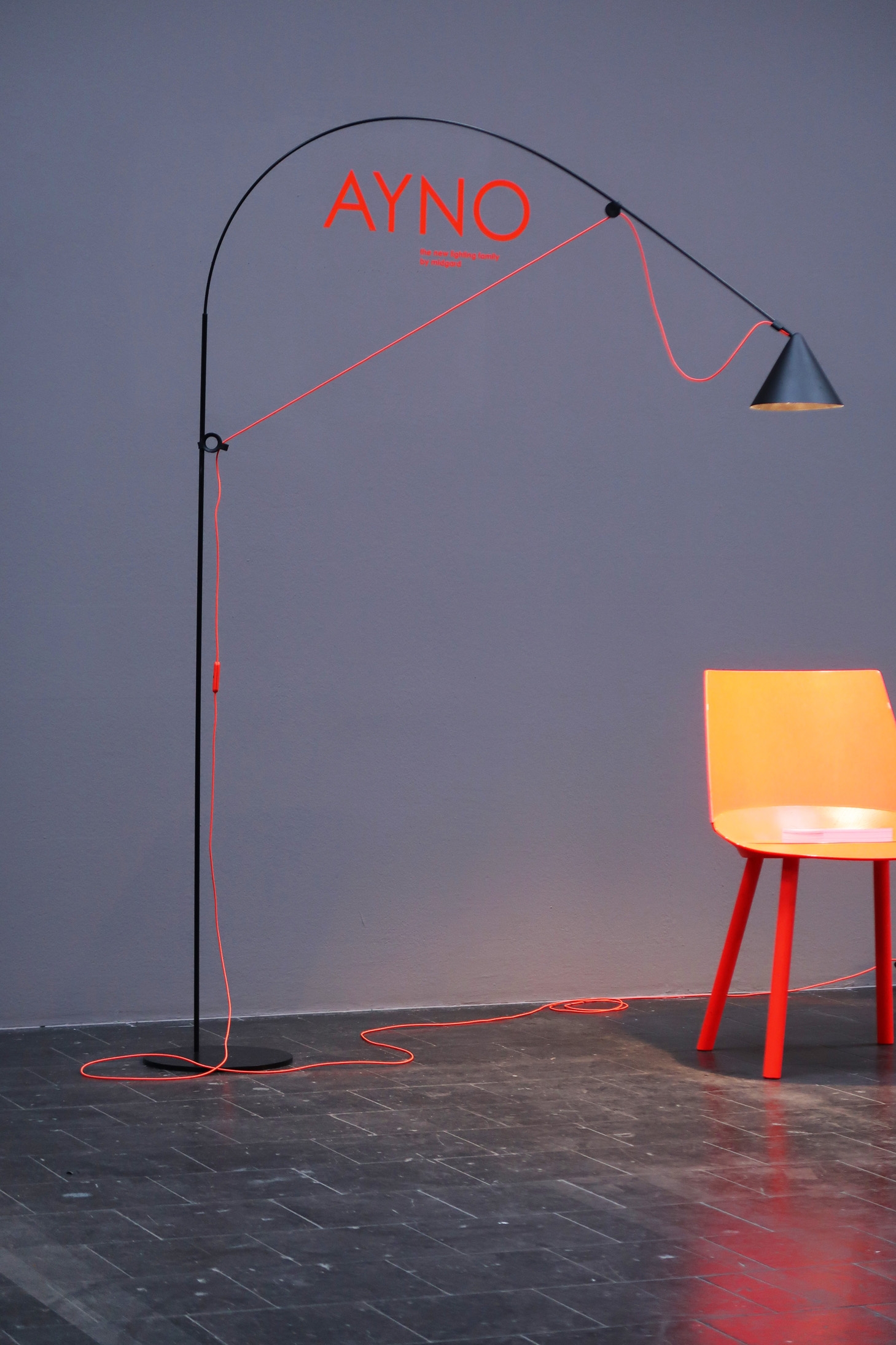 central feature of the AYNO lighting family is a fiberglass rod, which is stretched to the bow by the luminaire cable. the inherent tension of the rod allows a lamp without any joints. by sliding the two adjustment rings at top and bottom, the fiberglass rod is bent into the desired position and the light is directed where needed. the cable tightens the rod into an arc, of which the radius can be varied as required using the adjustment rings. the fine adjustment is done with the swiveling lampshade.