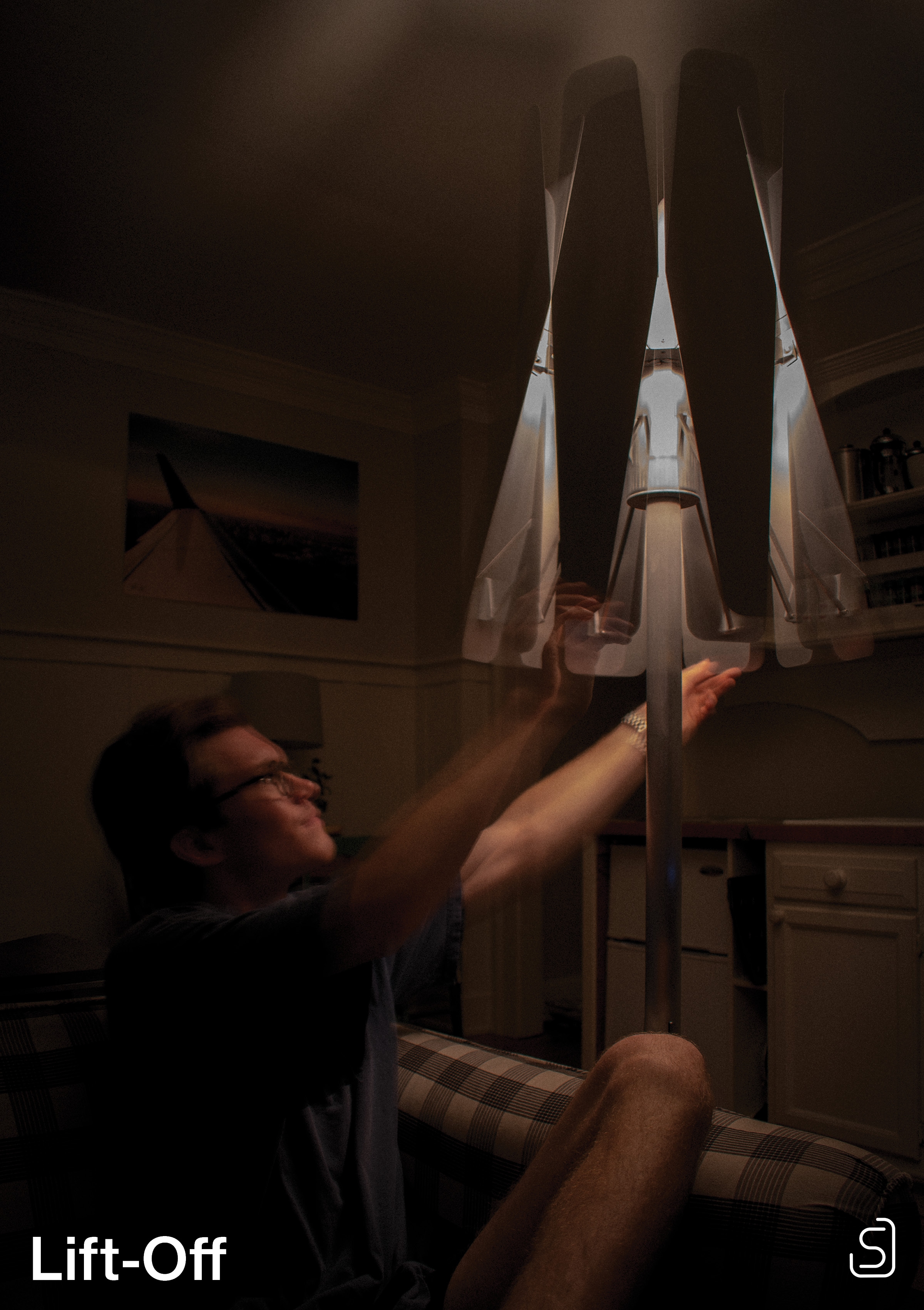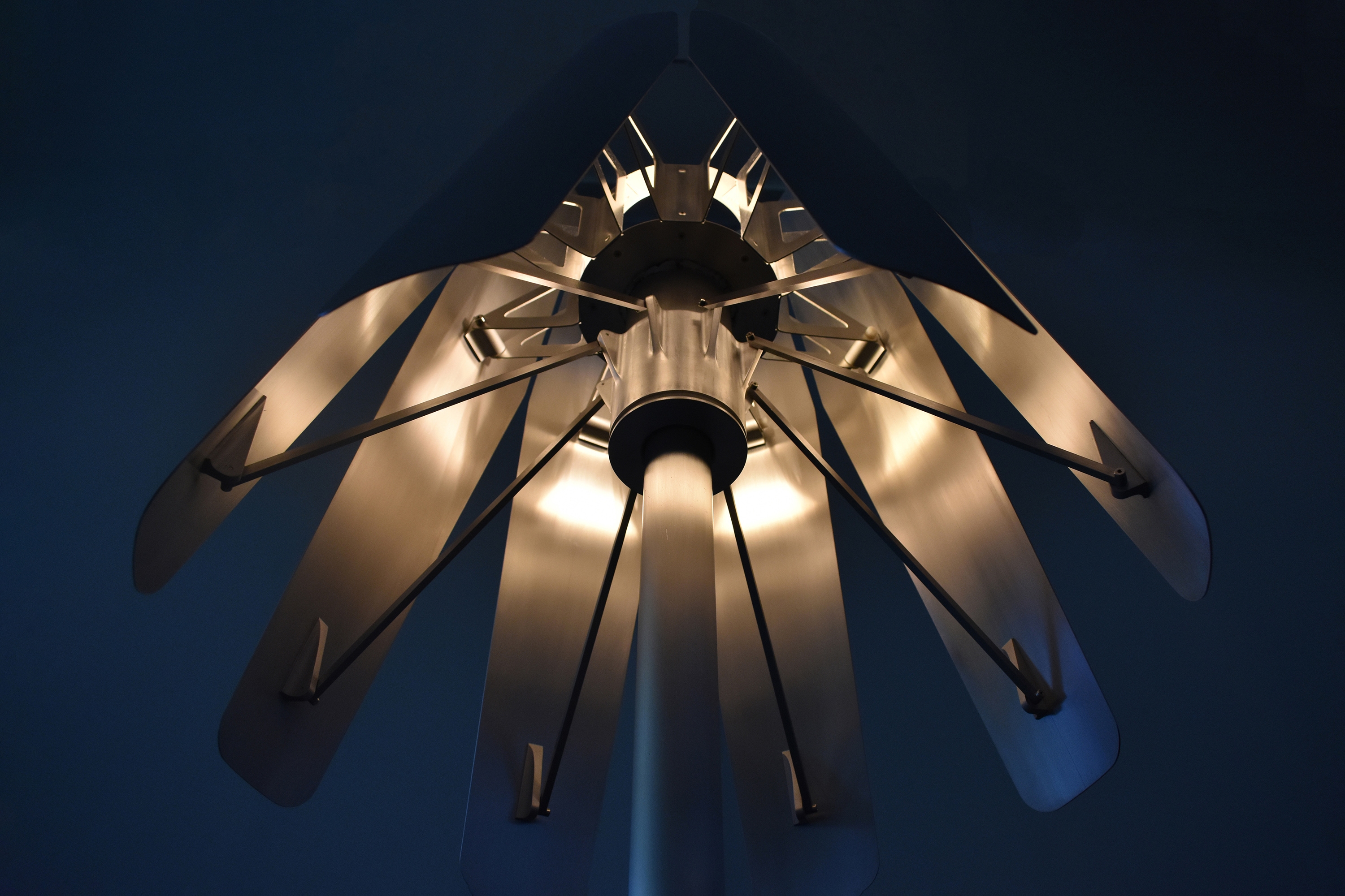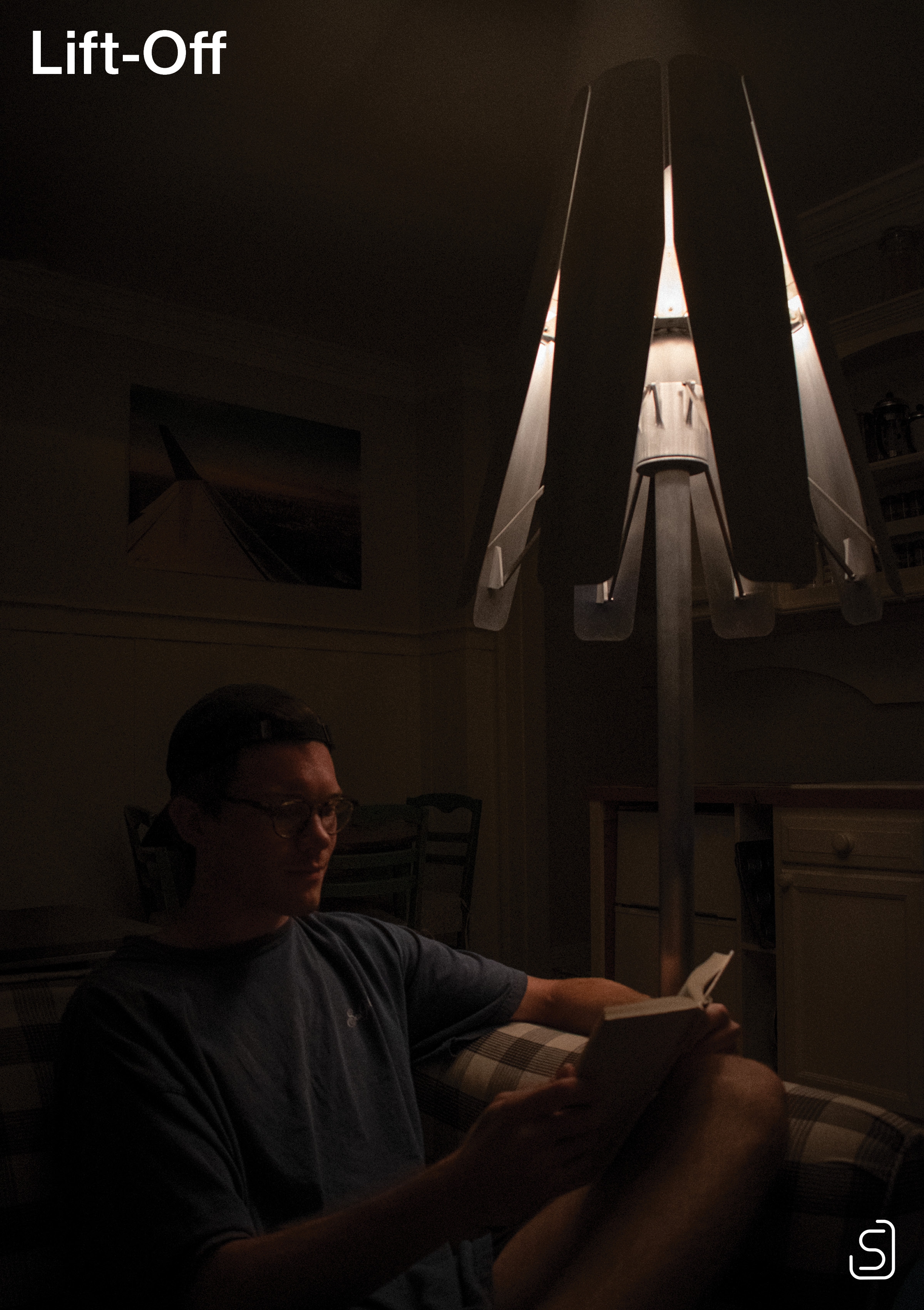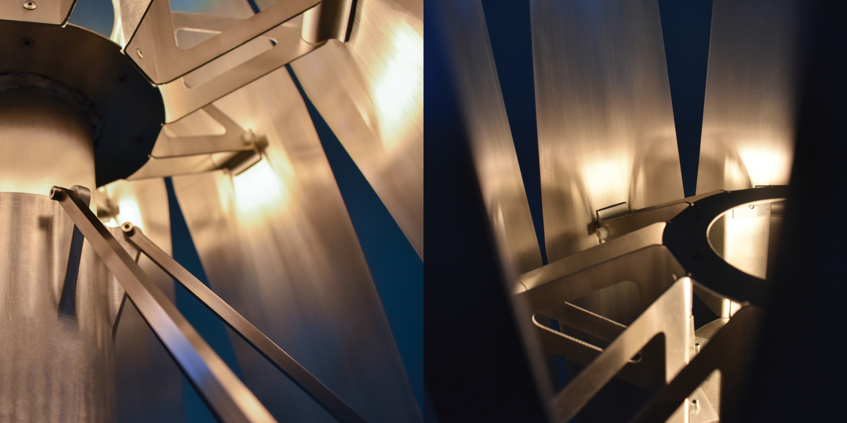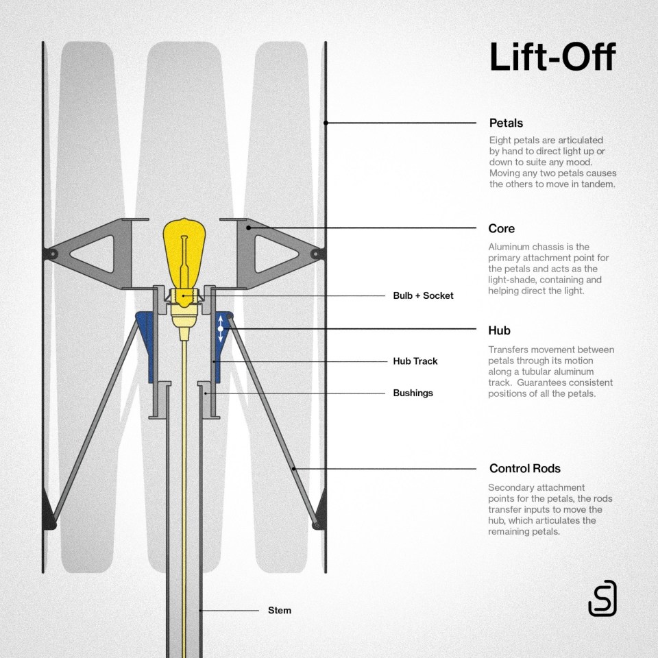 Inspired by jet engine nozzles, the mechanism centers around a friction hub that is radially linked to each petal by control rods. Movement of any petal applies force to the hub, moving the others in tandem. Radial symmetry simplifies fabrication and assembly. The lamp is primarily constructed of aluminum, brushed to a bright, silky luster. The light source itself is concealed within, stimulating curiosity. Glimpses of the internal workings juxtapose the seamless petal exteriors, drawing the user to explore their function. Lift-Off can be set to a range of positions, giving ultimate flexibility and control for those craving a particular lighting experience.