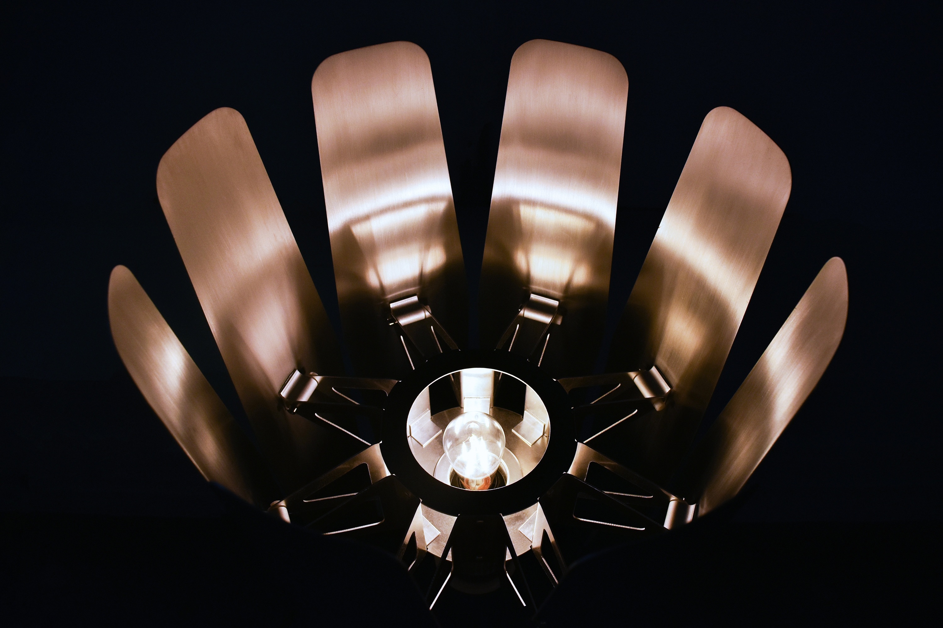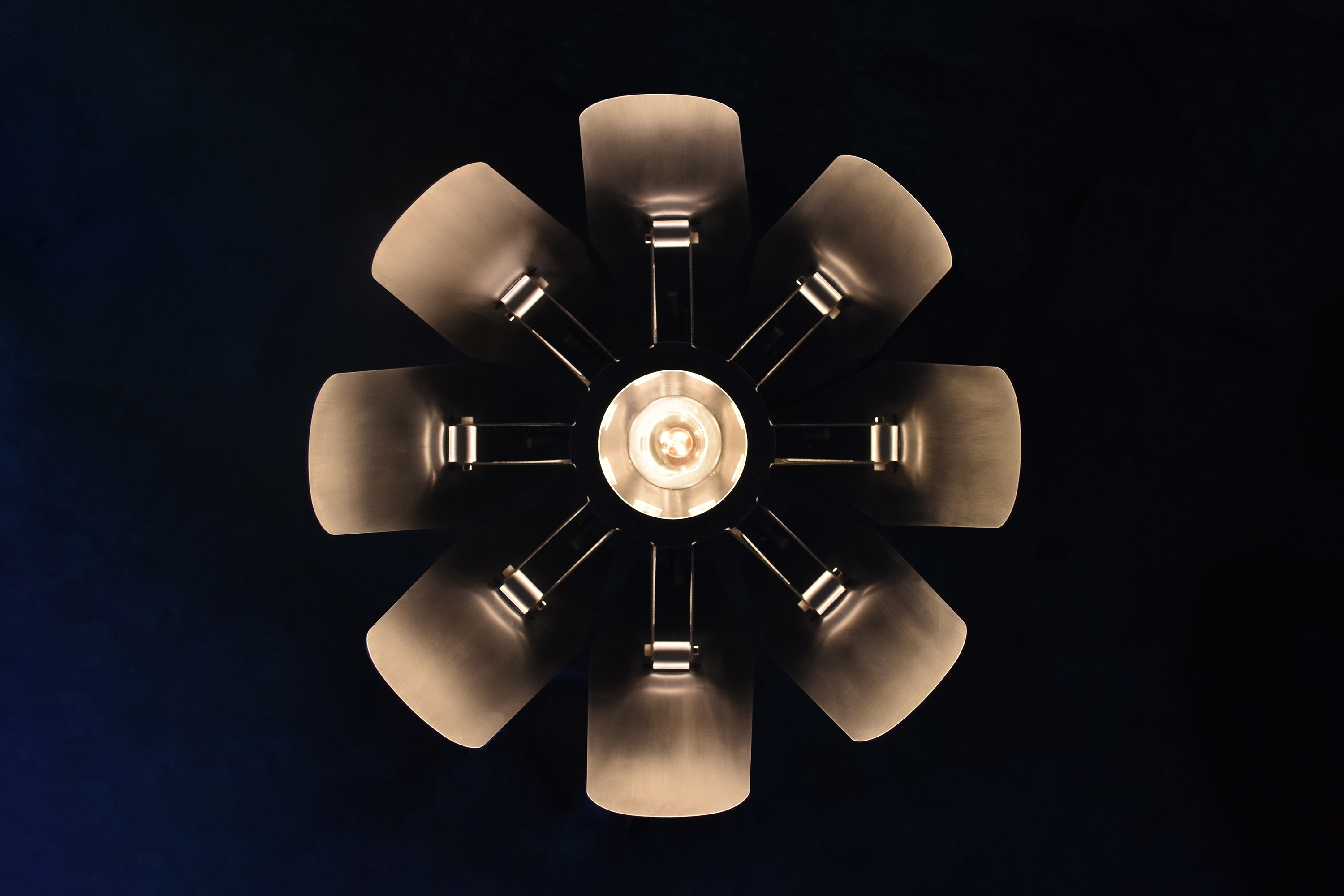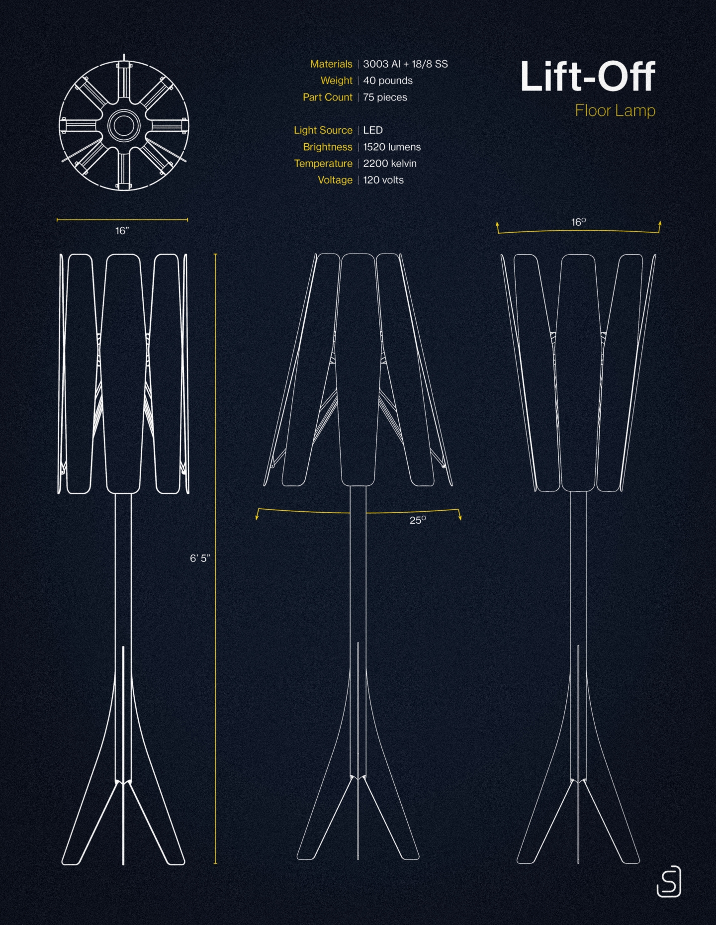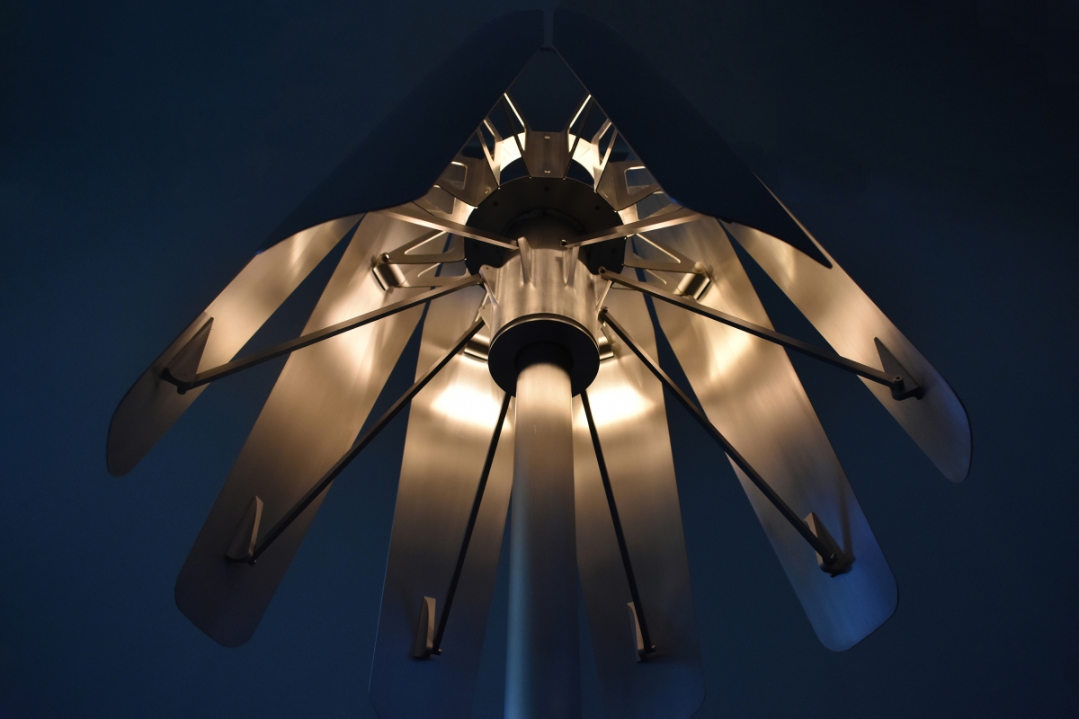 Inspired by jet engine nozzles, the mechanism centers around a friction hub that is radially linked to each petal by control rods. Movement of any petal applies force to the hub, moving the others in tandem. Radial symmetry simplifies fabrication and assembly. The lamp is primarily constructed of aluminum, brushed to a bright, silky luster. The light source itself is concealed within, stimulating curiosity. Glimpses of the internal workings juxtapose the seamless petal exteriors, drawing the user to explore their function. Lift-Off can be set to a range of positions, giving ultimate flexibility and control for those craving a particular lighting experience.