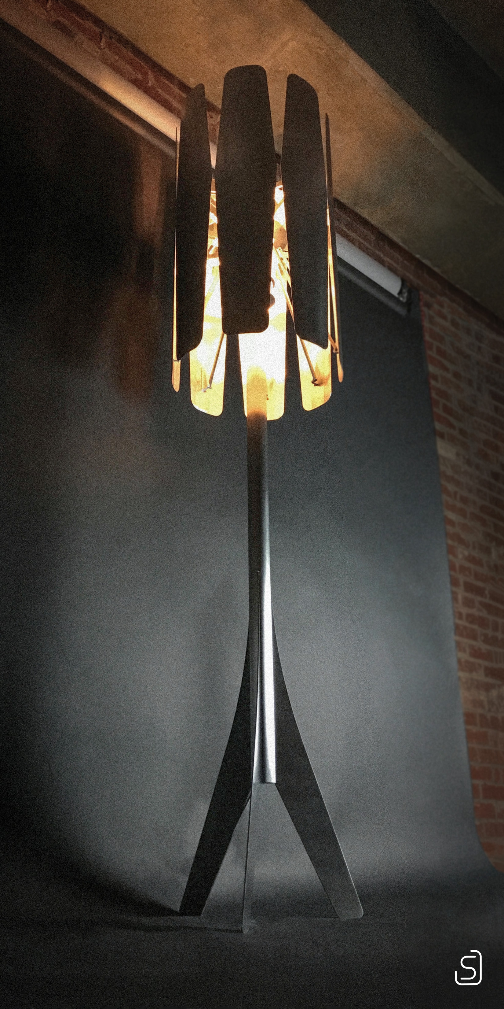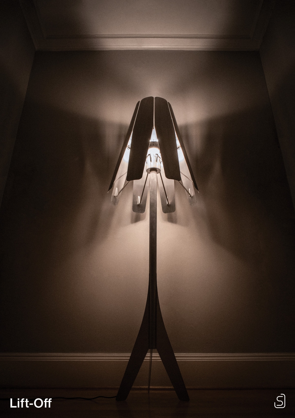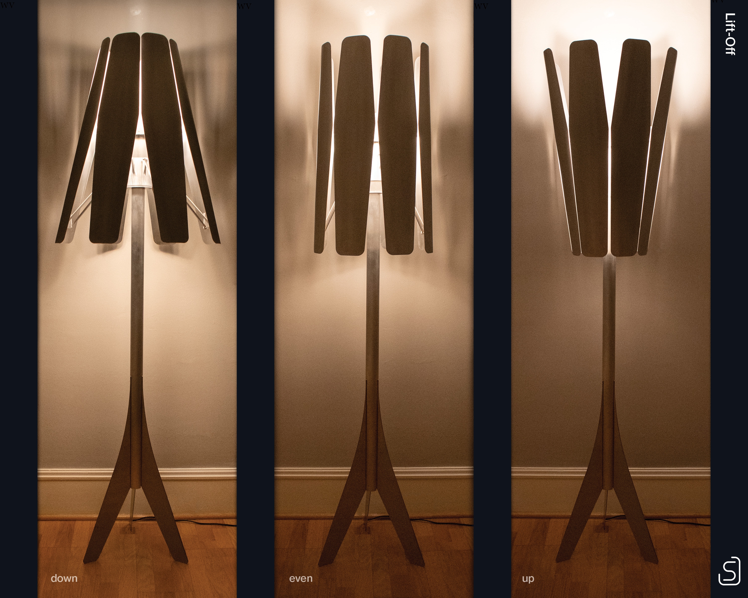 Lift-Off is an interactive, articulating floor lamp. The light direction is set by moving the lower edge of any petal, giving it the ability to produce a variety of desired atmospheres. Dynamic physical interaction unlocks a deeper connection with the light. The neutral "even" position casts a uniform light equally in every direction. Moving the petals to the "up" position sets the stage for a social event, while moving them "down" produces a cozy atmosphere ideal for relaxing or reading a book.