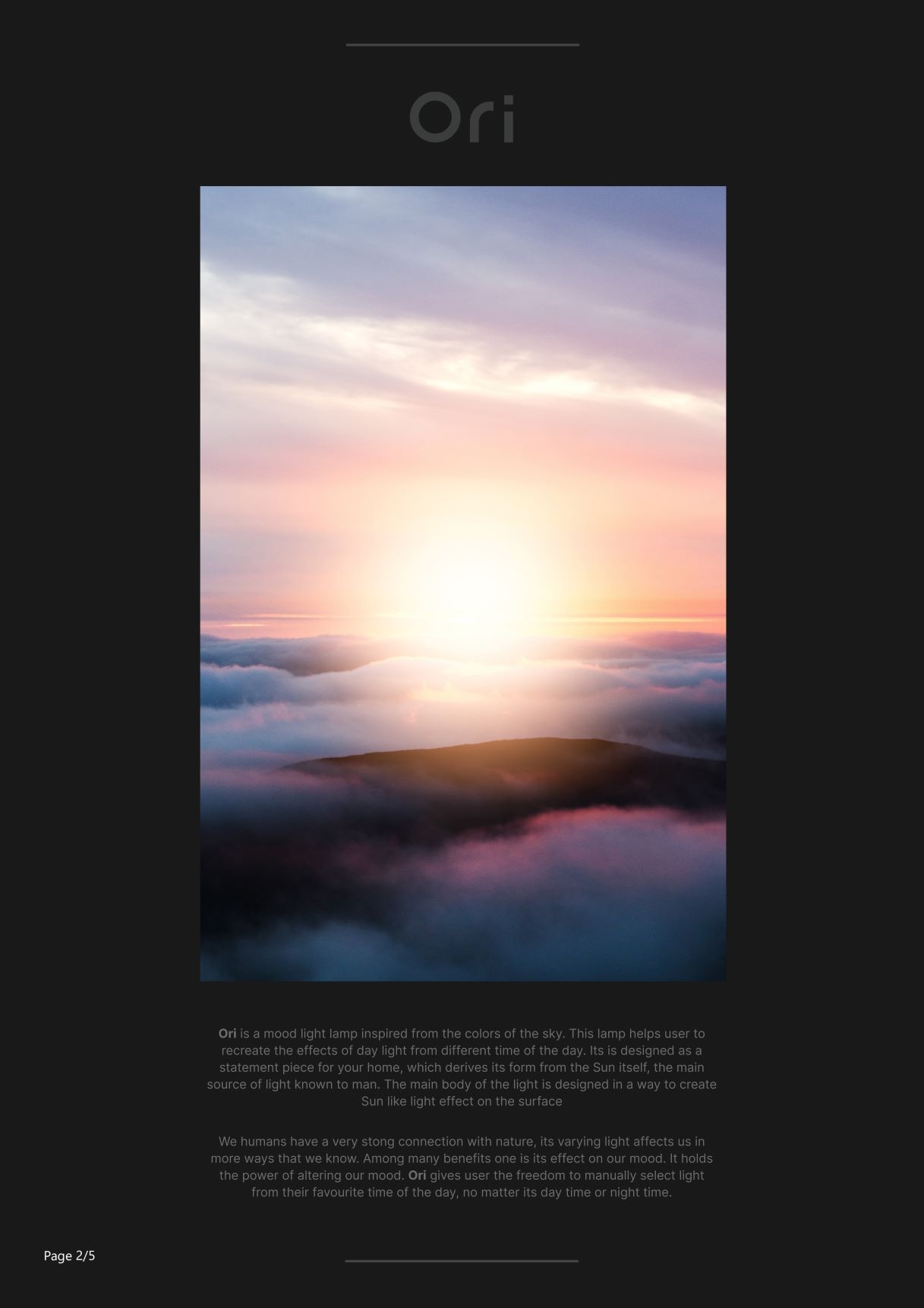 Ori is a mood light lamp inspired from colors of the sky. This lamp helps the user to recreate the effect of day light, from a different times of the day. It is designed as a statement piece for our homes, which derives its form from sun itself, the main source of light known to man. The main body of the light is designed in a way to create sun-like light effect on the surface.