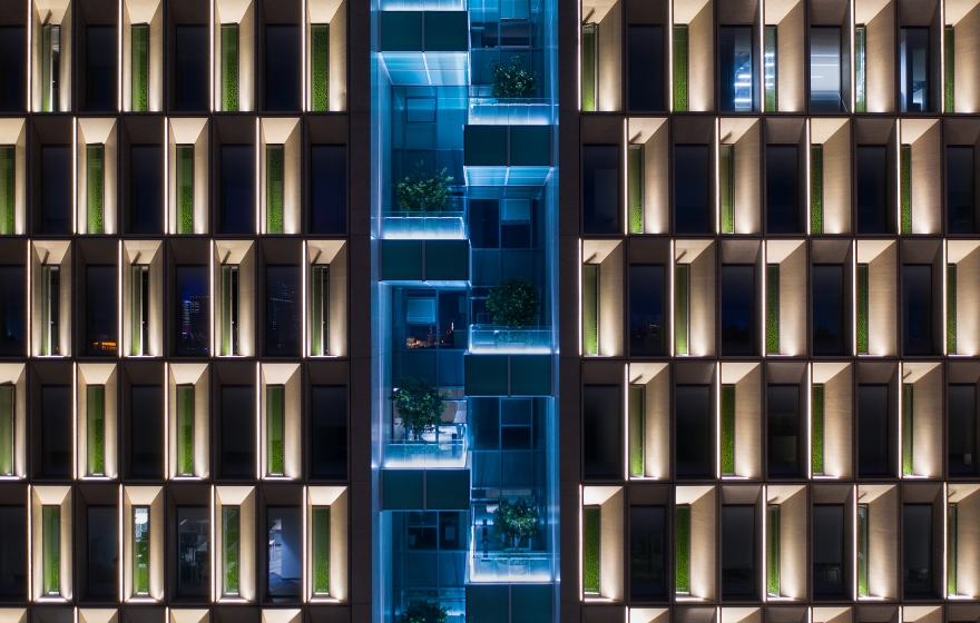 The headquarters building consists of a tower and a podium. The lighting design fully takes into account the characteristics of the building, in order to reproduce its daytime look in the evening.
