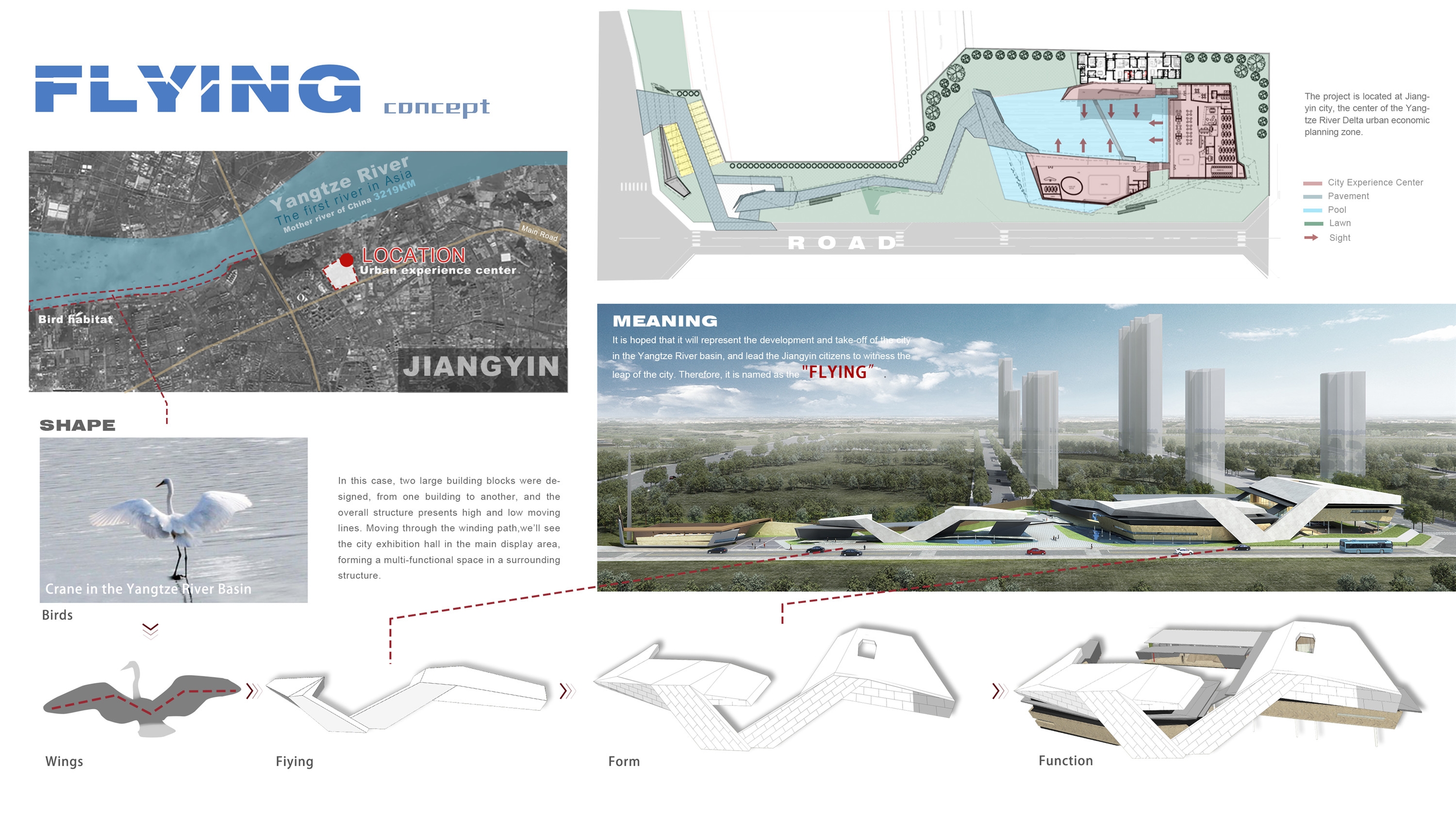 Entry DescriptionThe project is located at Jiangyin citys located on the edge of the Yangtze River. The Yangtze River is China's largest river, and it has nurtured the advanced Yangtze River Economic Belt. Jiangyin Designers use the advantages of geographical location to create an urban art experience center, which symbolizes the expectation for the city’s future development. It is hoped that it will represent the development and take-off of the city in the Yangtze River basin, and lead the Jiangyin citizens to witness the leap of the city. Therefore, it is named as the "Flying”.