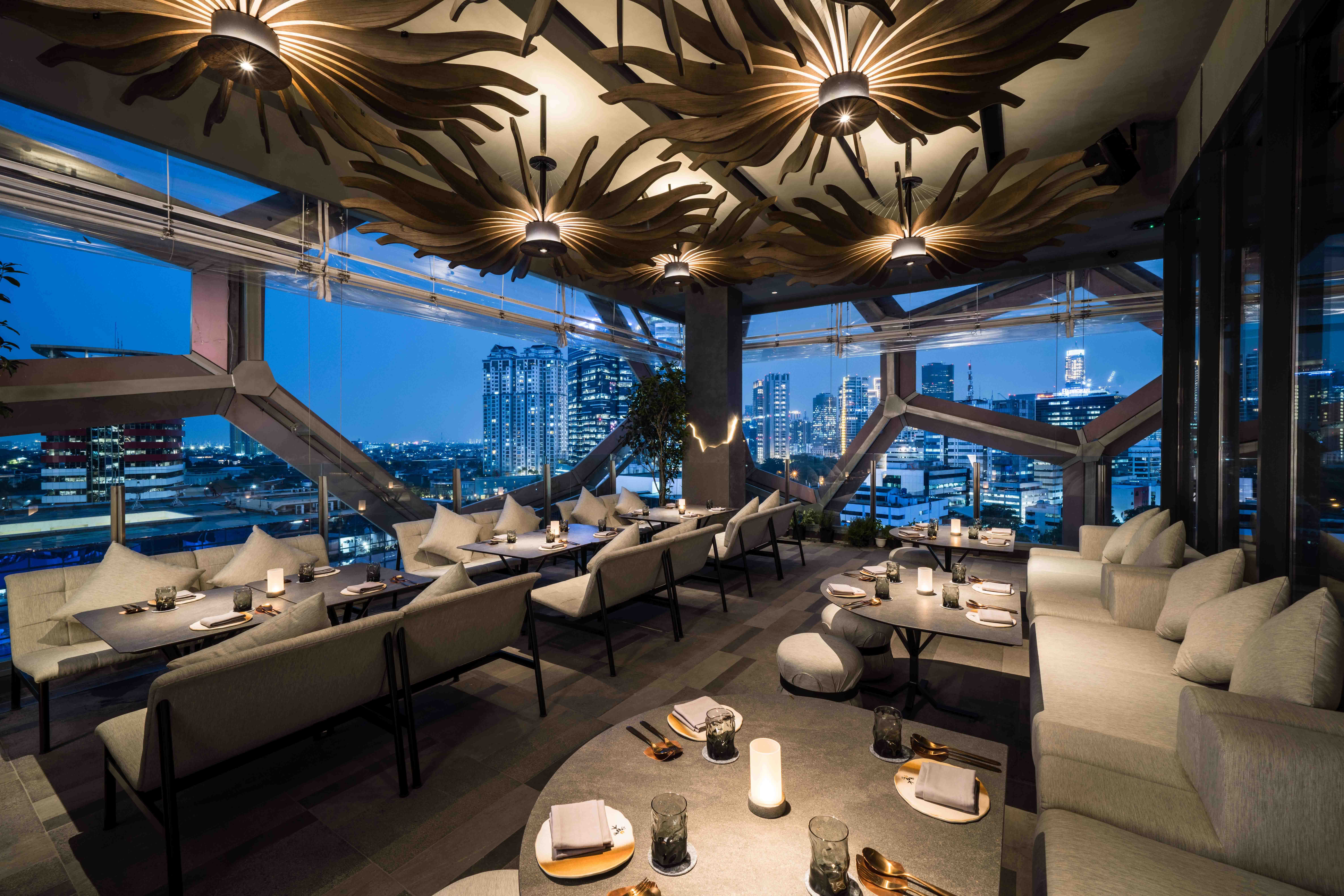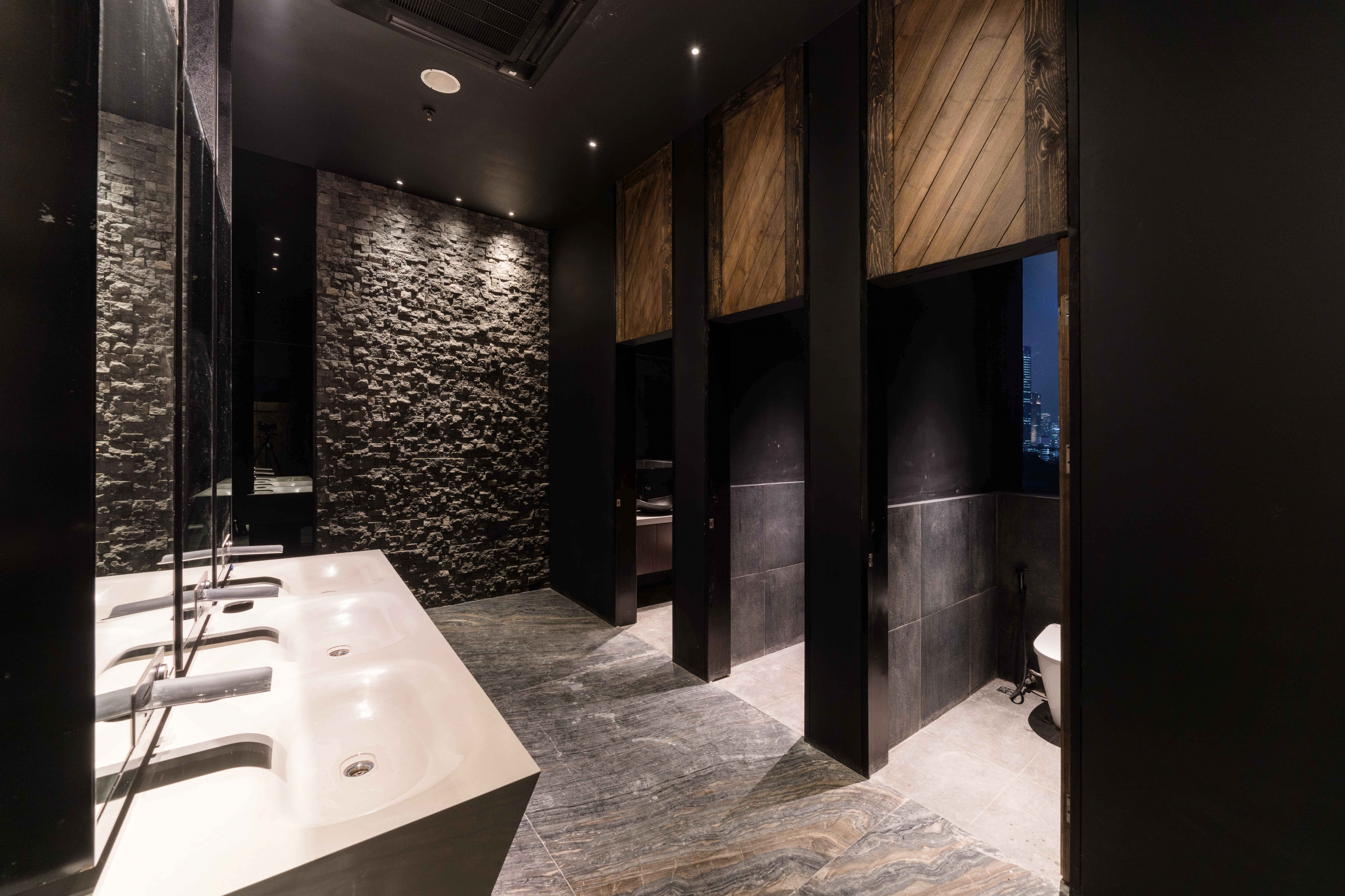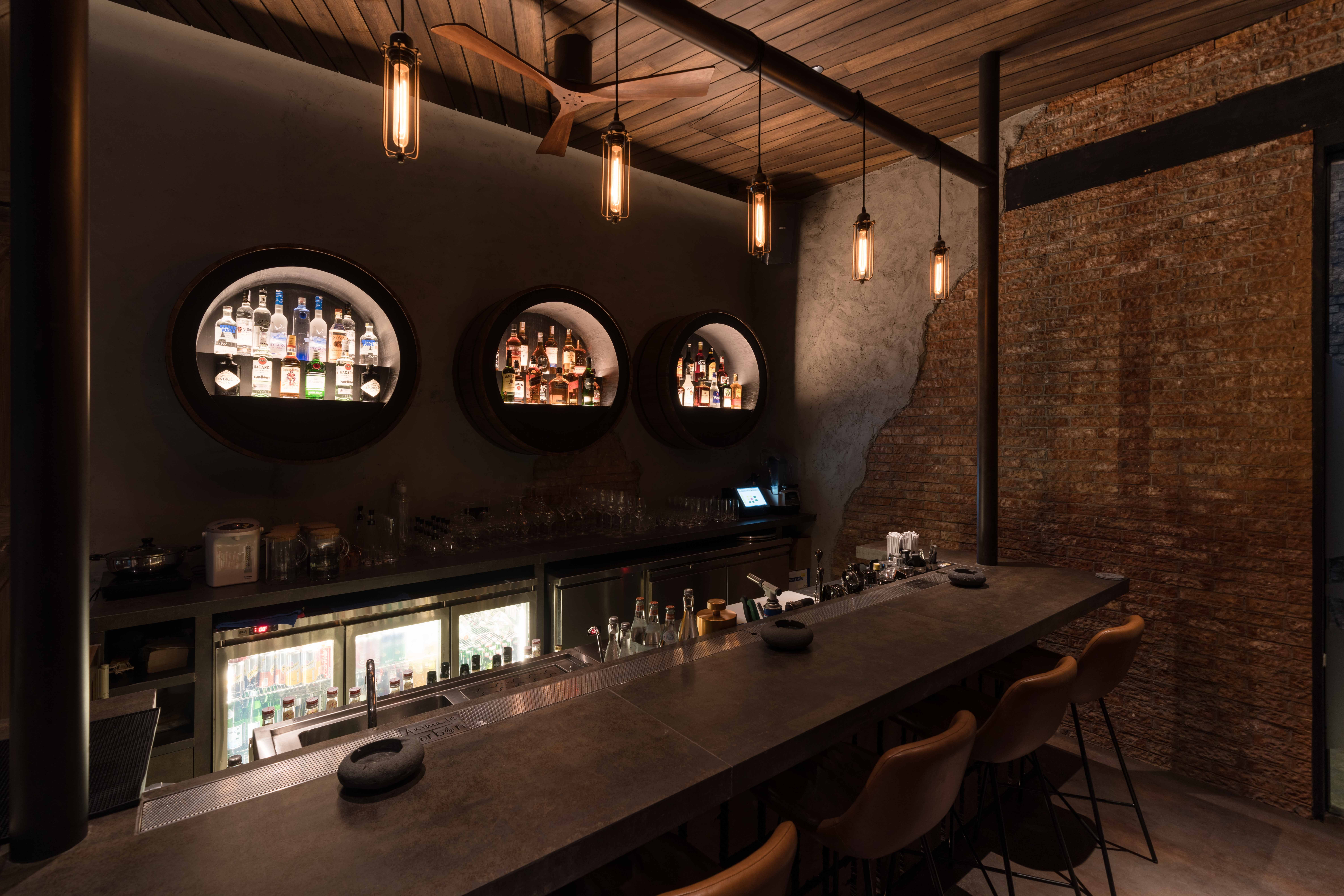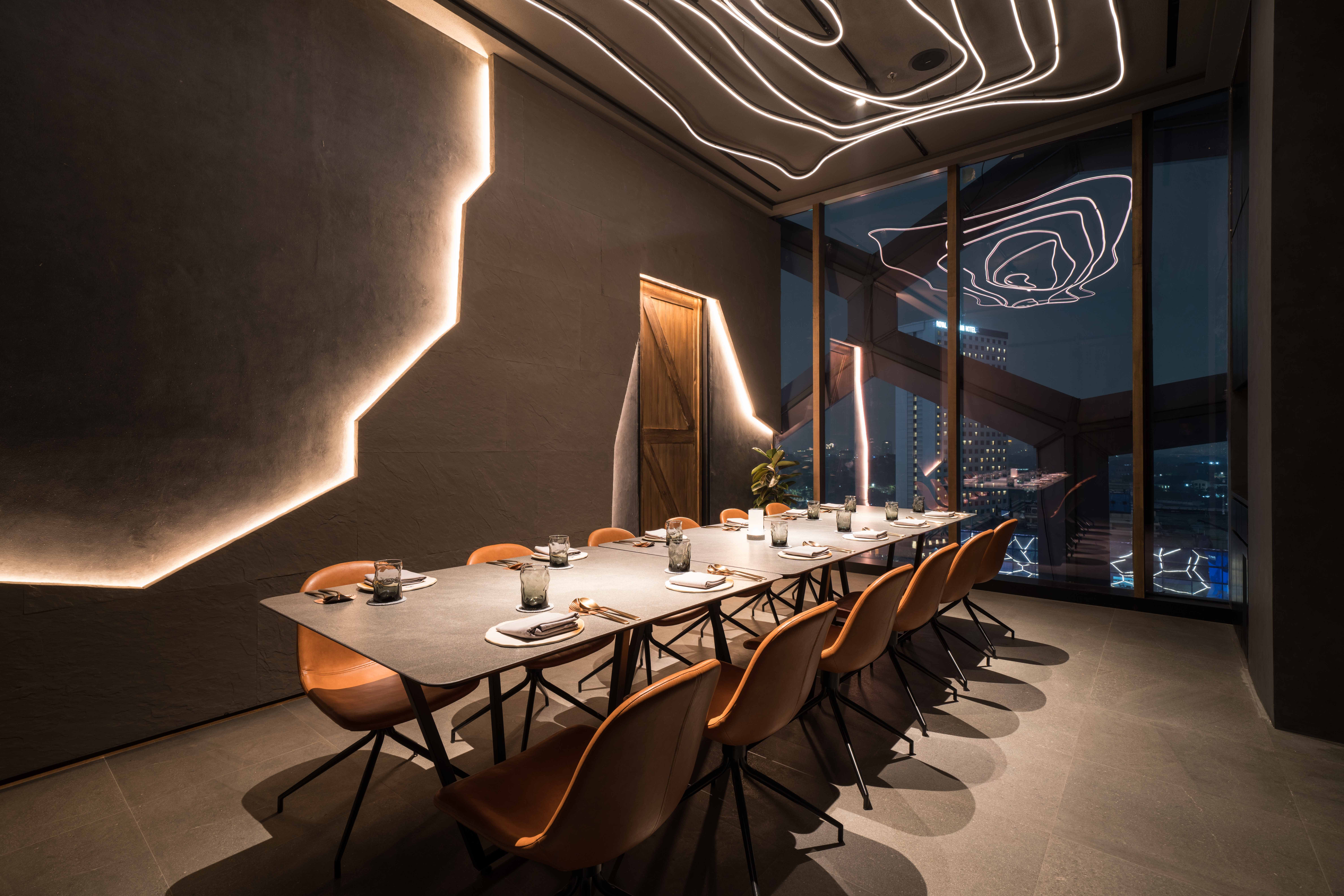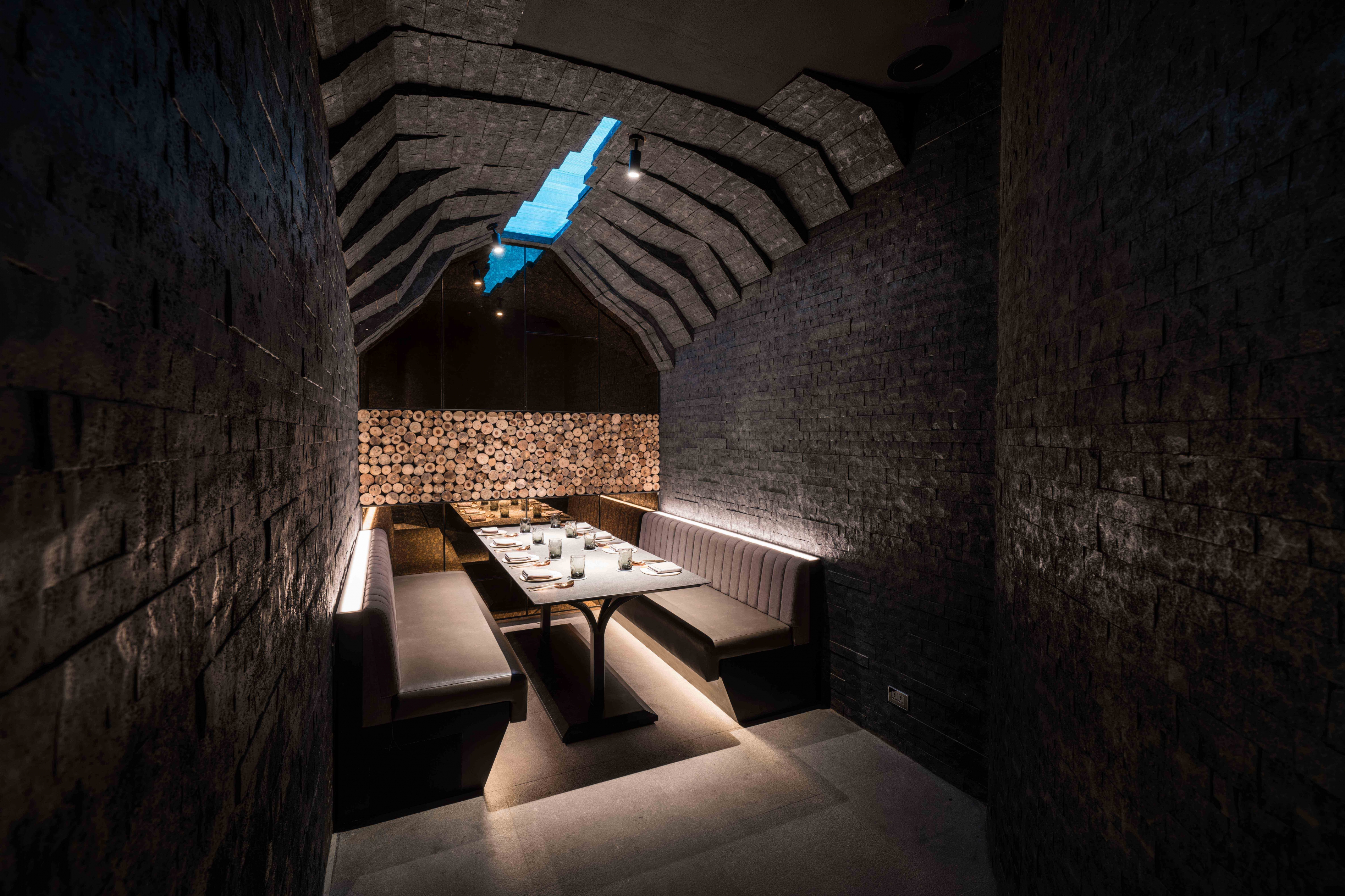 In the VIP room, the atmosphere of the cave is felt from the cracks of the cave in the ceiling with the selection of blue sky, the sun shining on the table by placing the spotlight there.