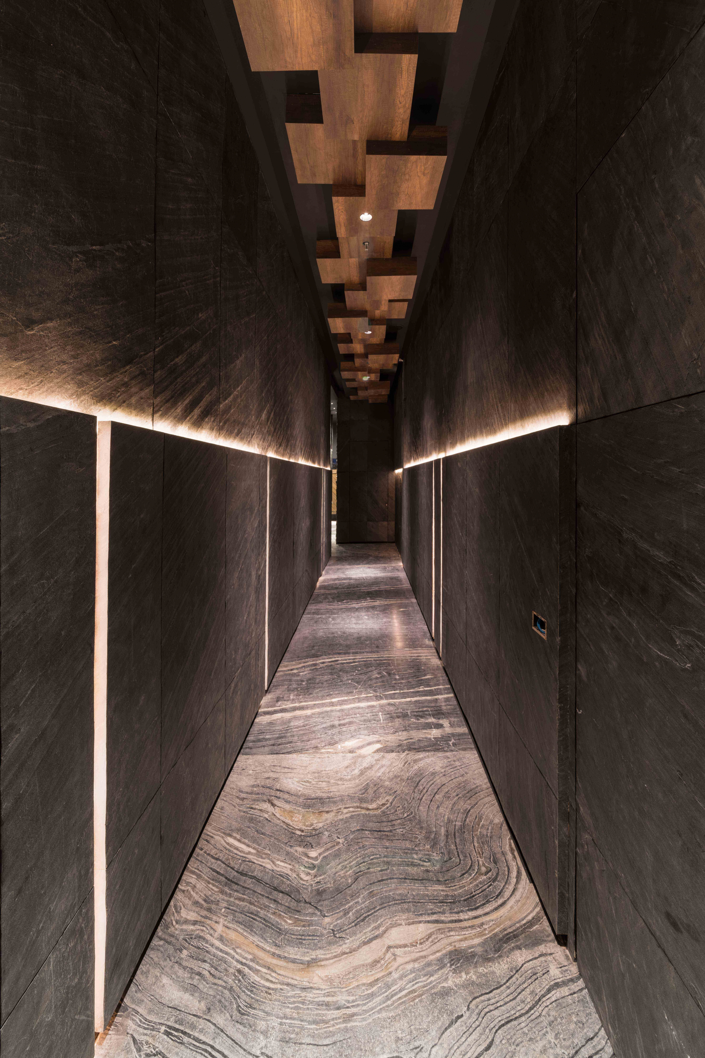 Gradations of navy blue to forest green are found in the corridor from the reception area to the main hall. The concept of sky clouds is produced from fluorescent waves of lights.
