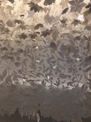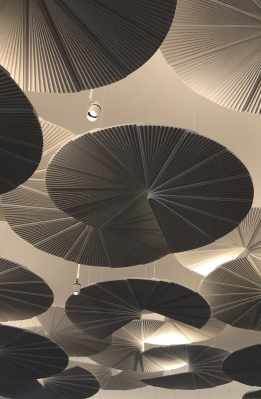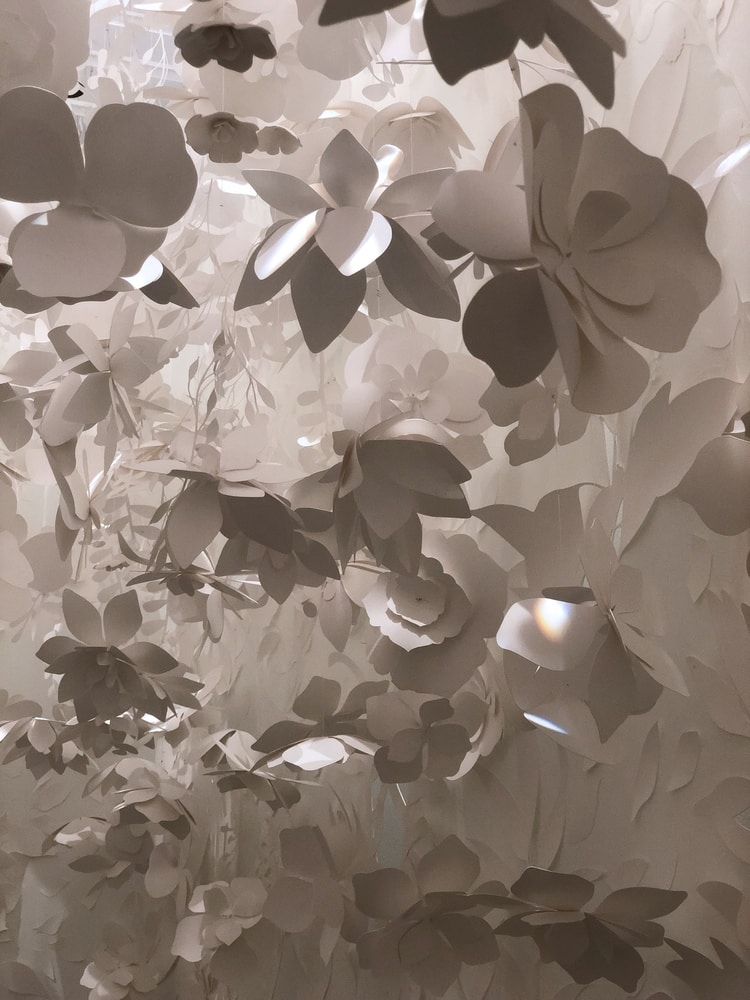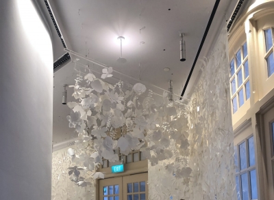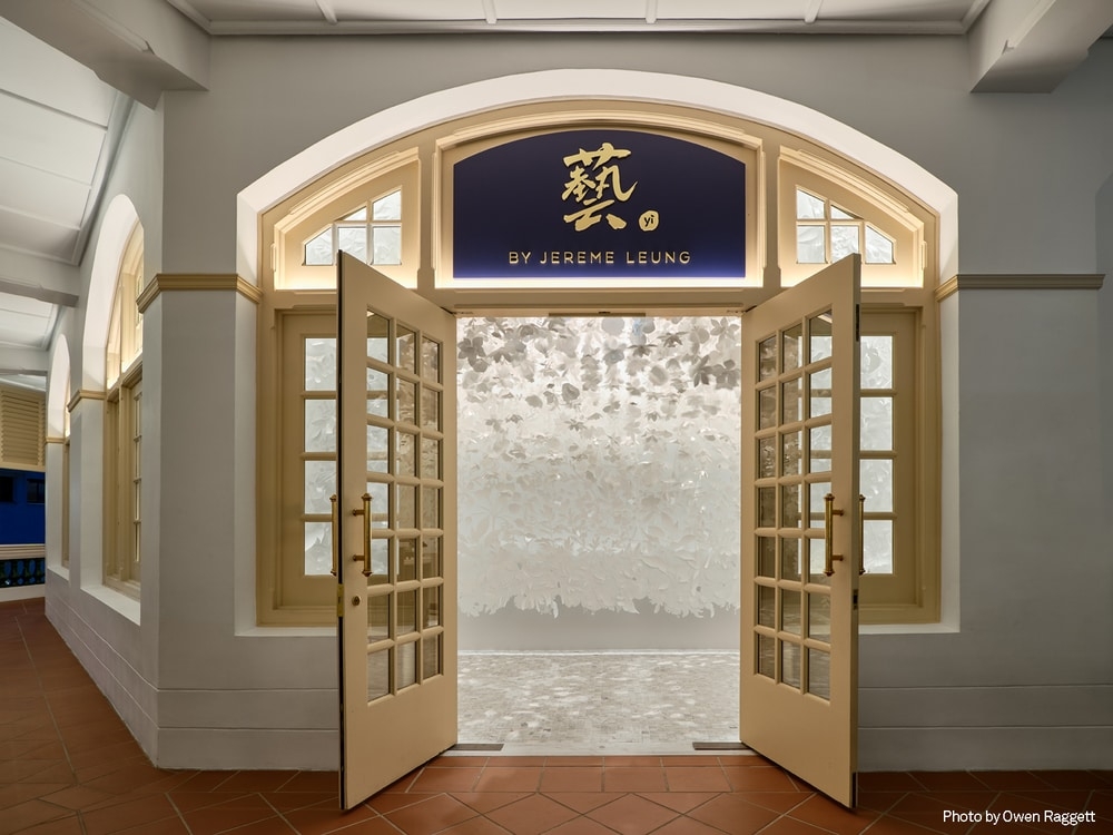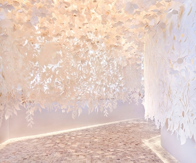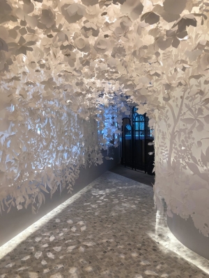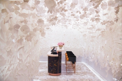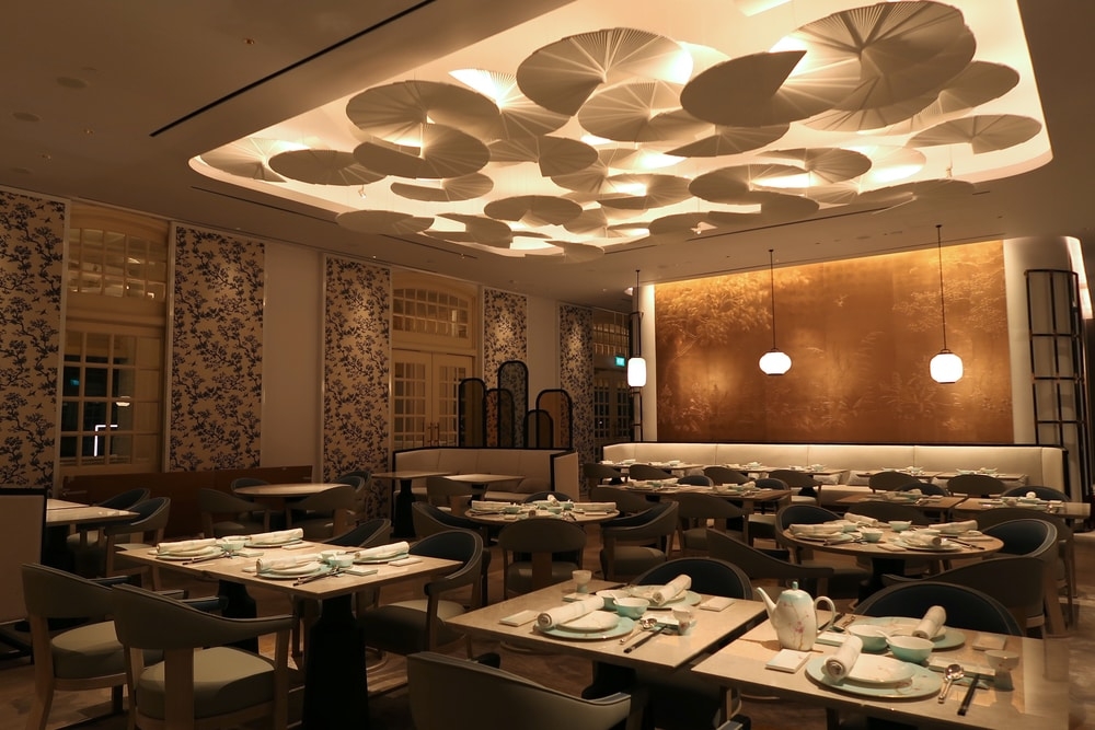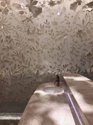 Upon entering, one steps into an ephemeral installation before being ushered into the dining space. Titled ‘Pale Garden’ and inspired by Chinese creation folklore, the installation envelopes a 90 feet long foyer with 1,000 handcrafted flowers. Lighting evokes a mystical forest with multilayers of floral silhouettes and diffused, dappled light. Glare-free fixtures are carefully concealed to preserve the illusion.
