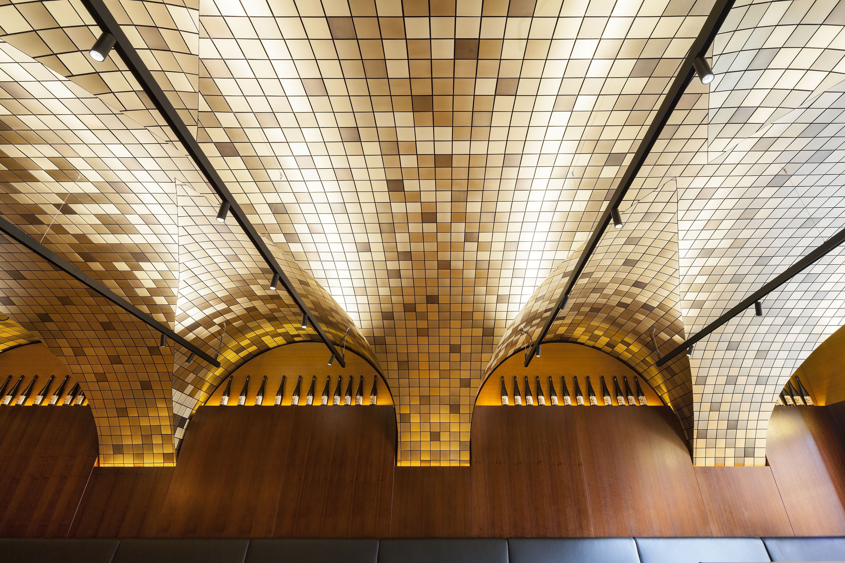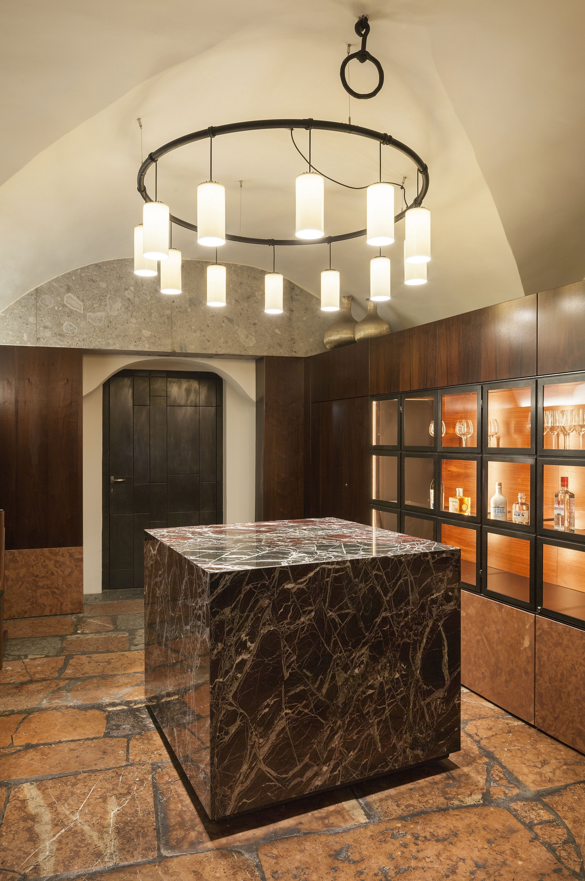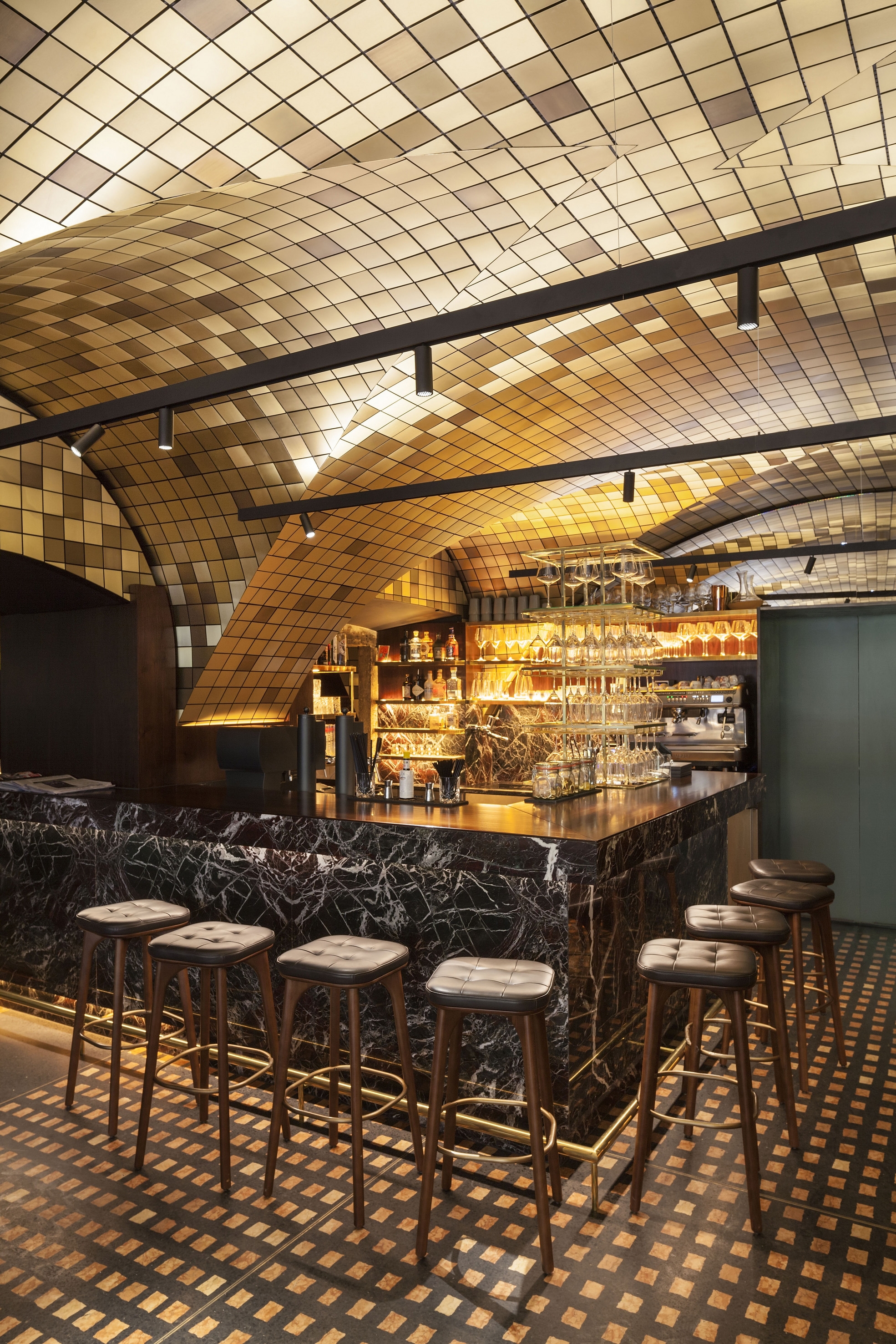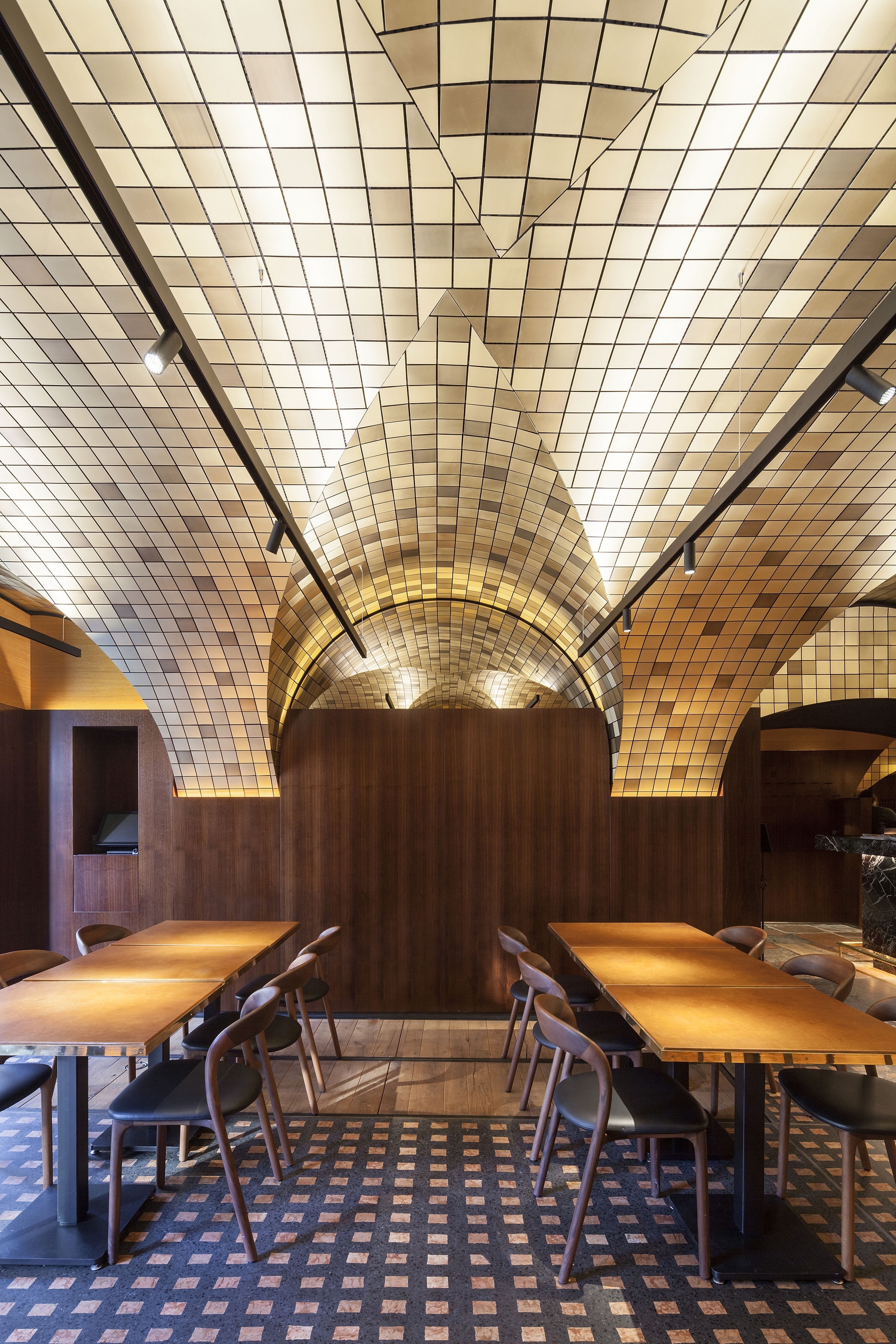 BEHF’s design concept for Koller + Koller am Waagplatz is characterised by a variety of materials and a lively, skilled craftsmanship from Salzburg, Styria and Lower Austria, incorporating metalworks and the use of high quality marble varieties and refined wooden components in traditional ways. As hightlight the entire vaulted ceiling of the ground floor is covered with brass mosaic tiles. Through the lighting the ceiling looks like a golden sky.