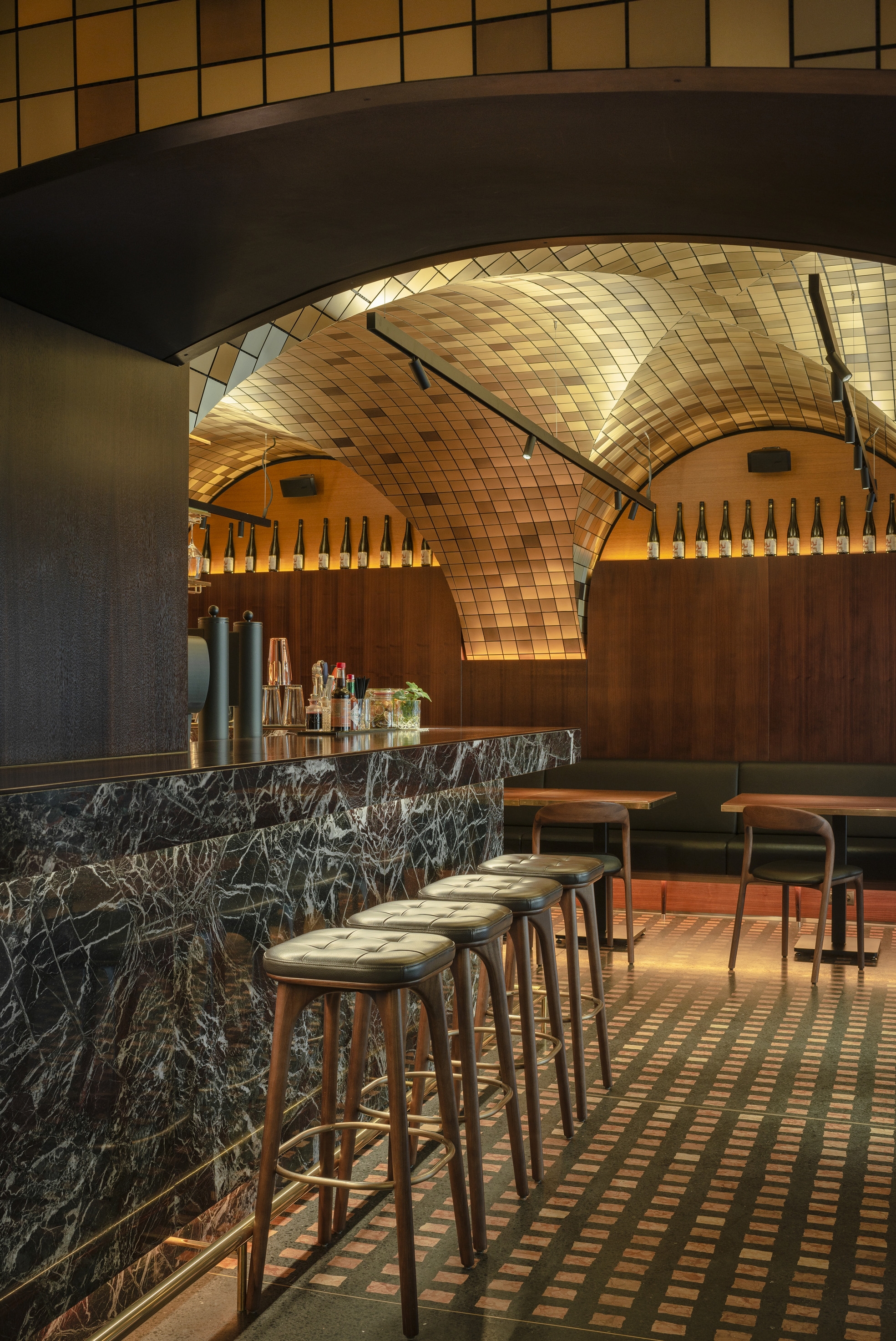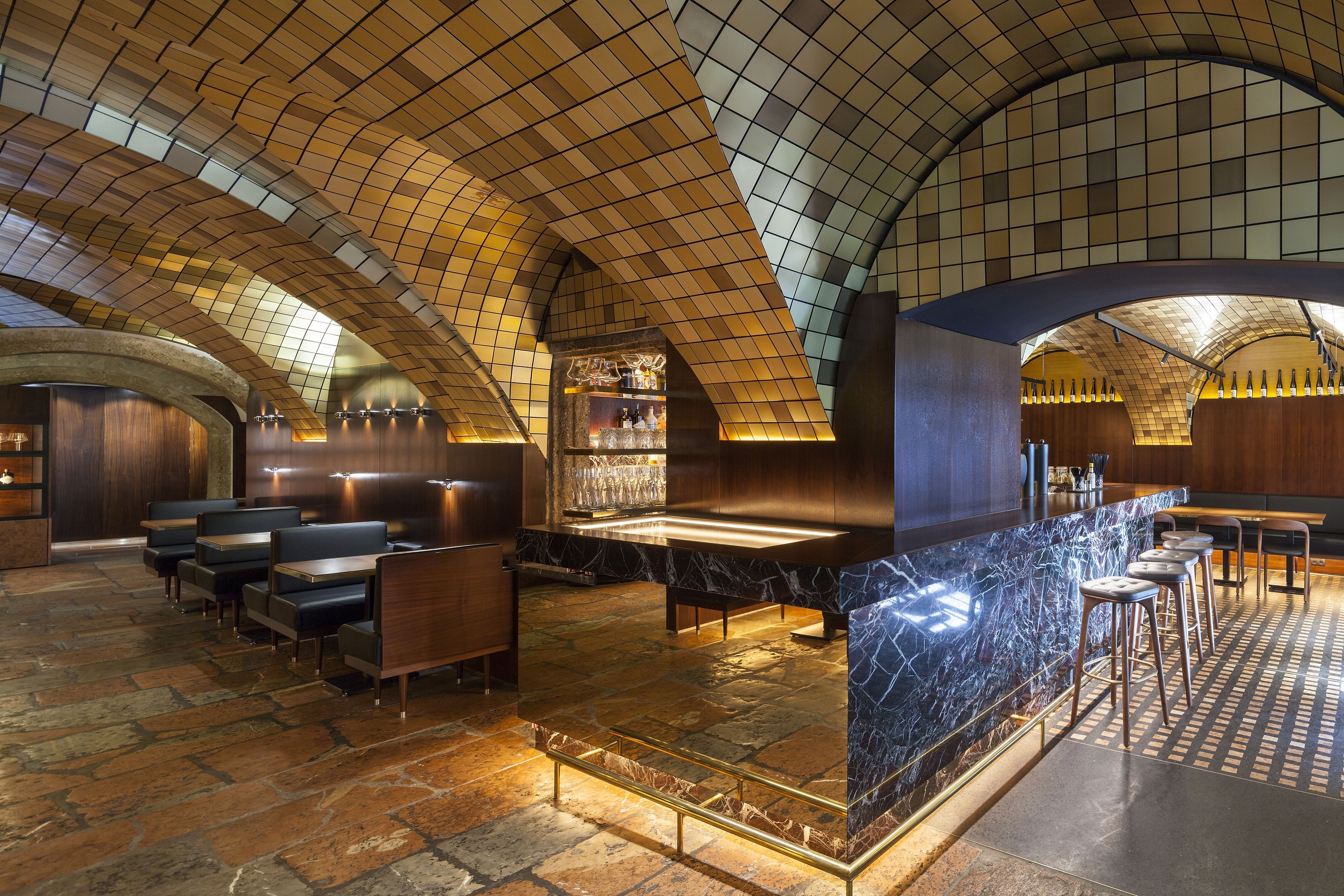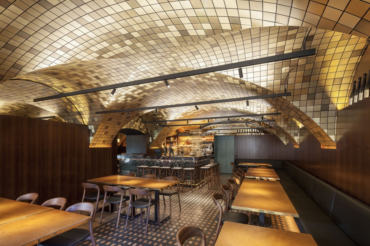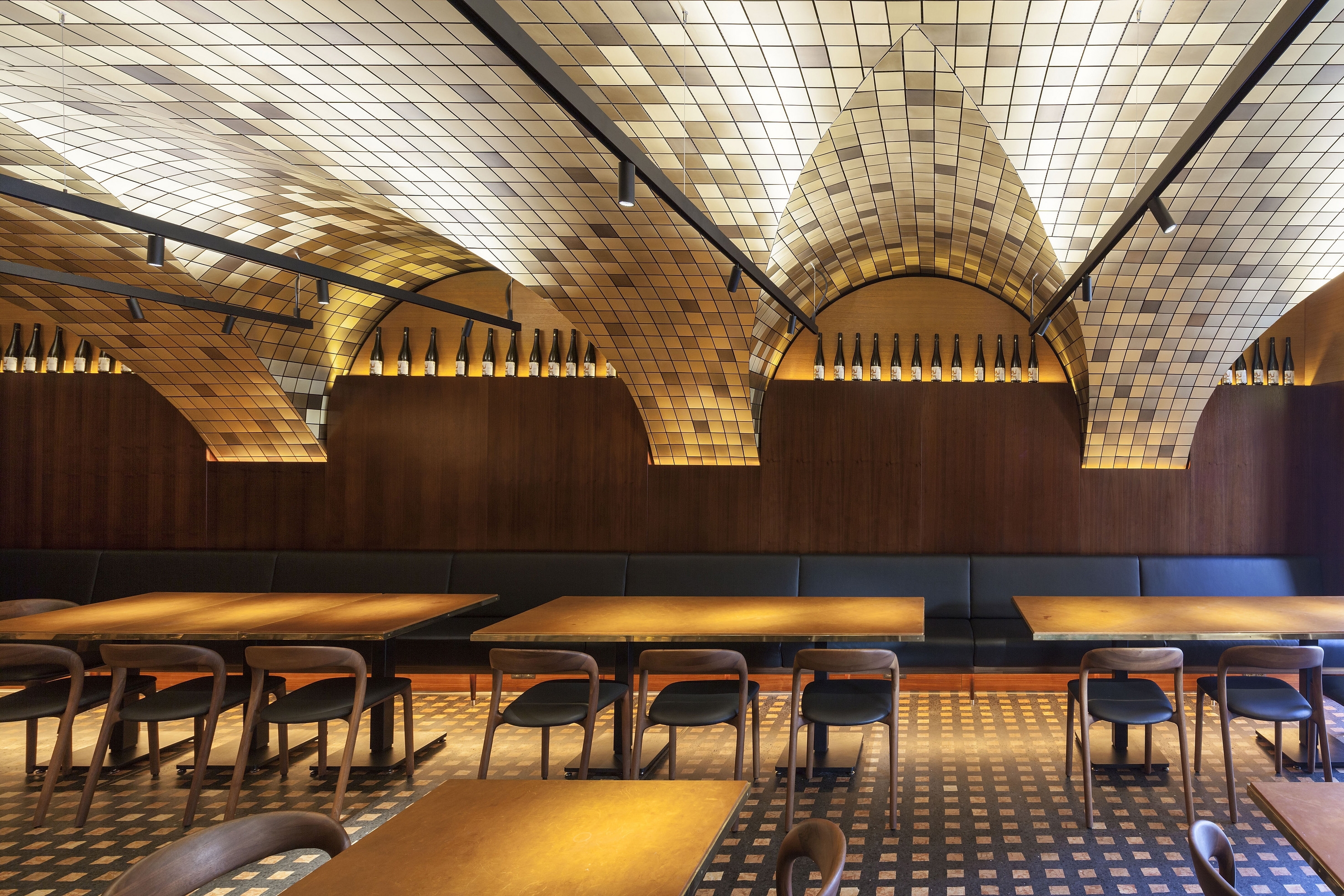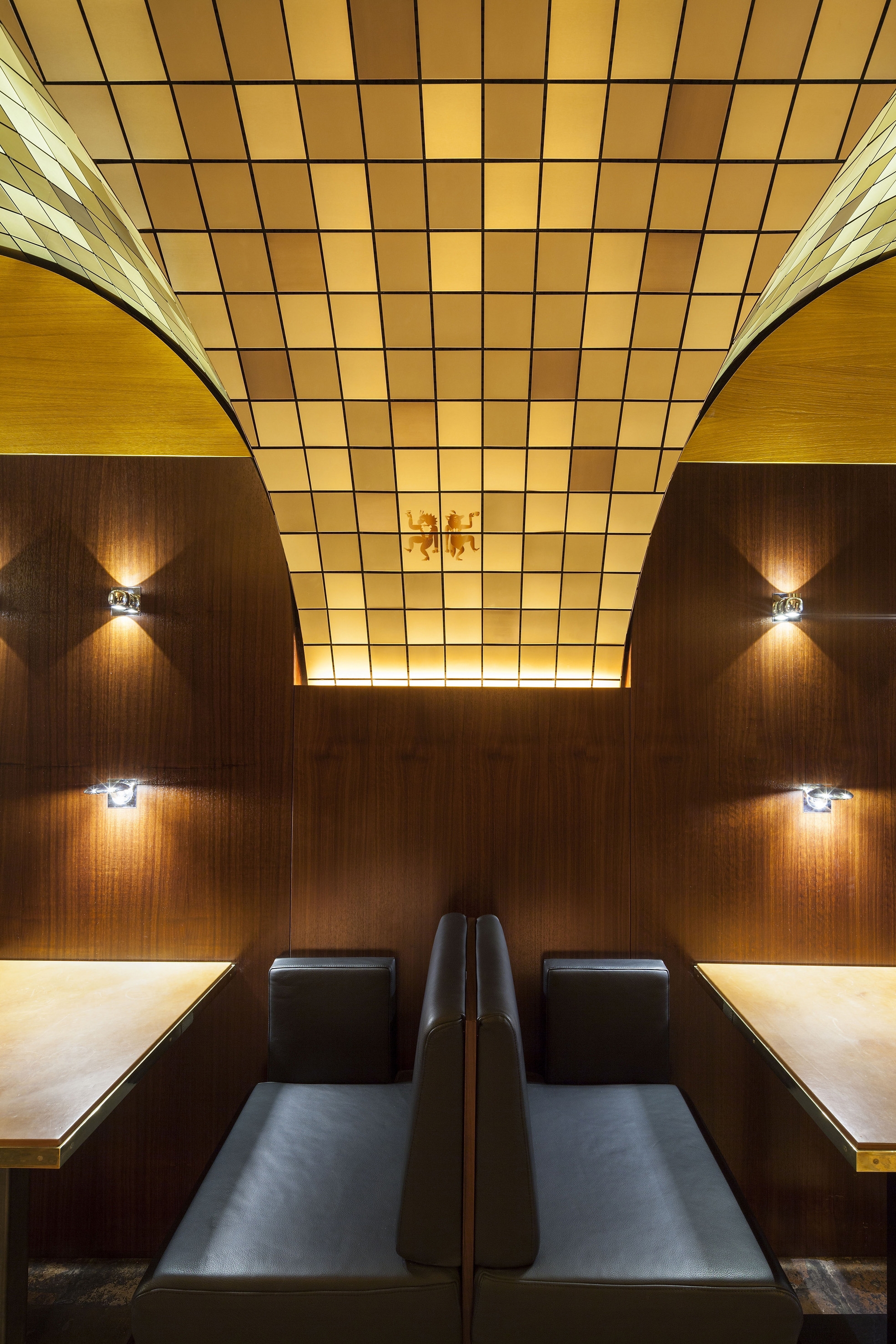 BEHF’s design concept for Koller + Koller am Waagplatz is characterised by a variety of materials and a lively, skilled craftsmanship from Salzburg, Styria and Lower Austria, incorporating metalworks and the use of high quality marble varieties and refined wooden components in traditional ways. As hightlight the entire vaulted ceiling of the ground floor is covered with brass mosaic tiles. Through the lighting the ceiling looks like a golden sky.