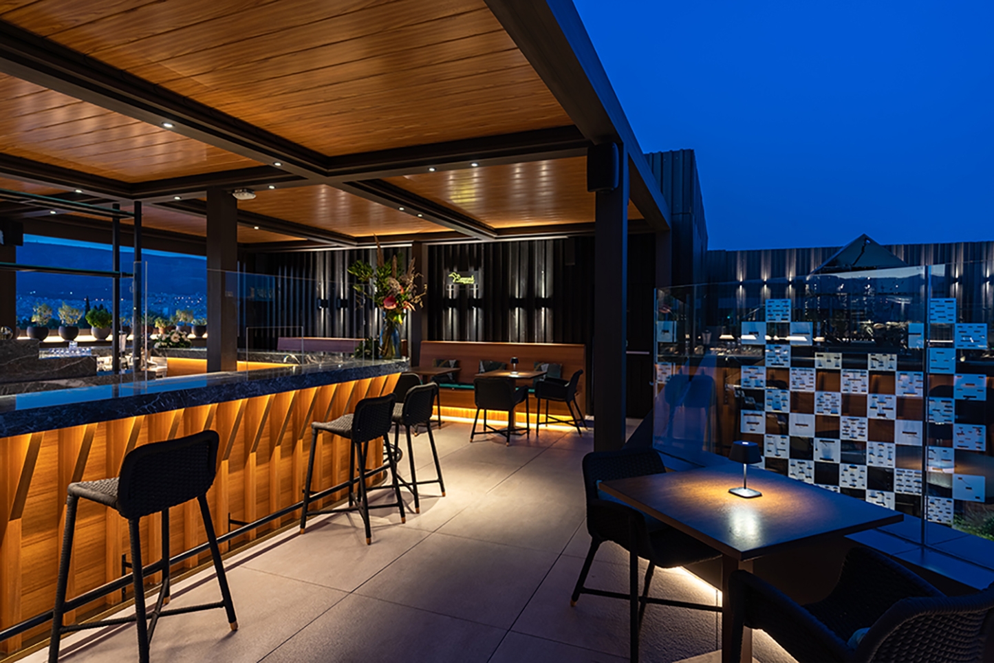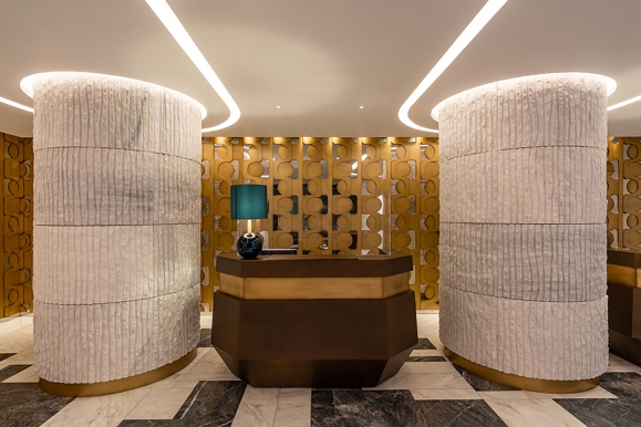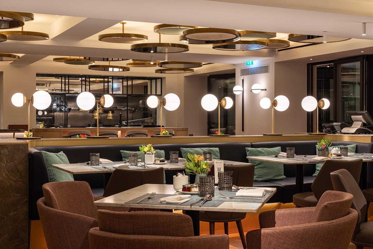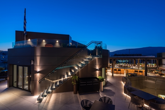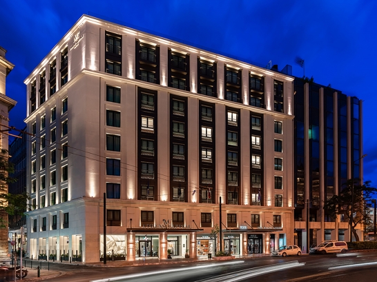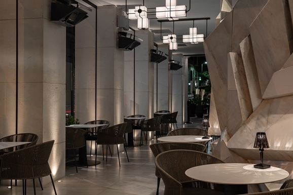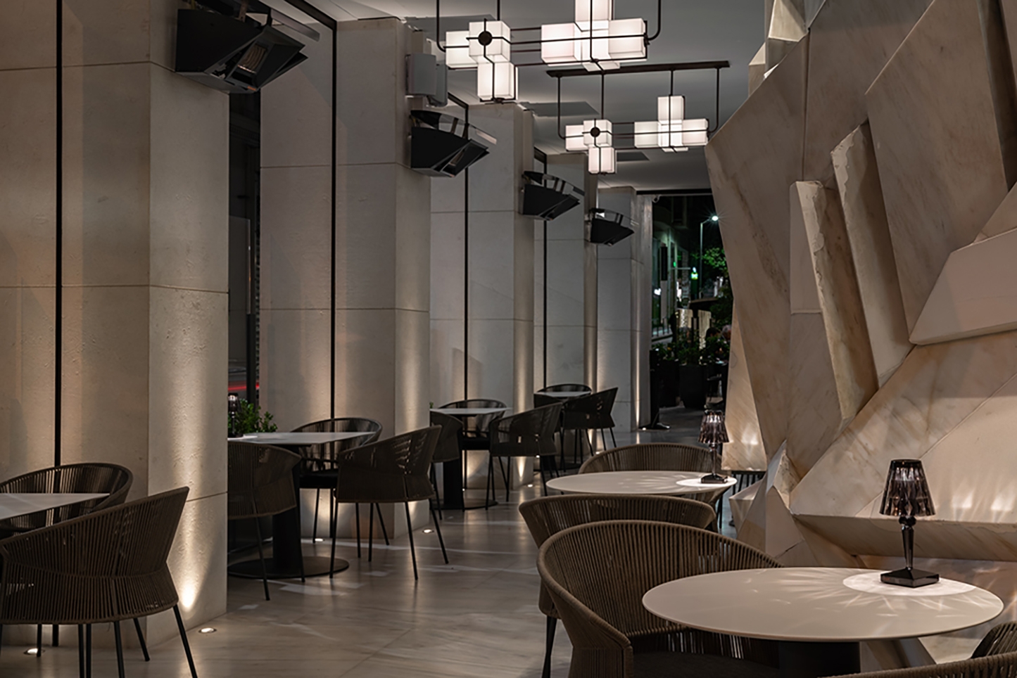Entry DescriptionAthens Capital Centre Hotel is located in the heart of Athens with a unique identity. The hotel brings a tasteful yet understated level of design finesse which adds to this cosmopolitan and vibrant city. Lighting Design International was commissioned to provide a fresh yet homely approach highlighting its elegant interiors by MKV Design. Balance is created through the layers of light, while the unique and distinctive atmospheres in each space create drama. Guests are welcomed by a warm and vibrantly uplit façade and an arcade containing the Gallerie Café. The Café incorporates an abstract marble relief on the inner perimeter wall. This element is enhanced by accent lights that emphasise the form and texture by using light and shade. The marble wall is an introduction to the excellent blend of art and architecture that is experienced throughout the hotel. The main challenge within the main restaurant was to provide accent lighting to the tables without lighting the decorative pendants. From the outset, it is essential to agree on the overall colour temperature of the white light for the space. For hotels and residences, we usually adopt a warm palette ranging from 2200K to 2700K.
