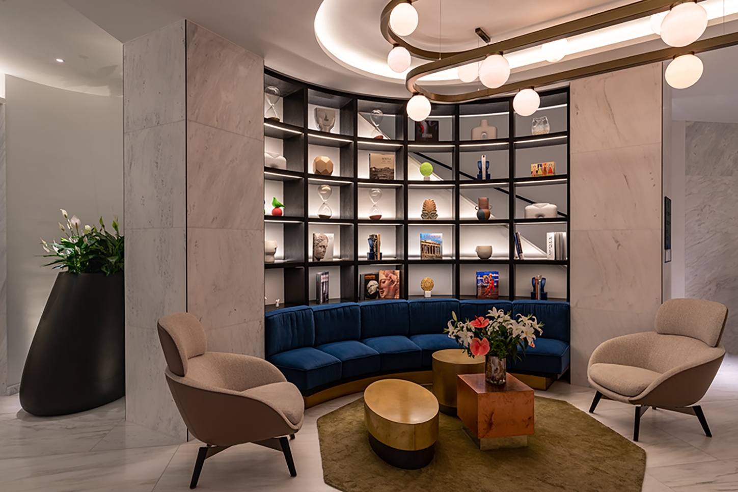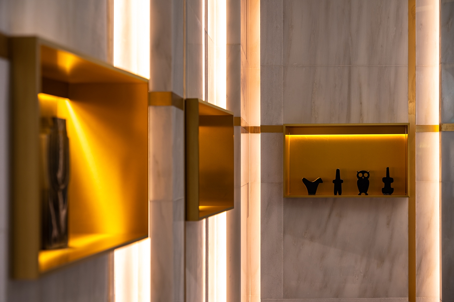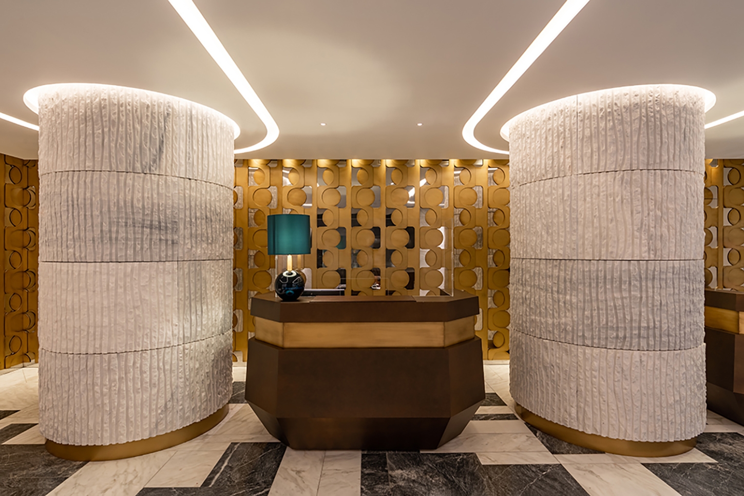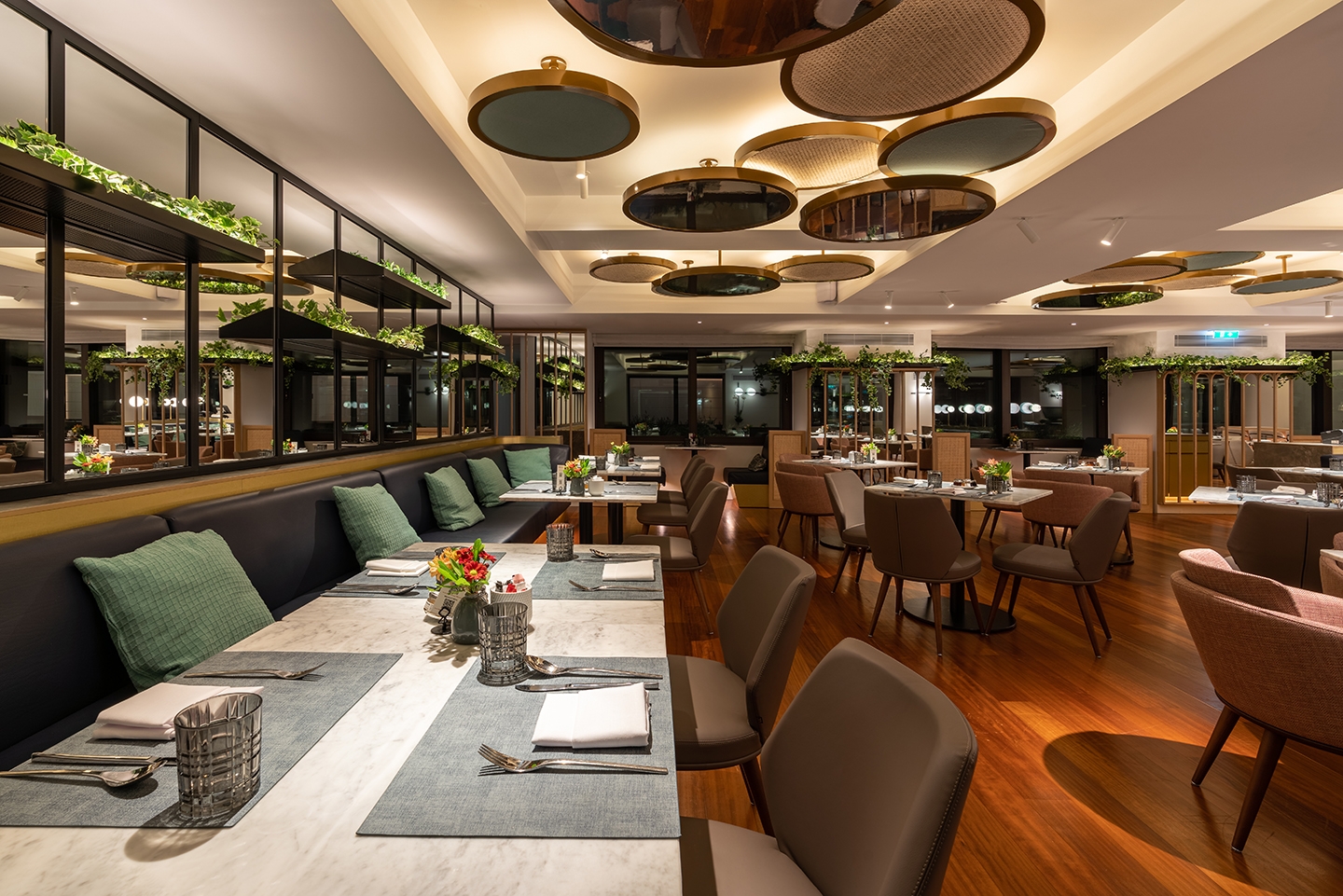 Entry DescriptionAthens Capital Centre Hotel is located in the heart of Athens with a unique identity. The hotel brings a tasteful yet understated level of design finesse which adds to this cosmopolitan and vibrant city. Lighting Design International was commissioned to provide a fresh yet homely approach highlighting its elegant interiors by MKV Design. Balance is created through the layers of light, while the unique and distinctive atmospheres in each space create drama. Guests are welcomed by a warm and vibrantly uplit façade and an arcade containing the Gallerie Café. The Café incorporates an abstract marble relief on the inner perimeter wall. This element is enhanced by accent lights that emphasise the form and texture by using light and shade. The marble wall is an introduction to the excellent blend of art and architecture that is experienced throughout the hotel. The main challenge within the main restaurant was to provide accent lighting to the tables without lighting the decorative pendants. From the outset, it is essential to agree on the overall colour temperature of the white light for the space. For hotels and residences, we usually adopt a warm palette ranging from 2200K to 2700K.