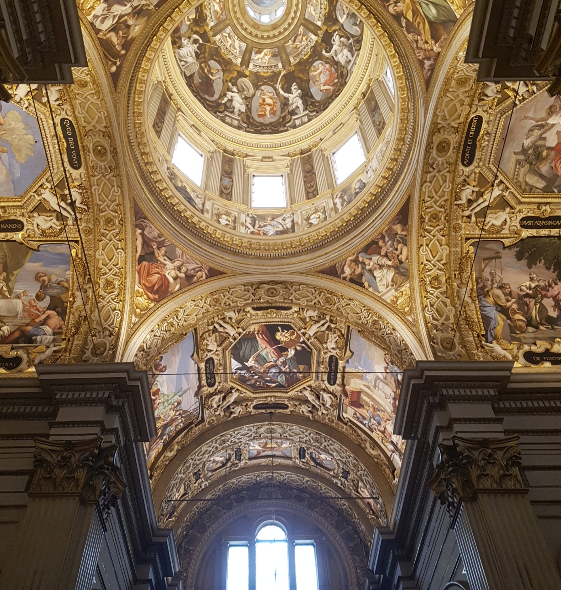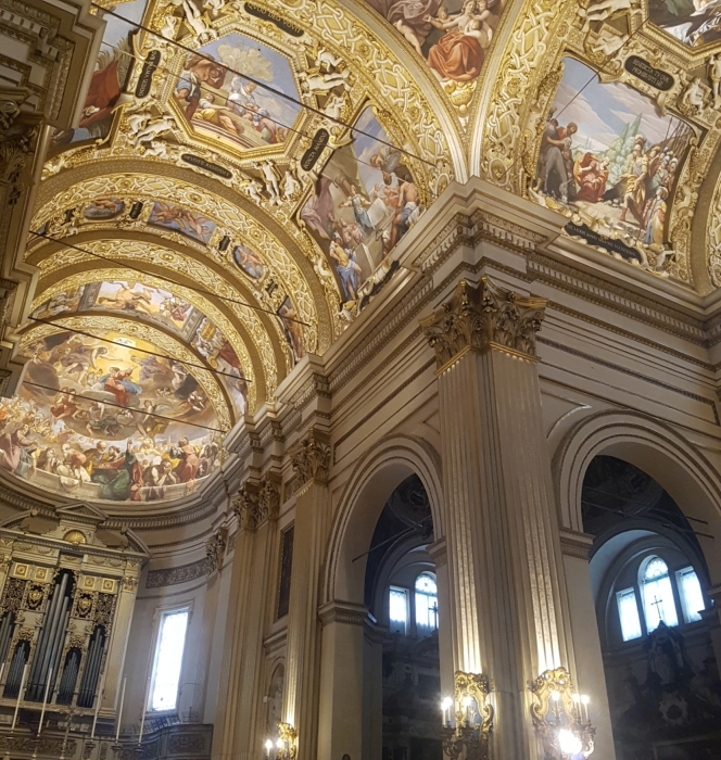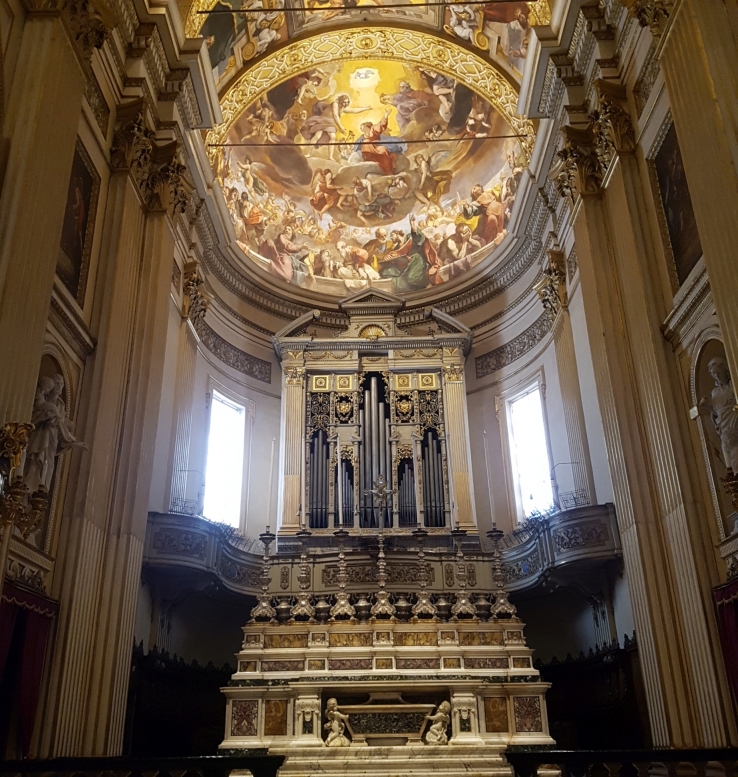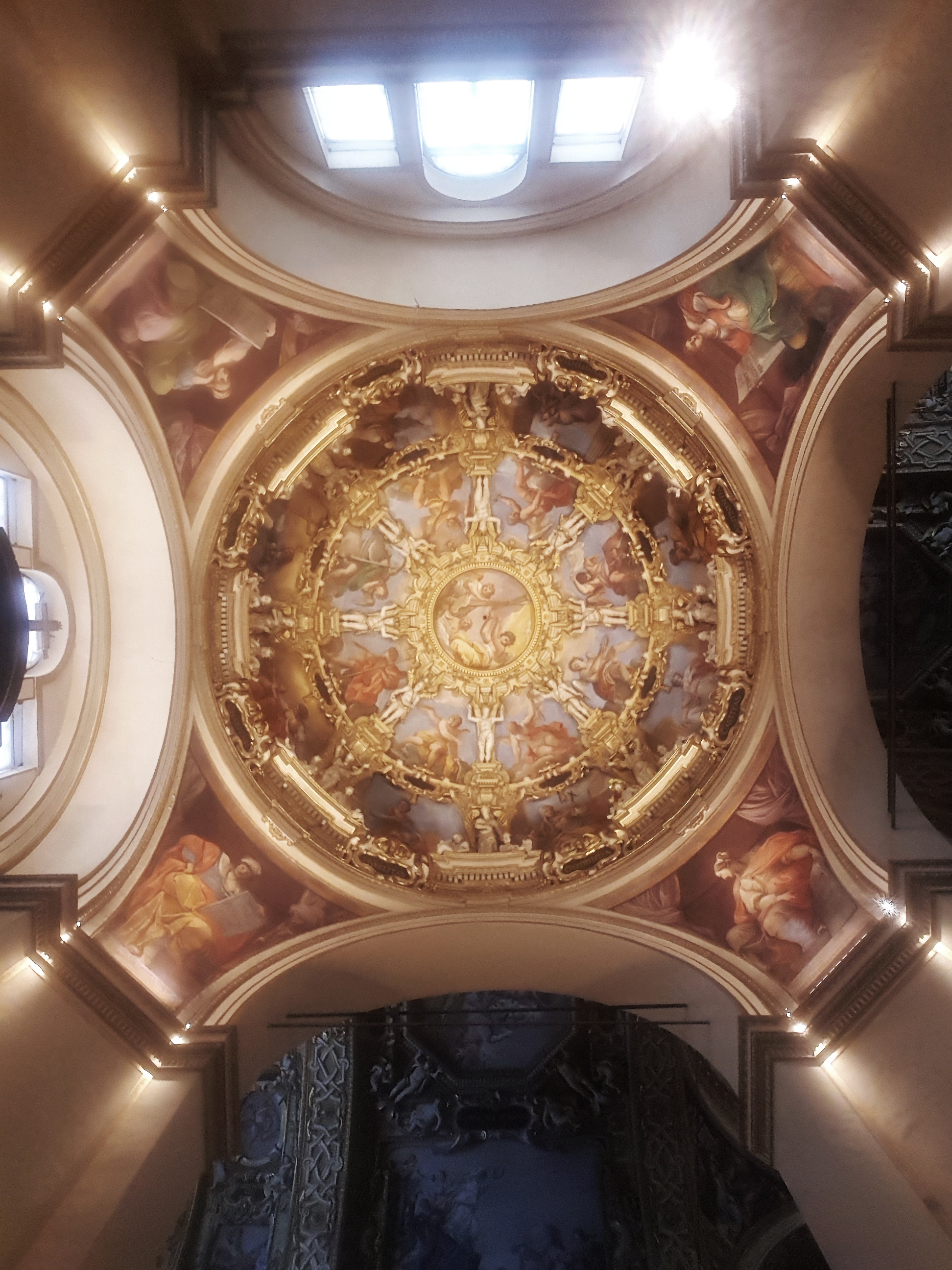 The interior, in the style of the late Renaissance, is striking for the richness of the marbles and the sumptuous frescoes