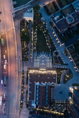 In creating visual contrast between old and new, lighting for the contemporary hotel tower and landscaping was kept understated and chic, while the historical facade lighting amplified richness, tactility and the play of shadows.