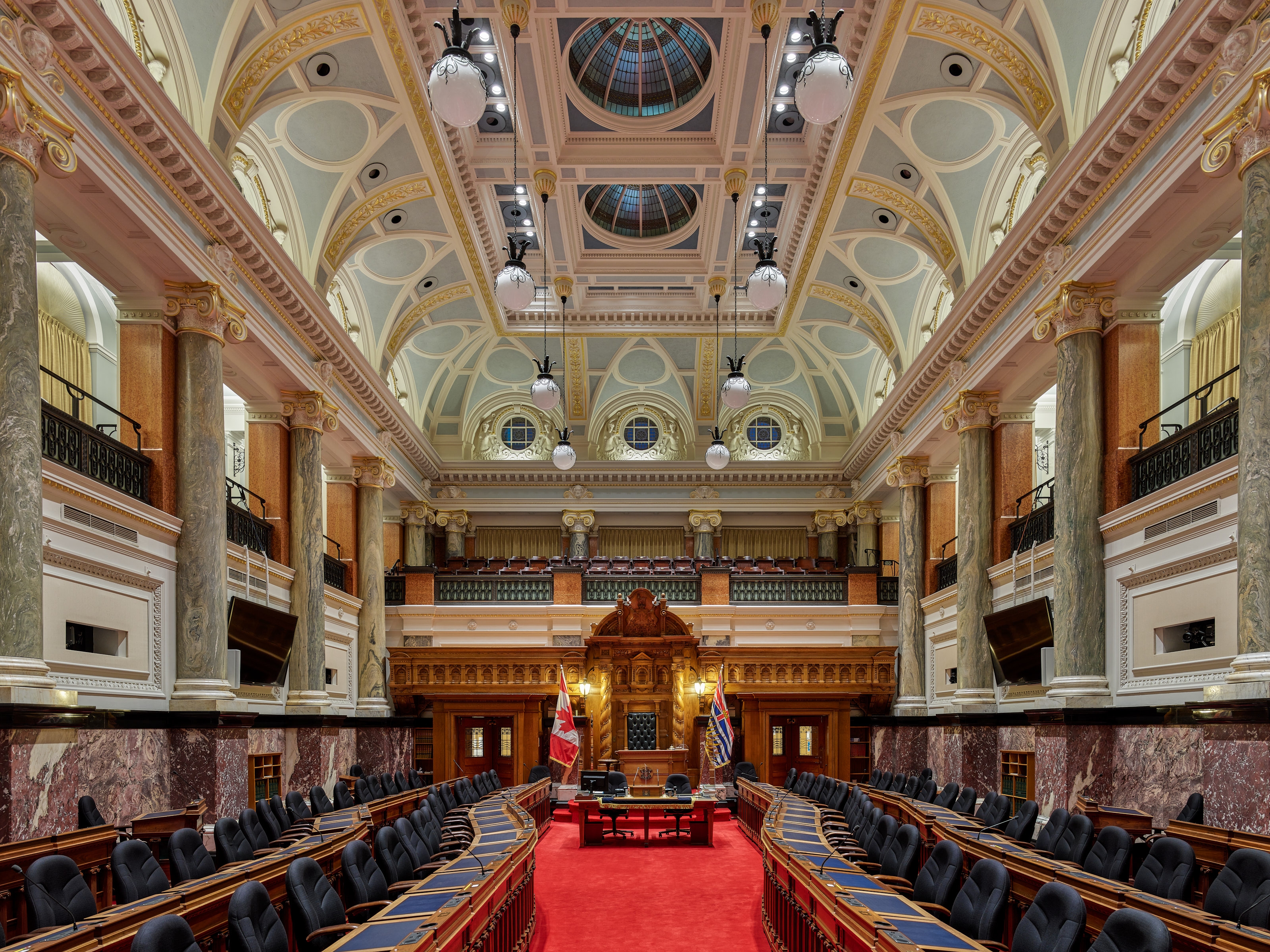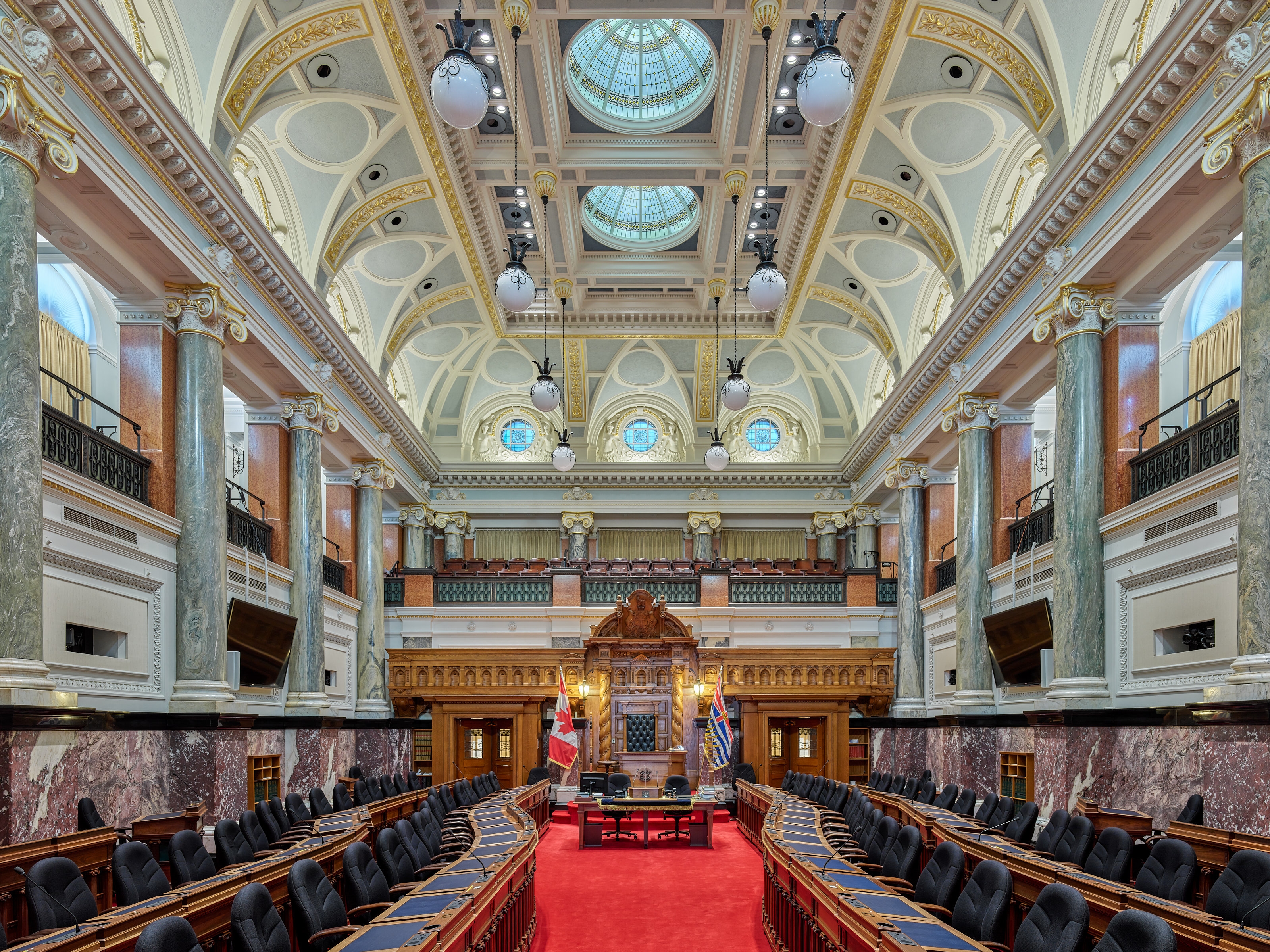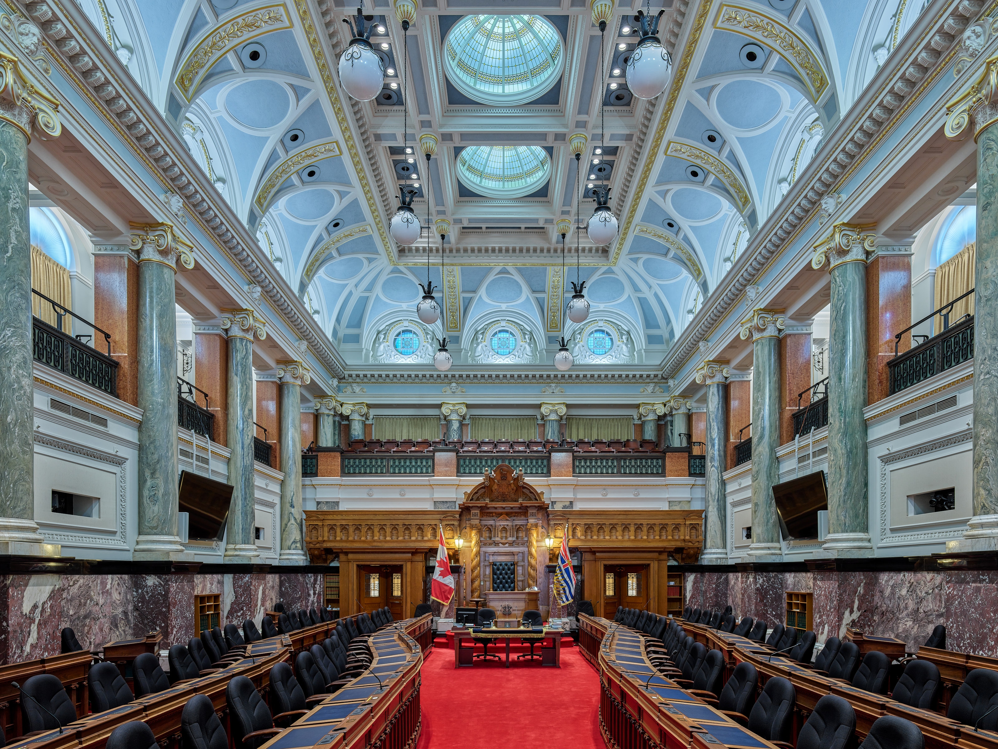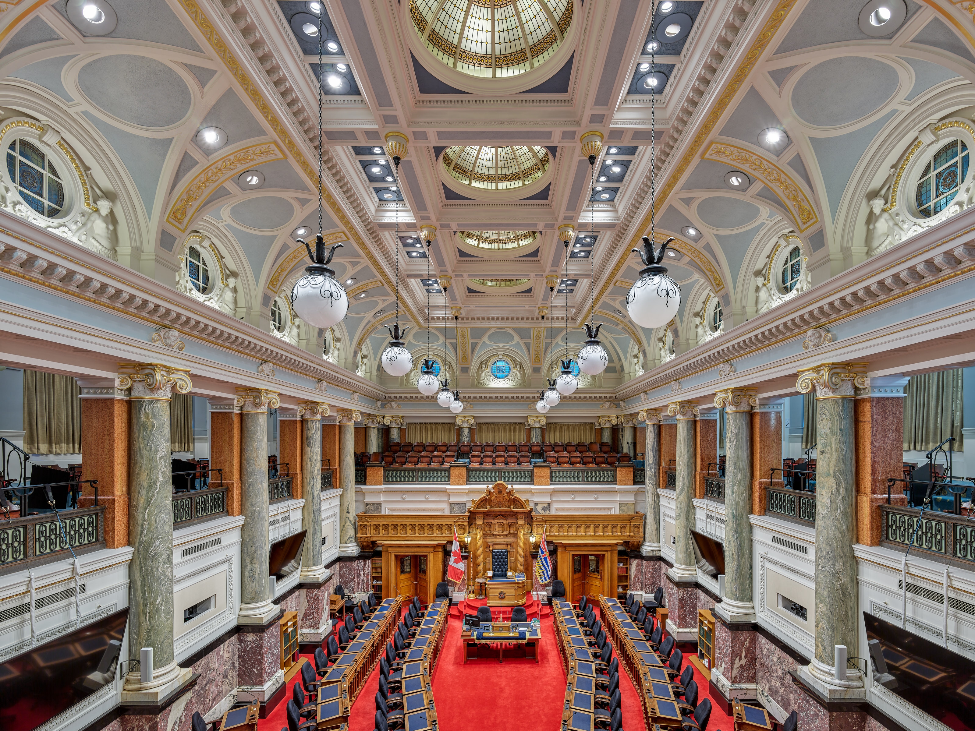 Entry DescriptionThe Legislative Chamber’s 1970’s lighting system consisted of halogen and fluorescent fixtures. The system upgrade was constrained by the need for strict adherence to the energy code and the goals of decreasing utility costs, improving flexibility, and maintaining the heritage architecture.