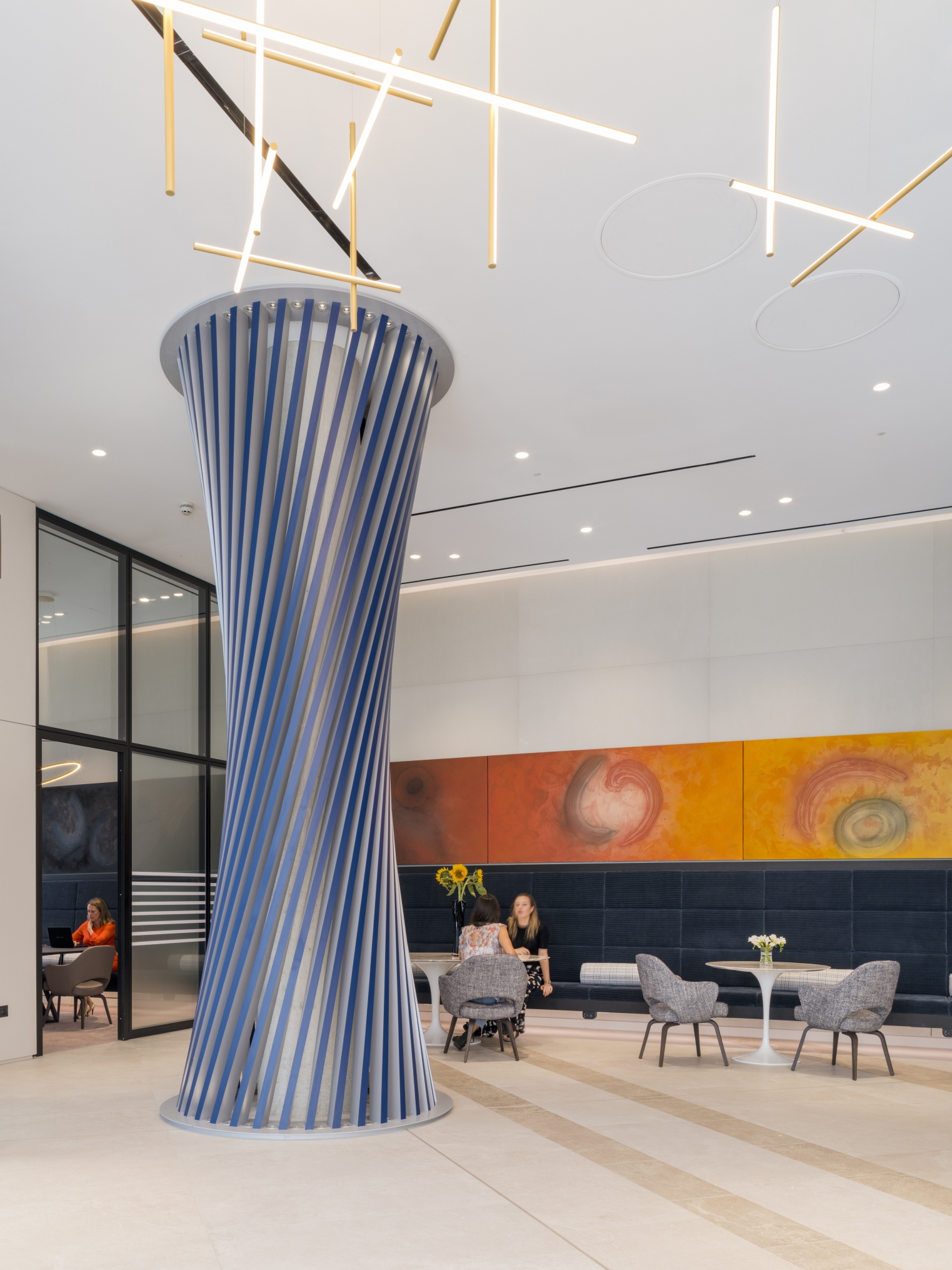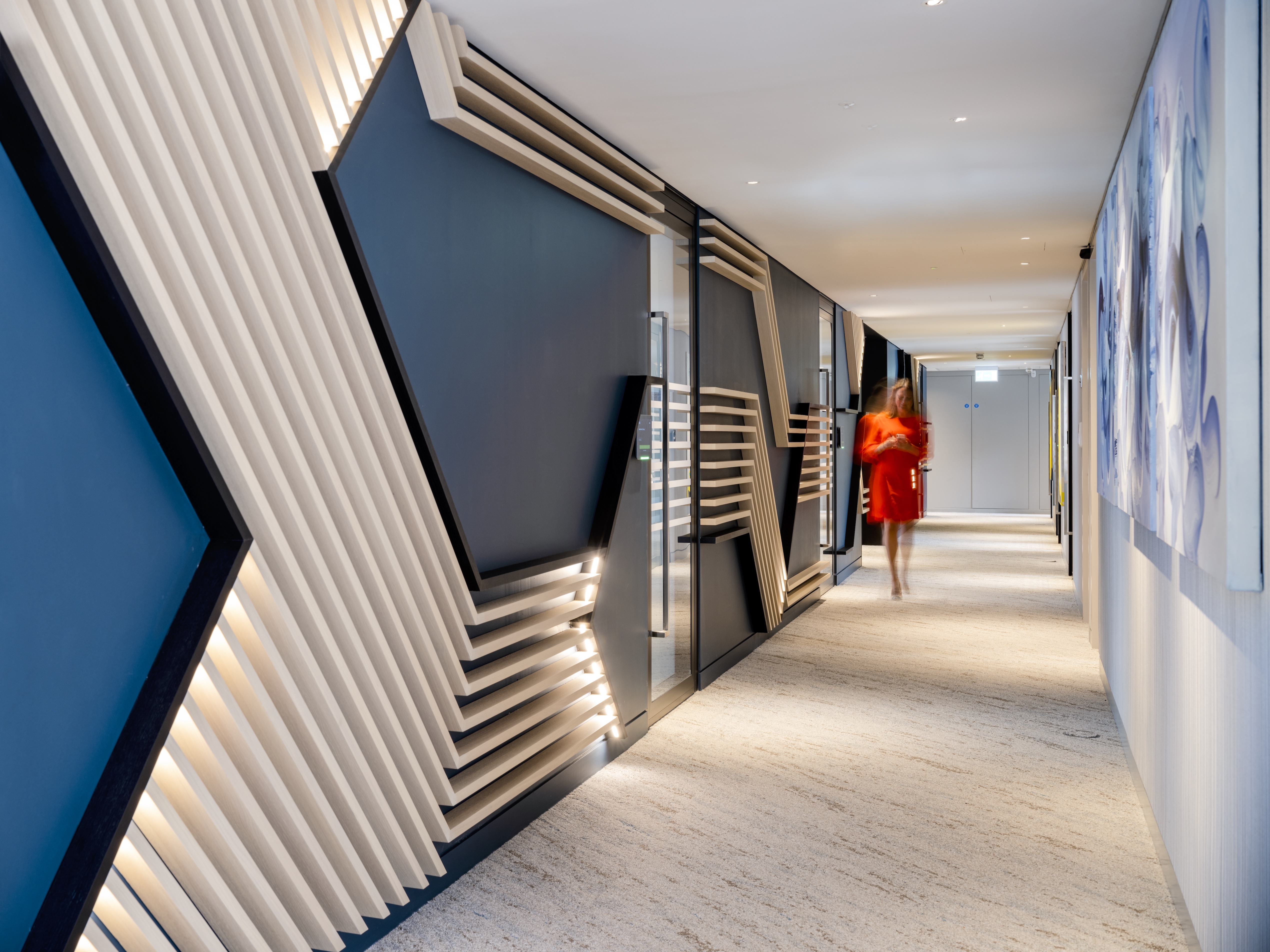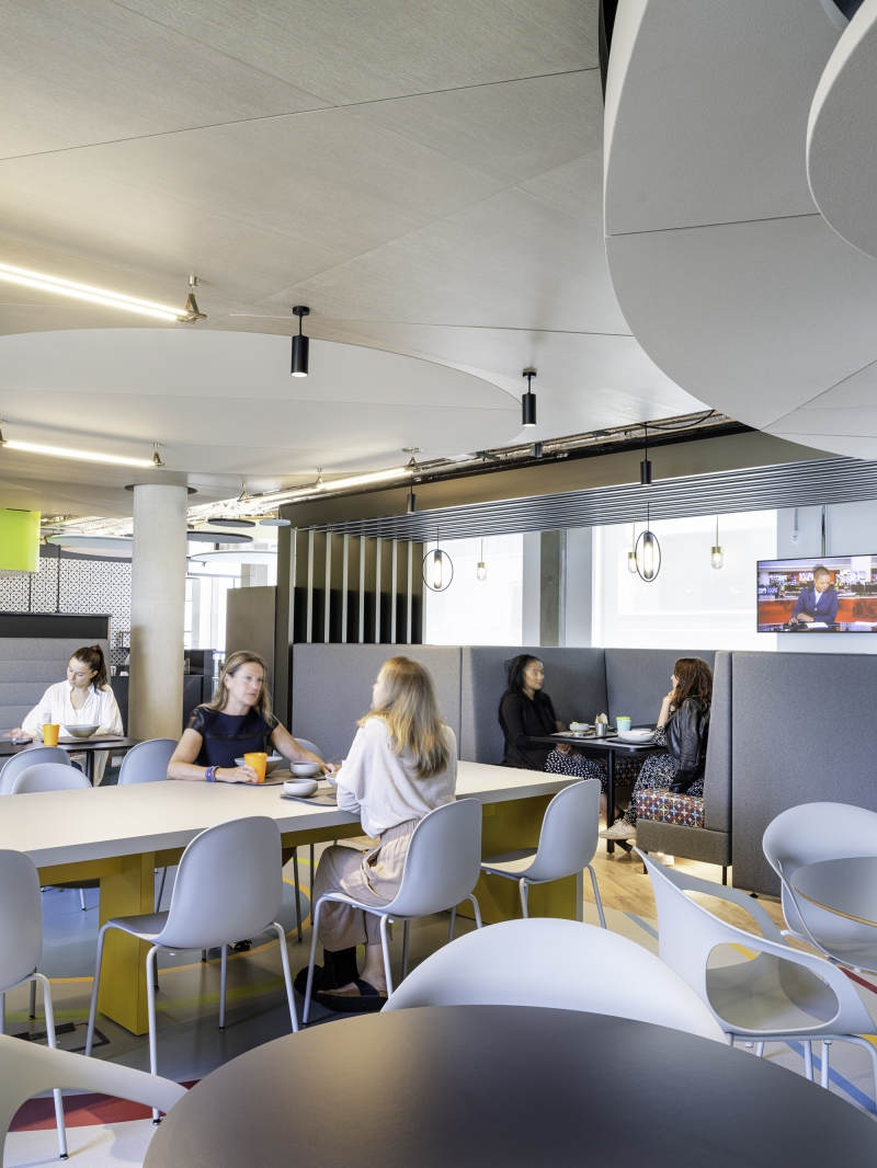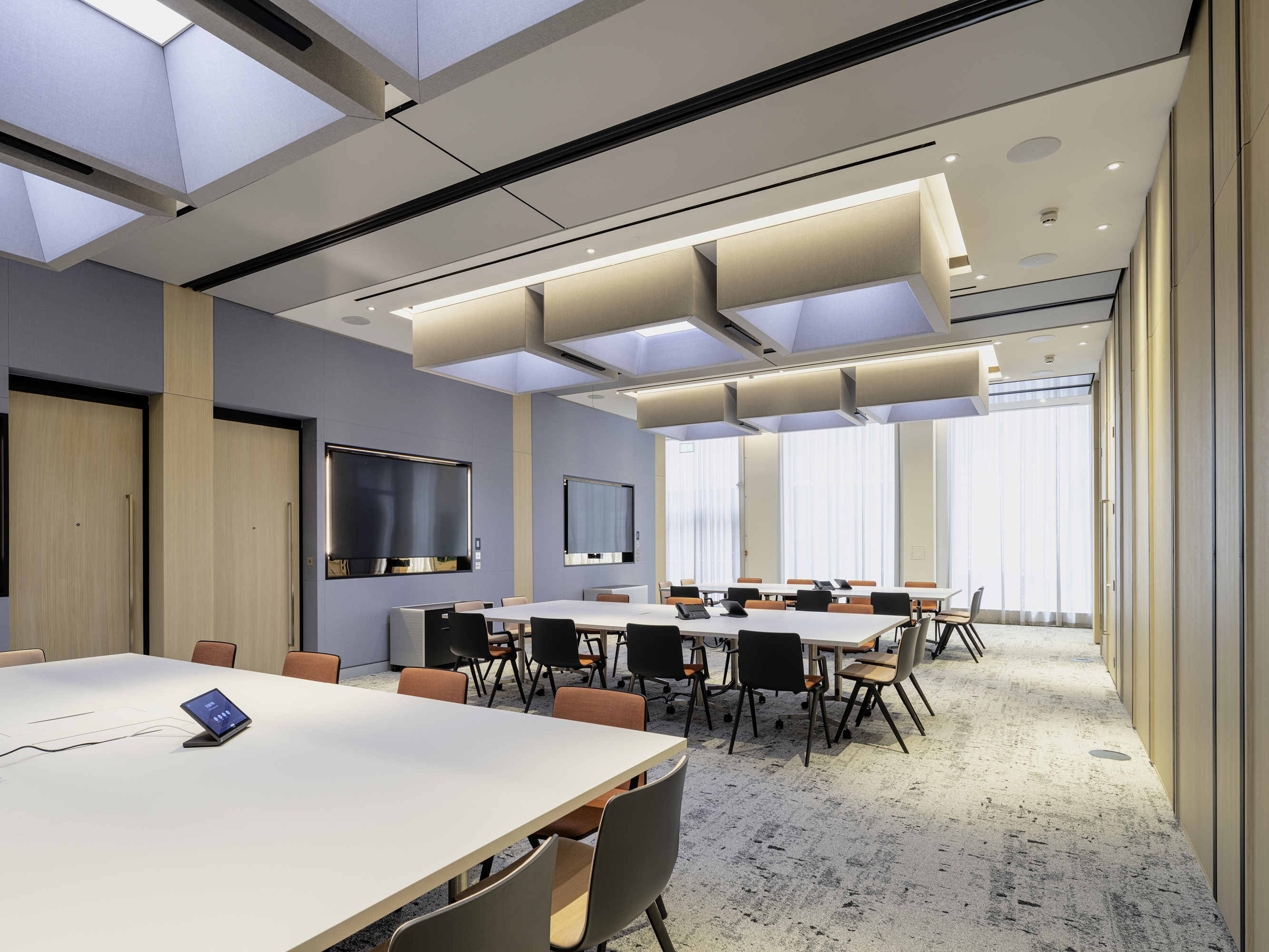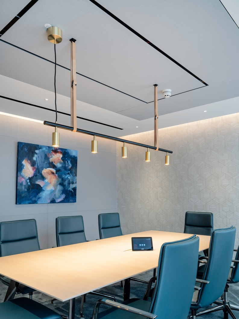One outstanding feature is the statement chandelier in reception in which horizontal and vertical linear lights strike a balance between architectural and ambient lighting and provide a visual pathway into the building. Another is illuminated ceiling panels tuned to a cycle that mimics the changing colour temperature of daylight, helping to balance the circadian rhythms of people attending all-day meetings in areas devoid of natural light.