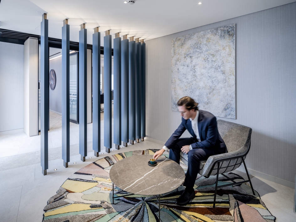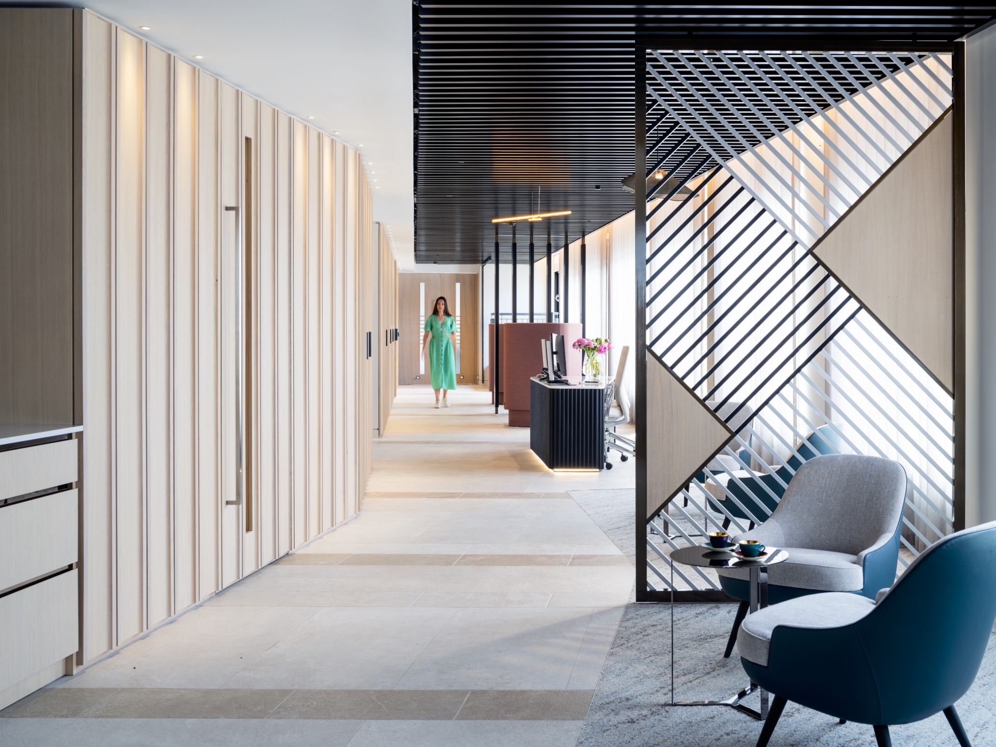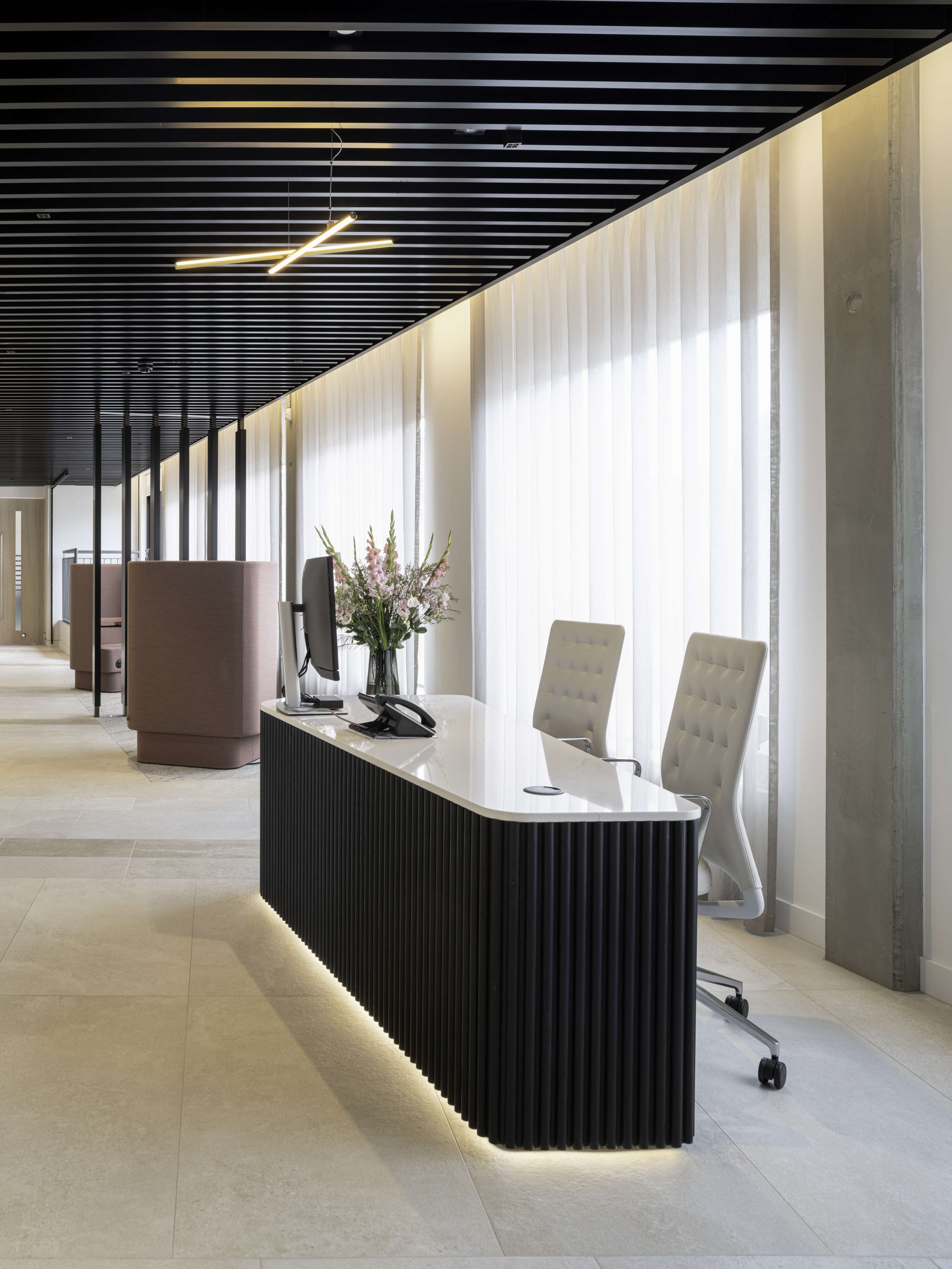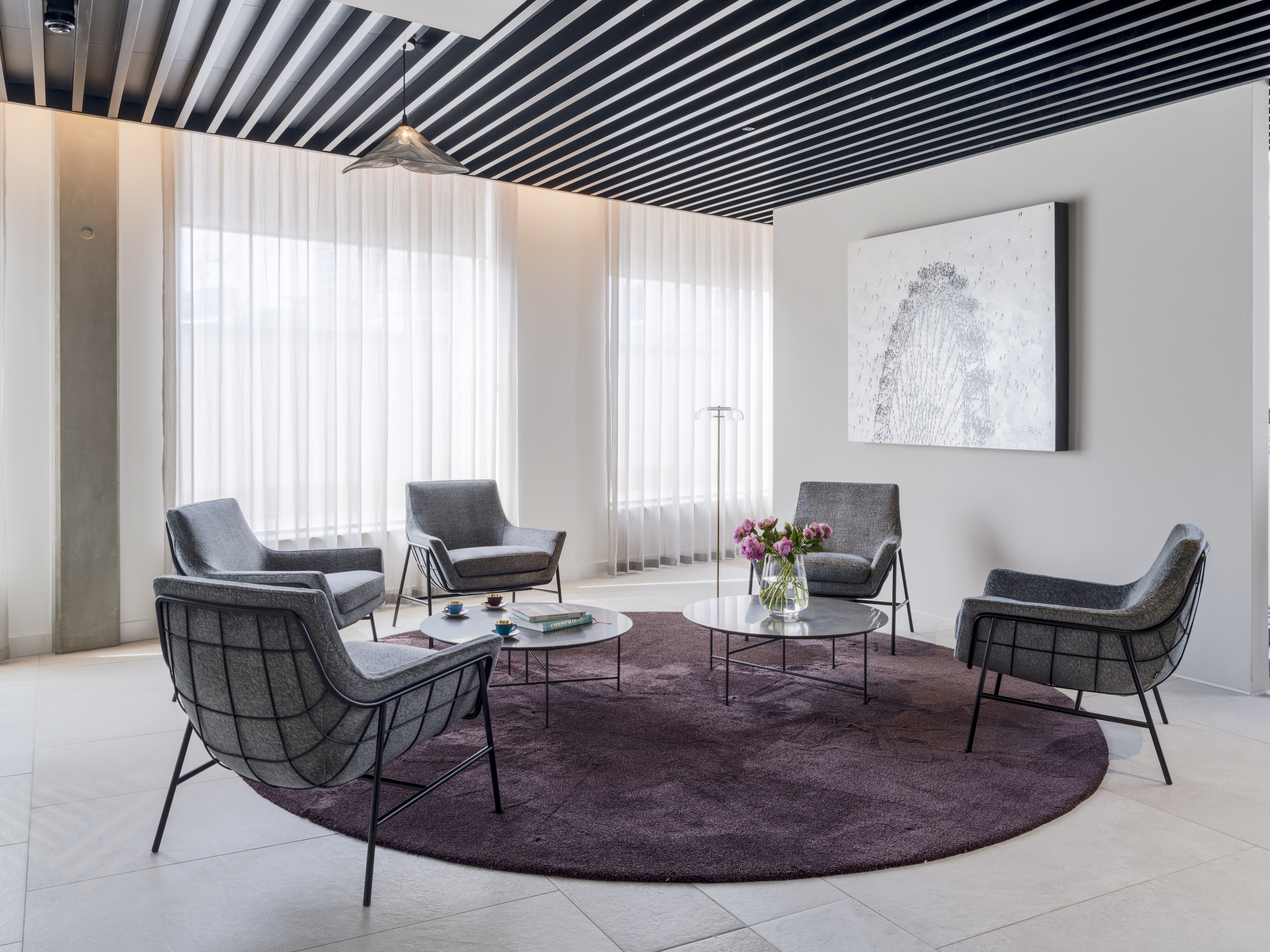 One outstanding feature is the statement chandelier in reception in which horizontal and vertical linear lights strike a balance between architectural and ambient lighting and provide a visual pathway into the building. Another is illuminated ceiling panels tuned to a cycle that mimics the changing colour temperature of daylight, helping to balance the circadian rhythms of people attending all-day meetings in areas devoid of natural light.