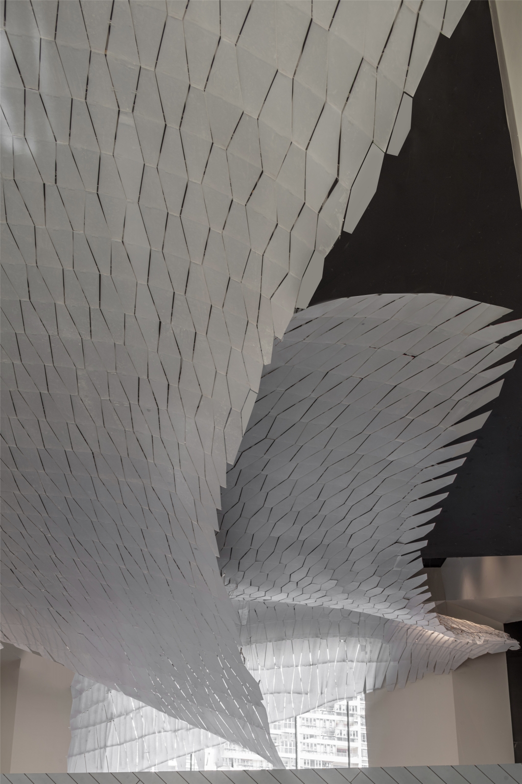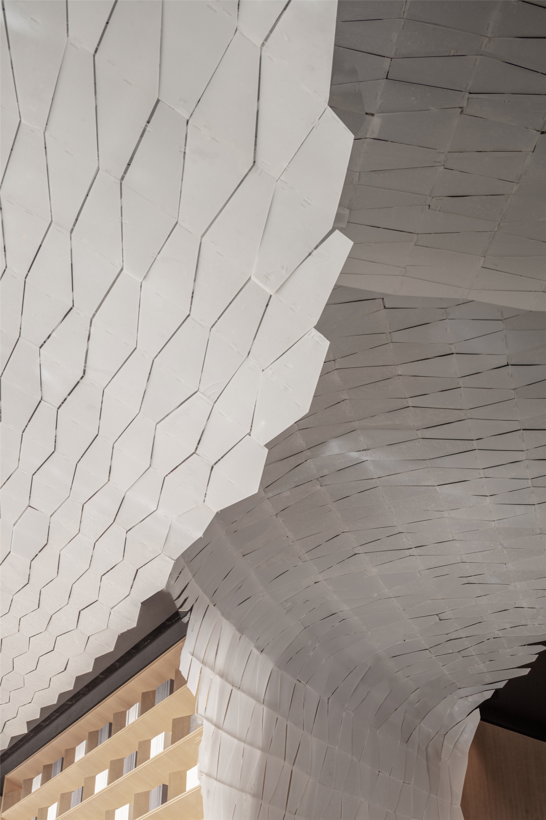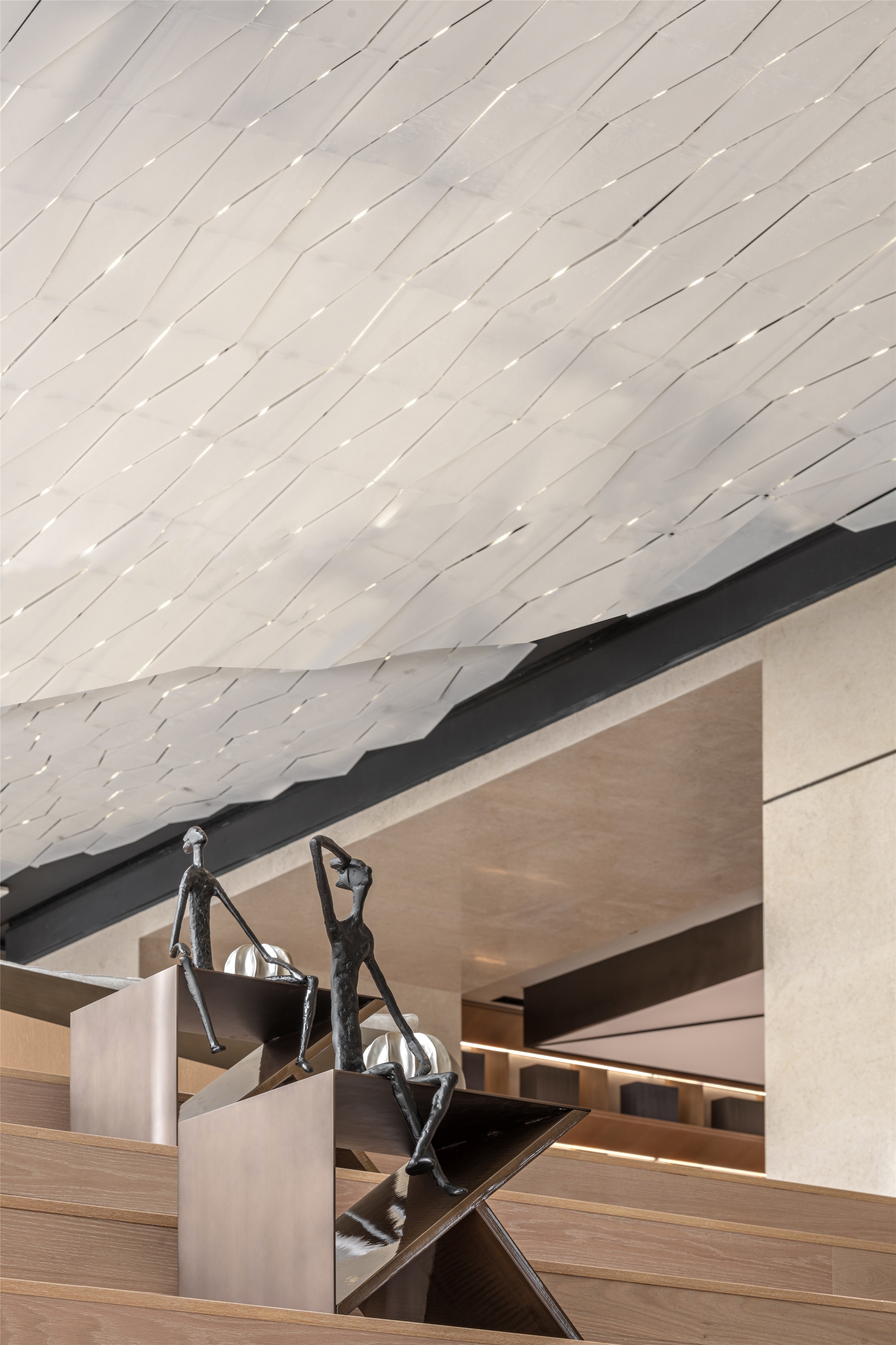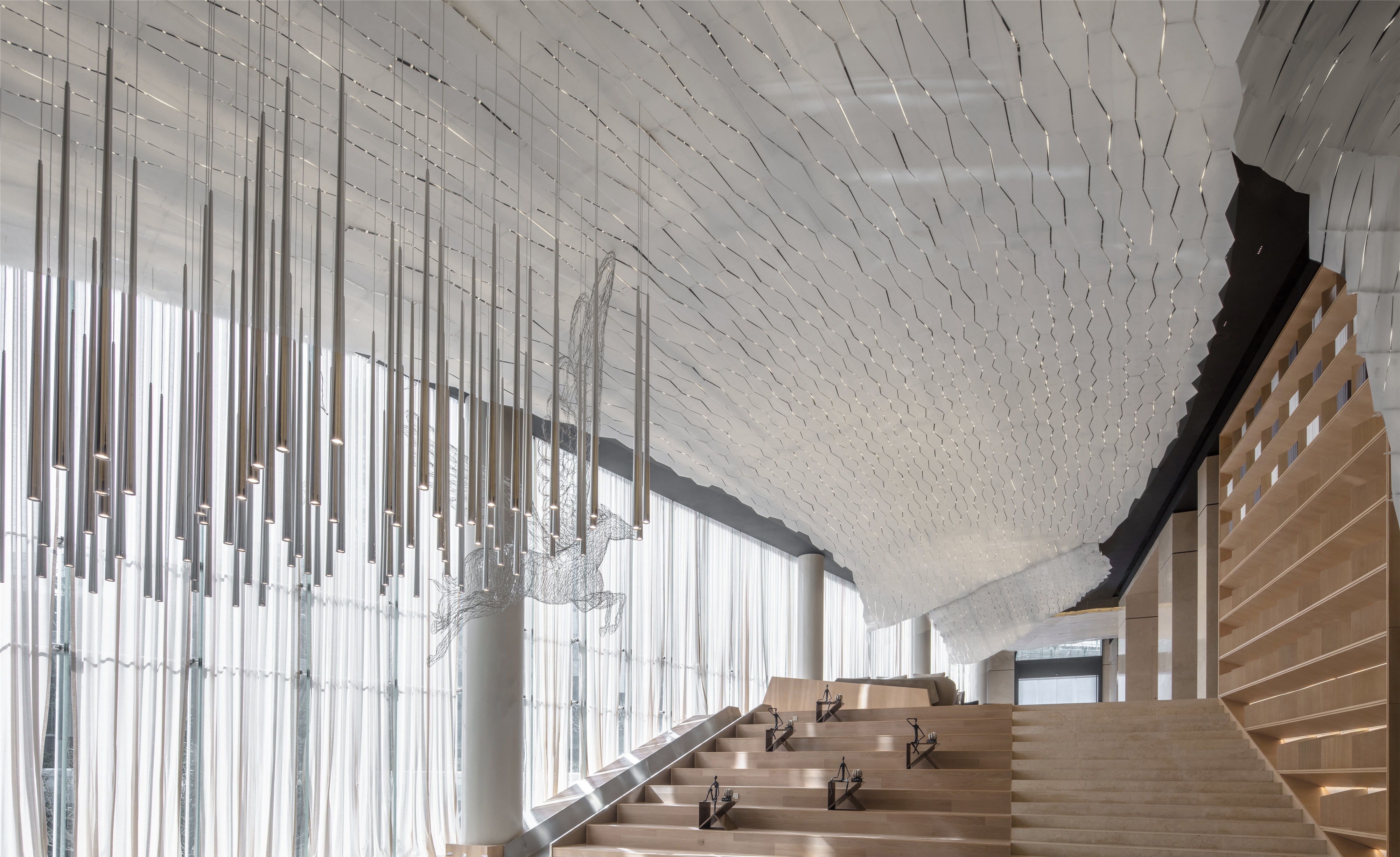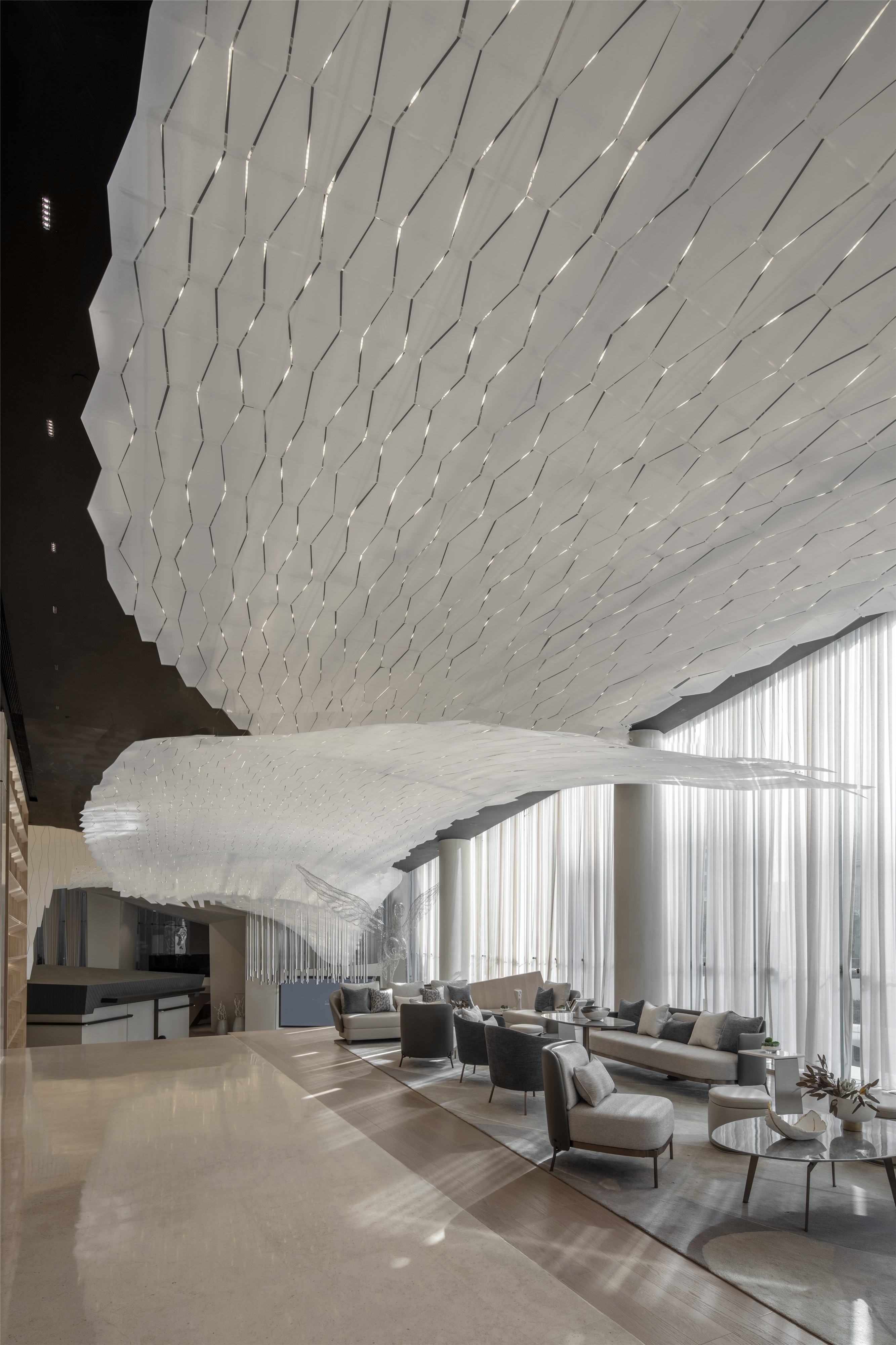 Entry DescriptionThe U World is located in Guangming District, Shenzhen City. In The north, it leans on a large mountain ecological park, with superior natural environment, potential regional development and convenient transportation.The project will become a city shared living hall that integrates reading, coffee, family fitness, social activities, sightseeing and other composite functions.Between the home and the city, "Shared Space" acts as an important transitional territory, a key place to show and reshape urban living style.The art installation above the step reading area is made of illuminated geometric polygonal acrylic splicing, like a river in heaven and a silver bay in dawn. The reading area will undoubtedly become a mecca for its literary style.