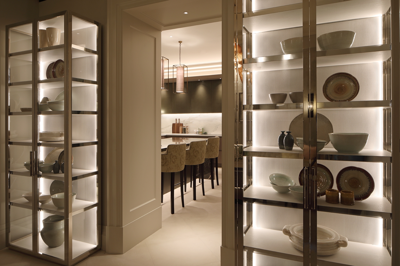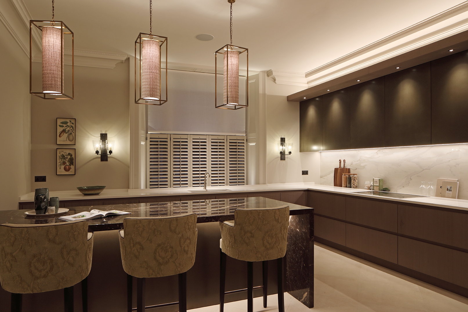 Within the kitchen and dining area we applied LED strips underneath the kitchen island and cabinets, through to the dining areas where uplights were used to highlight window panelling. Linear lighting was integrated into freestanding shelving to add drama and depth to the space.