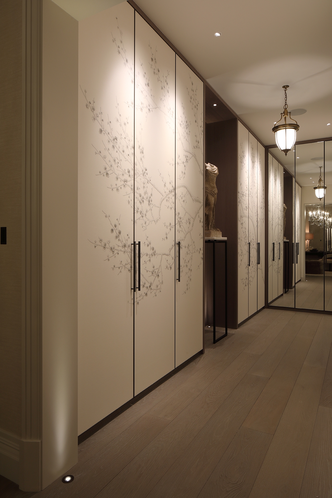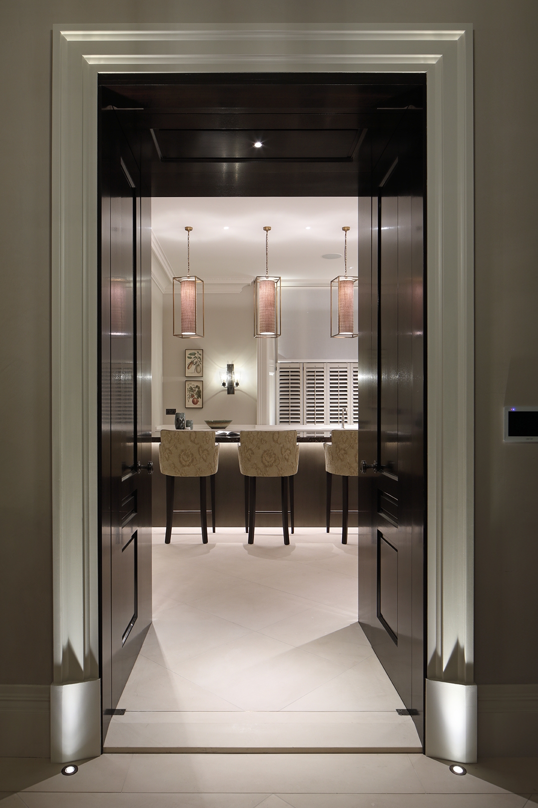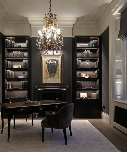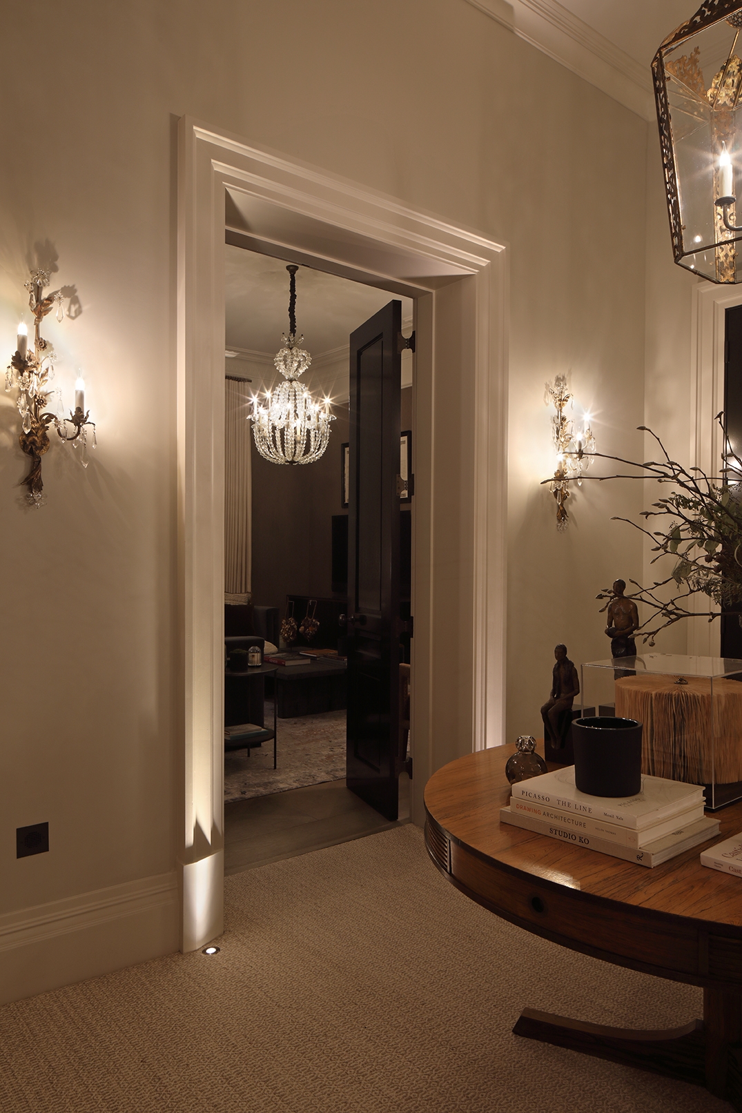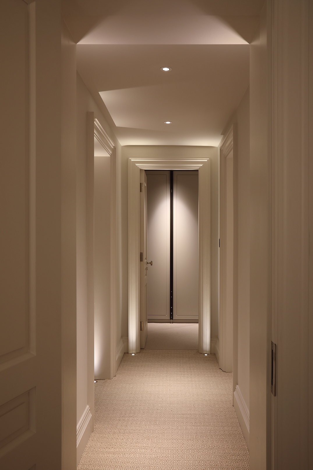 This project required clever lighting design to enrich the features throughout the property in a sympathetic but powerful way, within building guidelines. The client was a London based property developer and our brief was to design a lighting scheme that would enhance the interiors and architecture of the building. There were restrictions imposed due to the nature of the listing, to protect and retain the historic aspects of the property. In the principle rooms ceiling recessed downlights were not permitted. In these spaces we had to creatively introduce lighting into joinery items and work with Louise Bradley Interiors to develop the decorative lighting scheme. We used floor recessed uplights to provide accent lighting by highlighting various features such as fireplace surrounds, window reveals and door architraves.