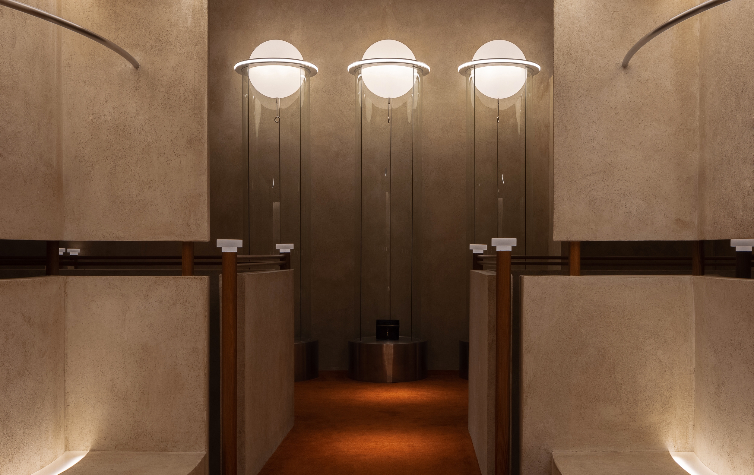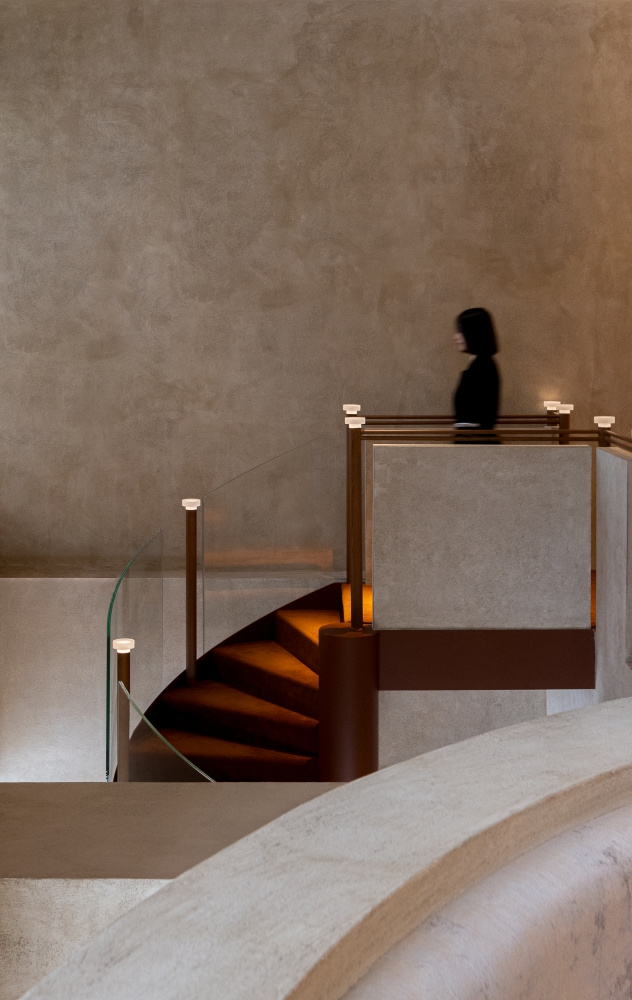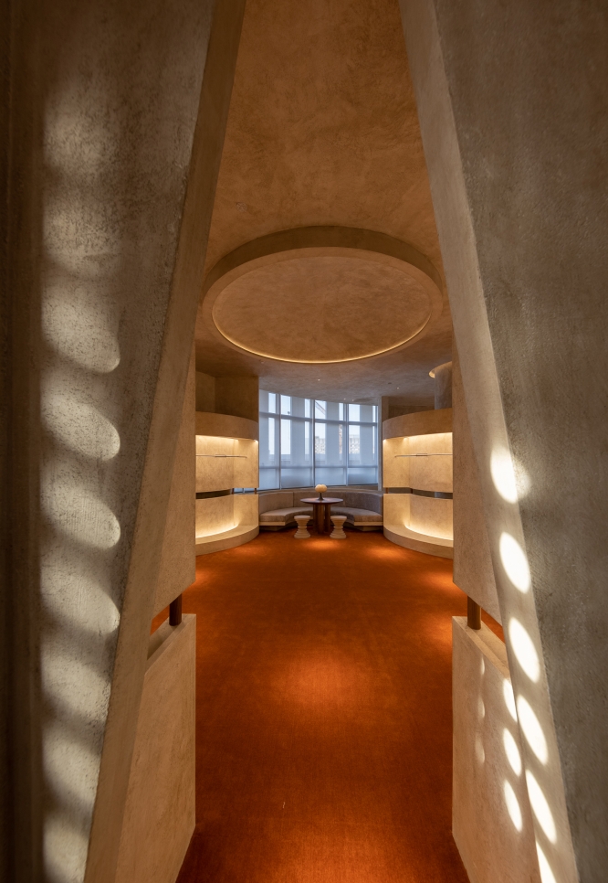 The arc-shaped sofa in the lounge area, coupled with retro table lamps, seems to be back to the modern era. The soft fabrics, retro wood, and warm lighting alleviate the cold and hard feeling brought by concrete and metal.