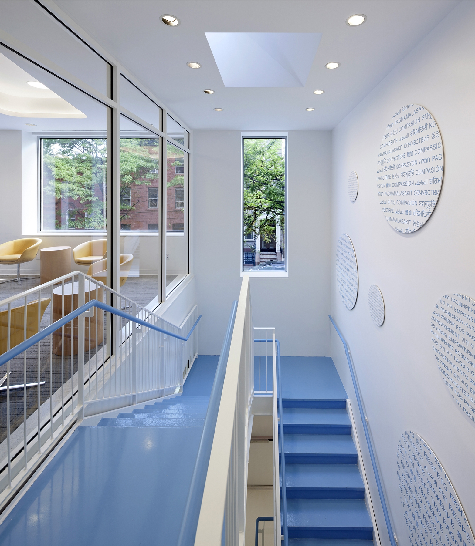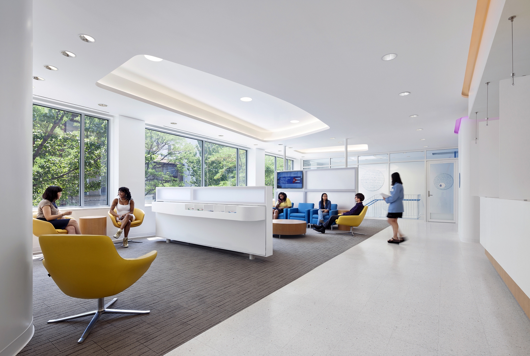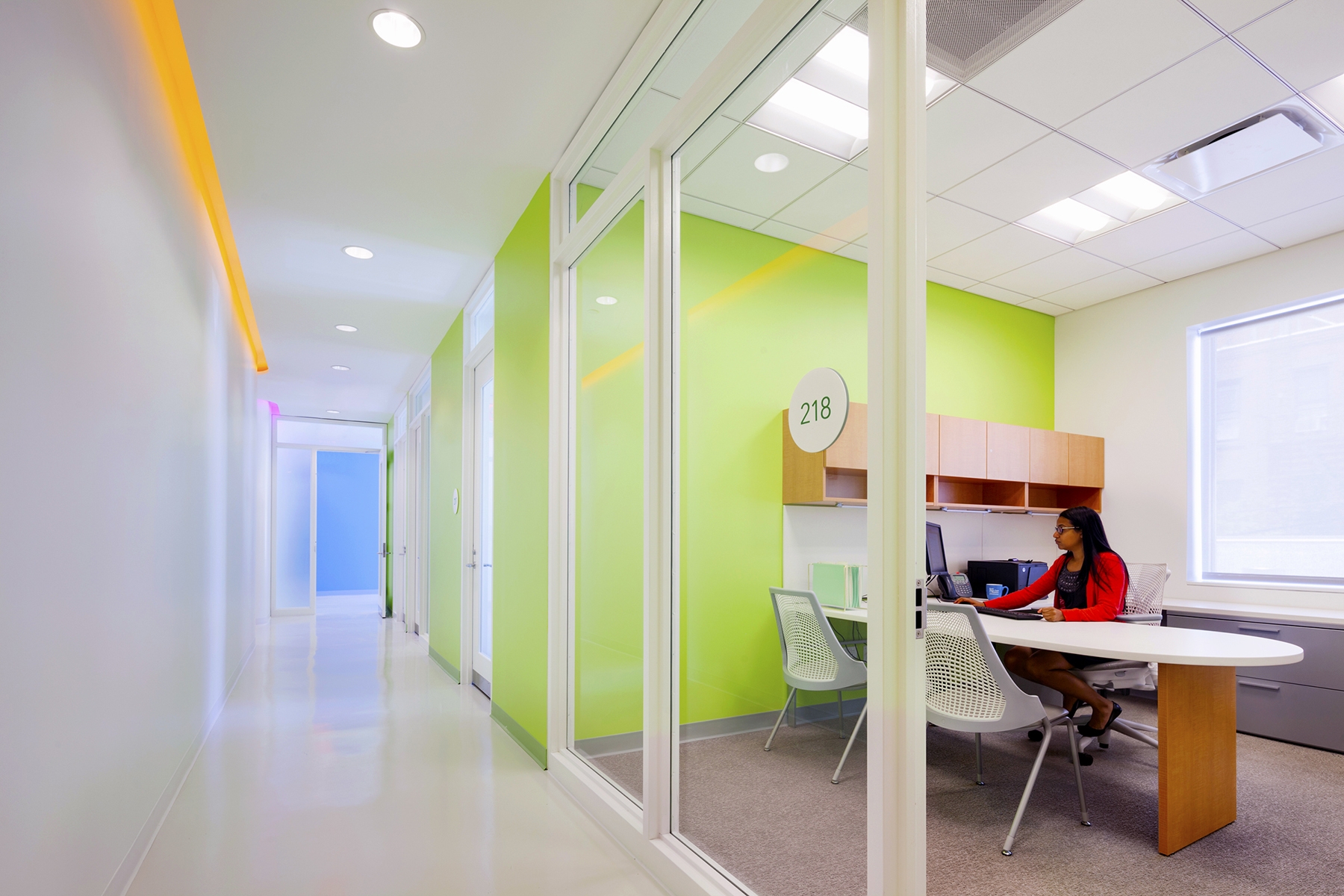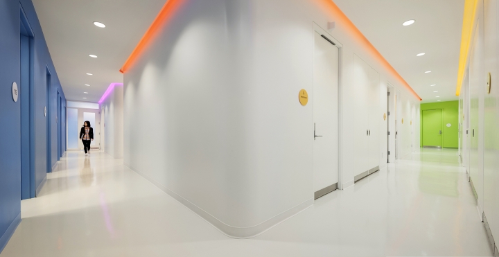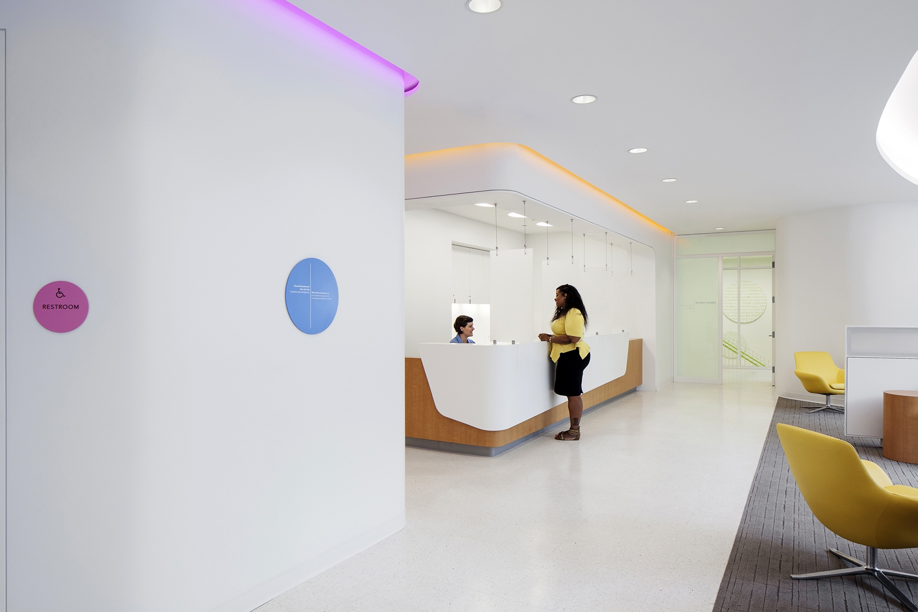 Using the building’s generous new windows as inspiration, the design calls upon coves and skylight-type fixtures in select spaces to amplify the sense of a light-filled setting. LED light coves in bold colors punctuate a pristine, white interior. These colorful elements work with signage and furnishings to support way-finding and spatial organization. The design embodies a youthful spirit, representative of the center’s clientele.