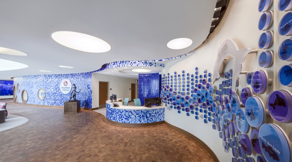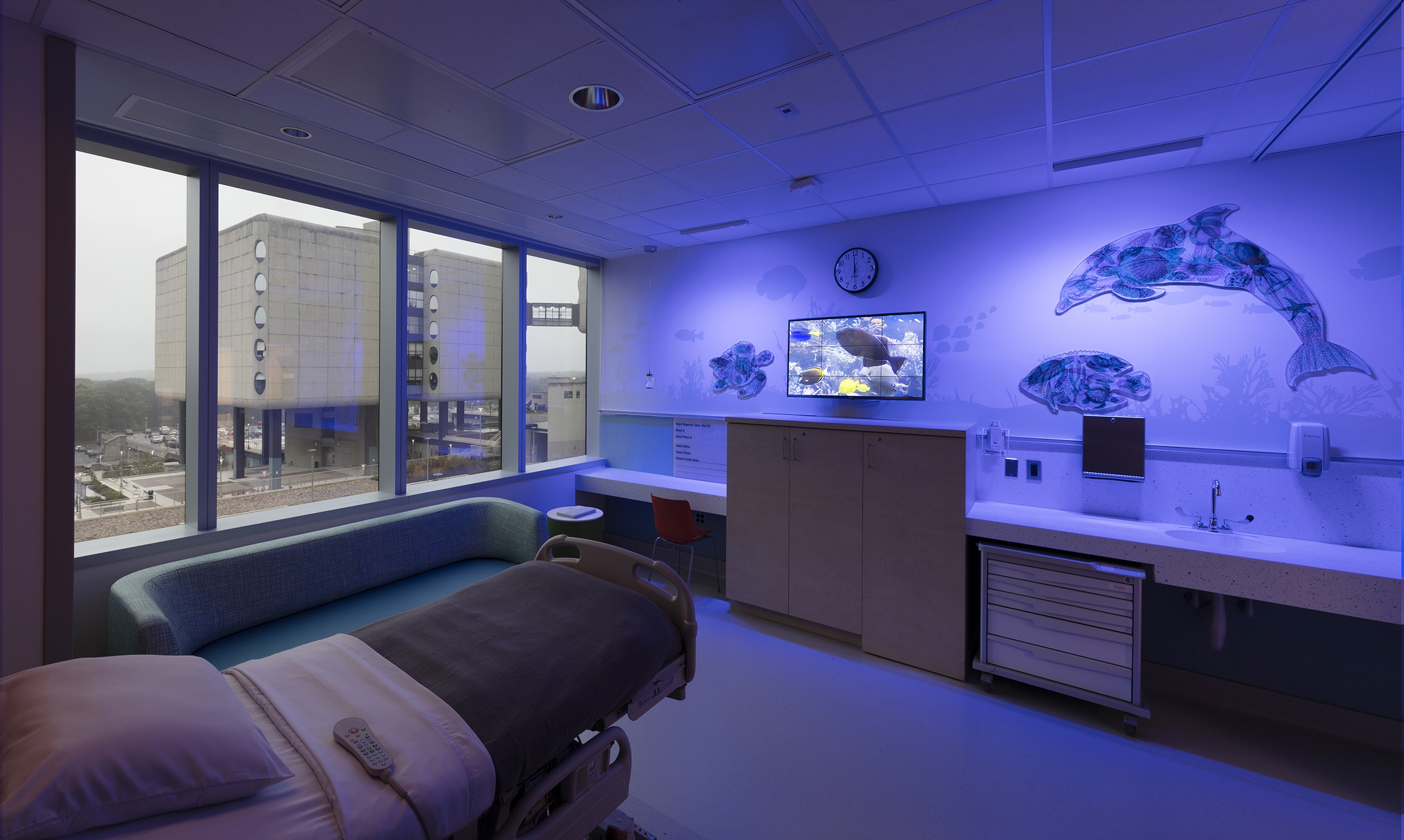 A water-motif suffuses the Children’s Hospital lobby. Grazers highlight mosaic “bubbles” and large ceiling fixtures enrich the imagery. To reduce patients’ anxiety, their rooms are outfitted with color-changing LEDs that allow children to personalize their environments using bedside controls.