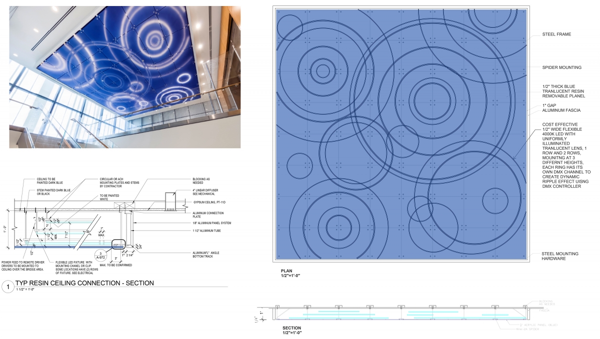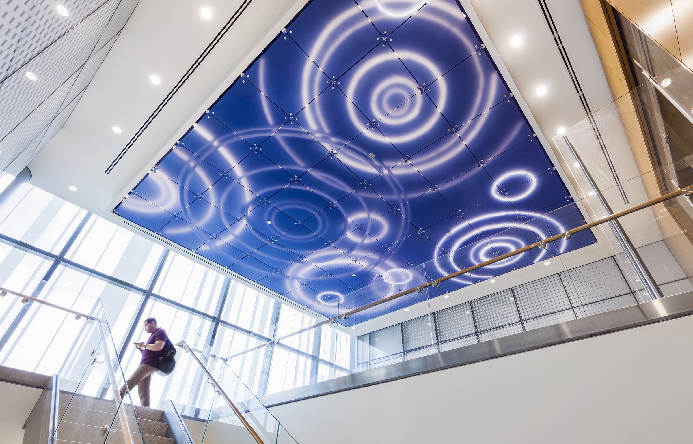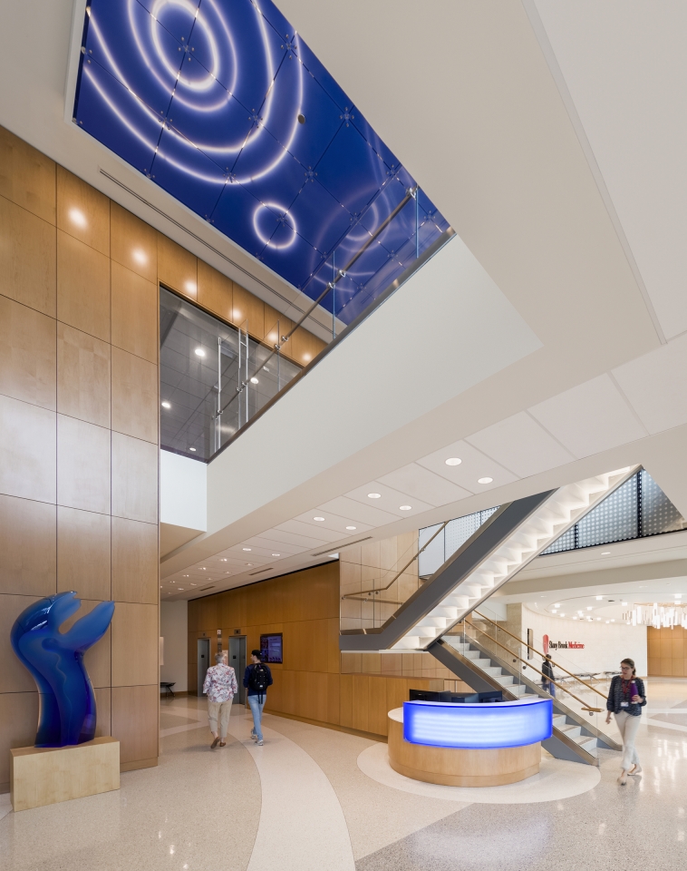 At the double-height Cancer Center lobby, the water theme reemerges in a glass art feature. Layered, overlapping, animated LED circles suggest ripples. This feature embodies our cohesive lighting concept: celebration of nature, reinforcement of pure geometries, and a design to evoke delight.