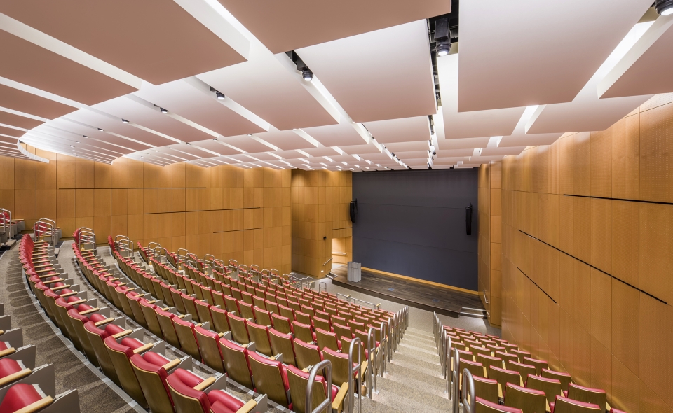 In the auditorium, cove uplights accent the ceiling’s overlapping panels to emphasize the room’s sweeping arc.