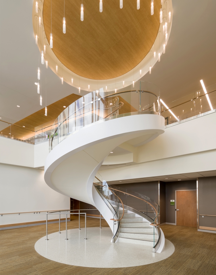 Decorative fixtures that reinforce the architectural forms are used throughout to mark entry and circulation points. Pendants reinforce the ellipse at the auditorium lobby arrival. Cylindrical glass lights follow a spiral stair down to the lower level.
