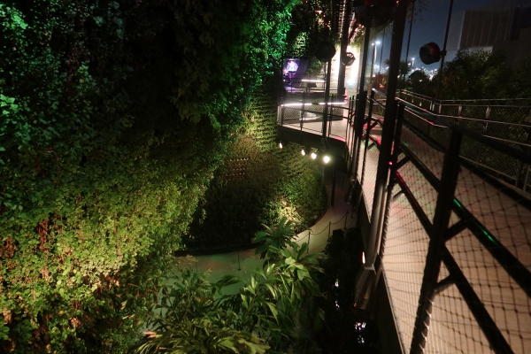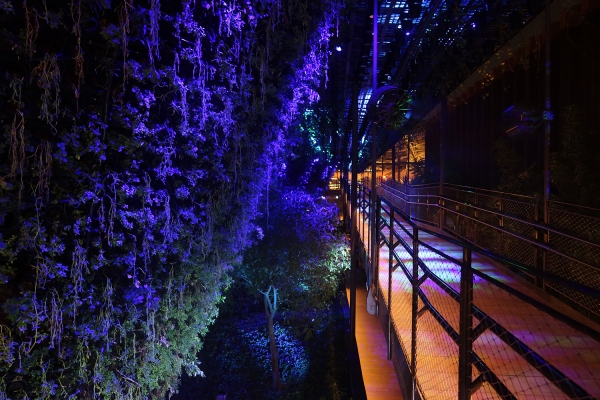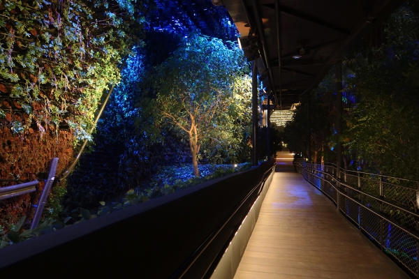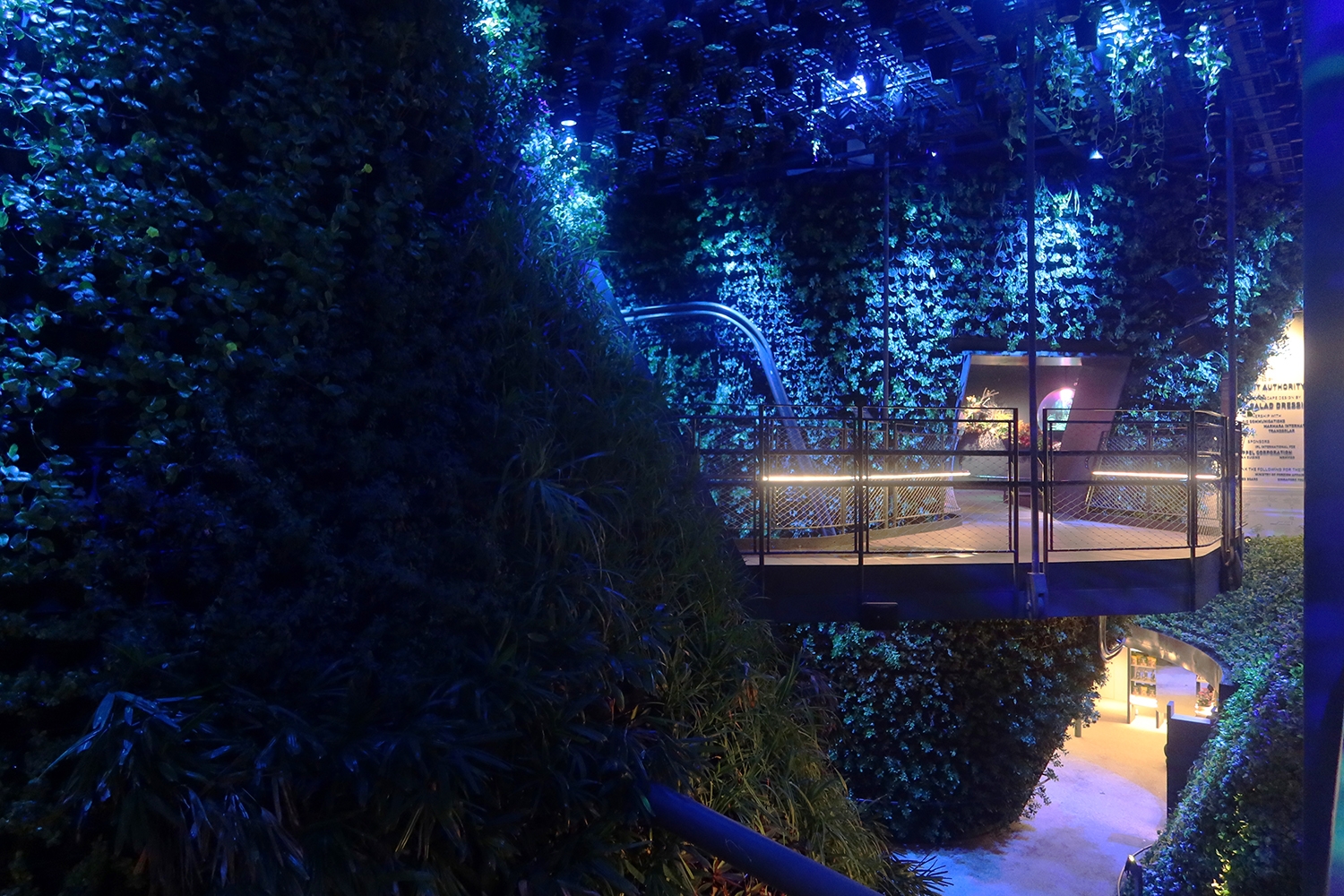 Following the pathways meandering into nature, concealed lighting serves as guiding light, gentling illuminating the way forward. The layer of grow lights above the hanging gardens support the growth and doubles up as a layer for environmental lighting creating a layer of “sky”. Grow lights in narrow beams also support the growth of the nature on the cone
