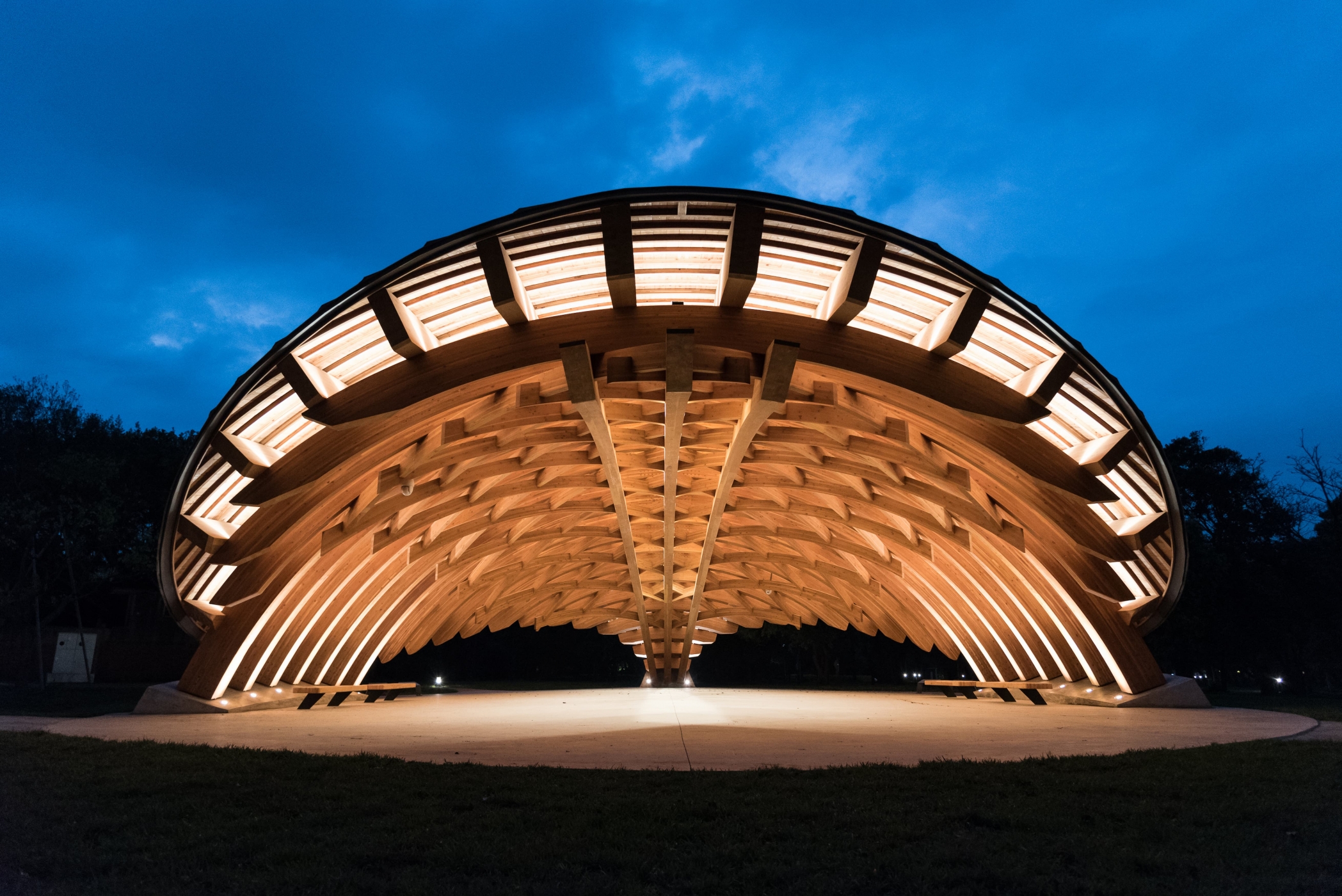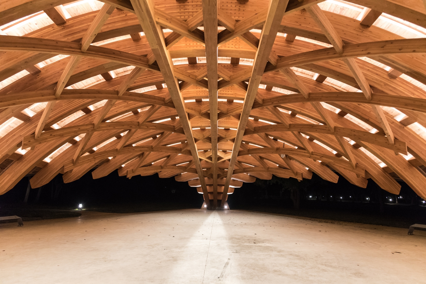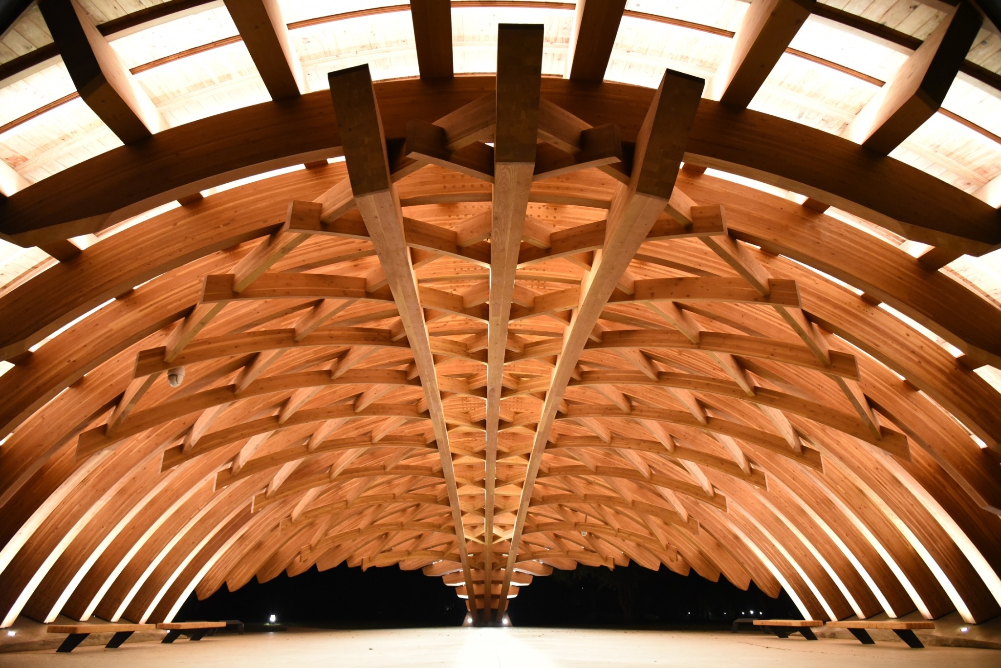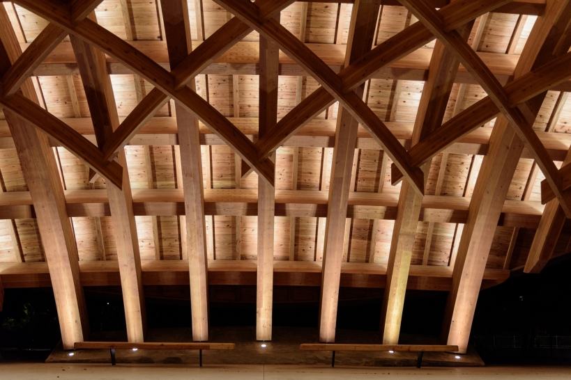 Entry DescriptionCompared with daylighting illuminates the top of pavilion, electrical lighting paired with the wooden truss on inner side of the pavilion, linear LED luminaires are concealed above each beam. When projected upward, light accents the pavilion’s dome and goes along the veins. The light bounces off and with shadow shows the beauty of the hierarchy of the structure.