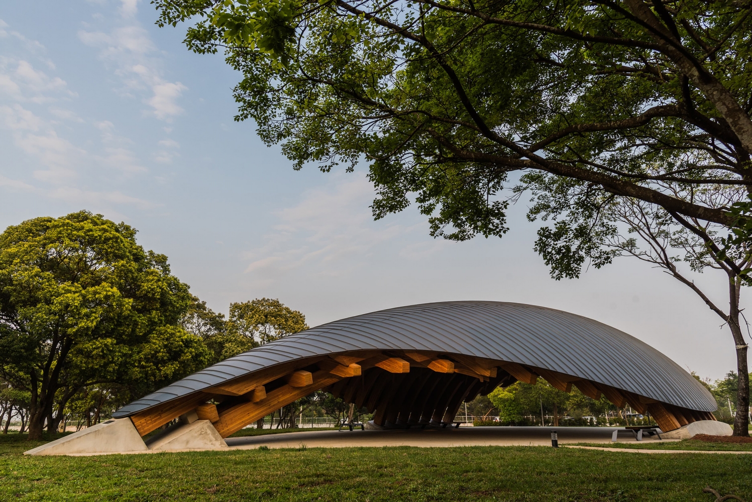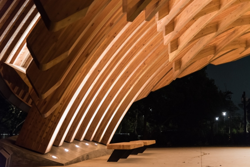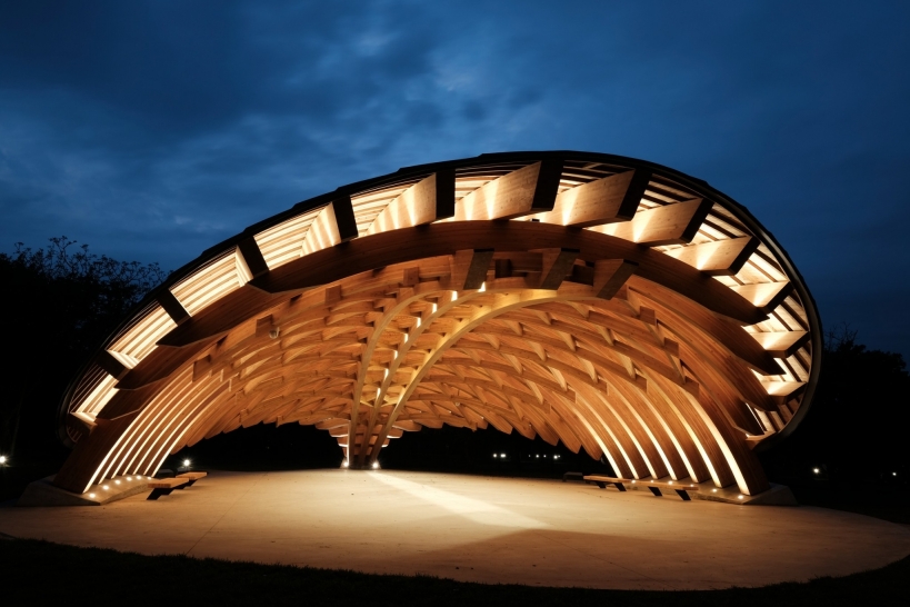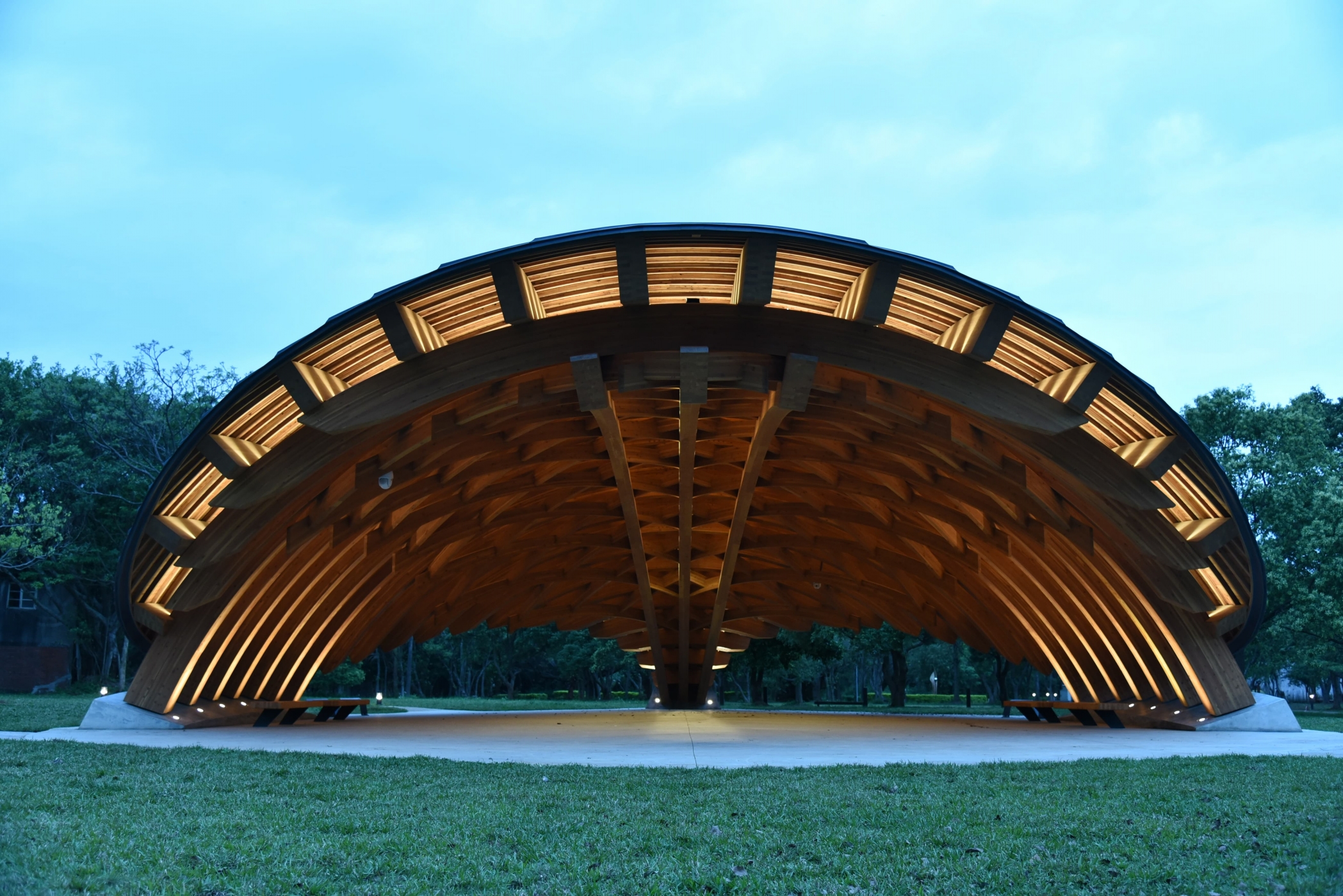Entry DescriptionCompared with daylighting illuminates the top of pavilion, electrical lighting paired with the wooden truss on inner side of the pavilion, linear LED luminaires are concealed above each beam. When projected upward, light accents the pavilion’s dome and goes along the veins. The light bounces off and with shadow shows the beauty of the hierarchy of the structure.