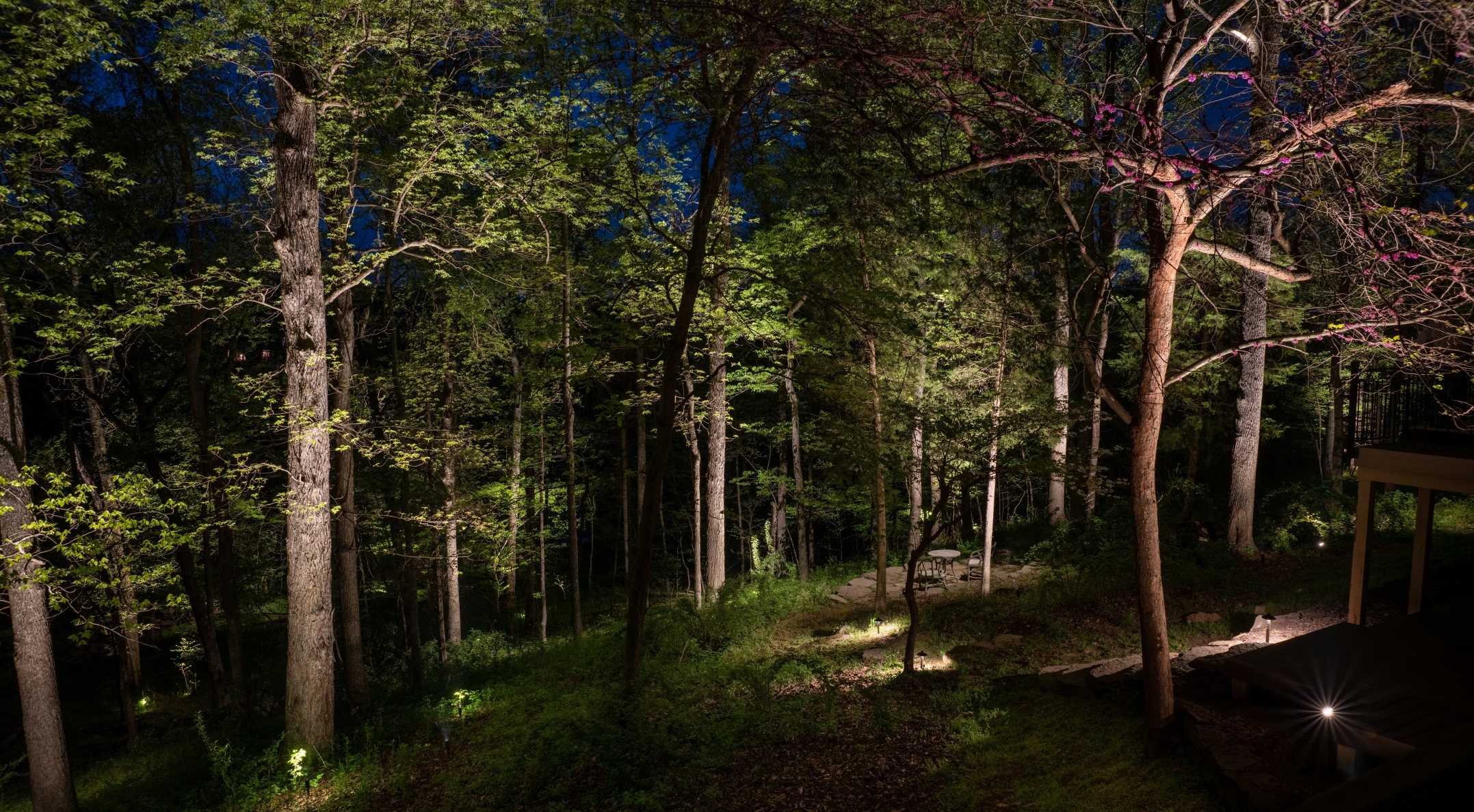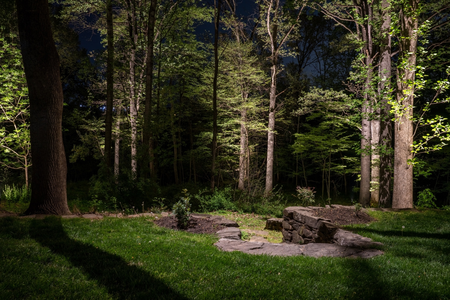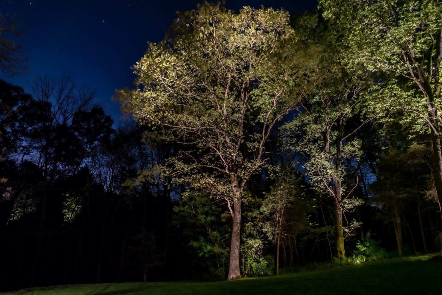 We illuminated stately sycamores and oak trees to provide a beautiful wash of light in the canopy. Smaller dogwoods and redbud trees were lit to add brilliant color and the most important zone of lighting in direct line of sight.