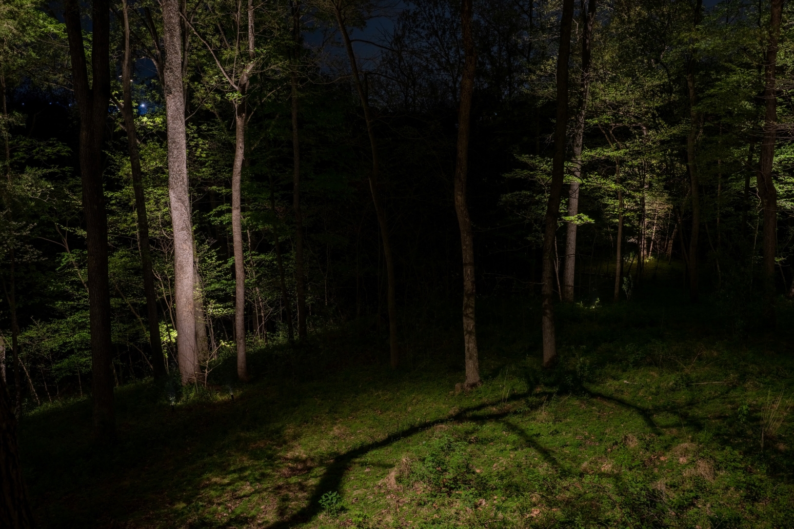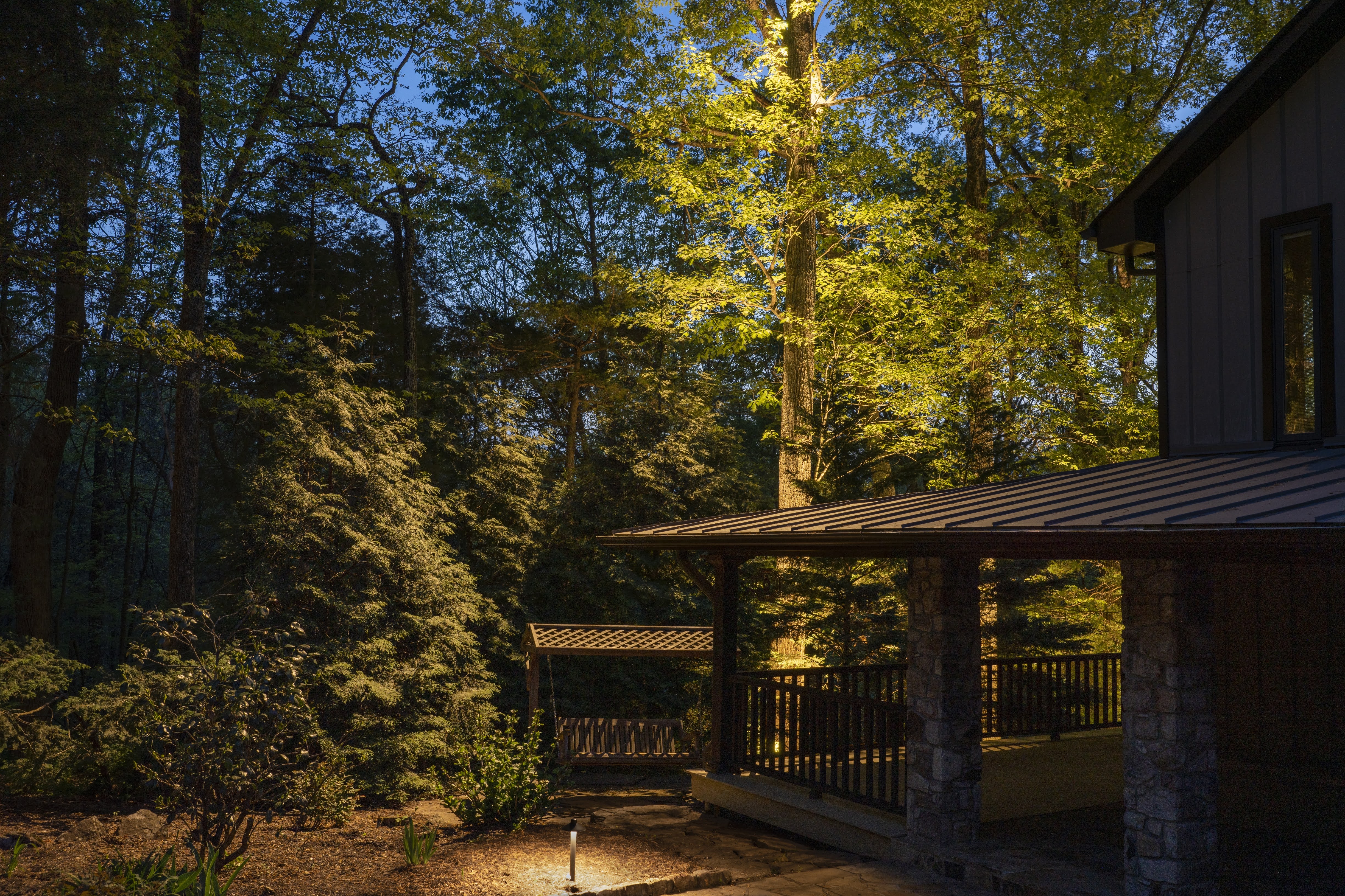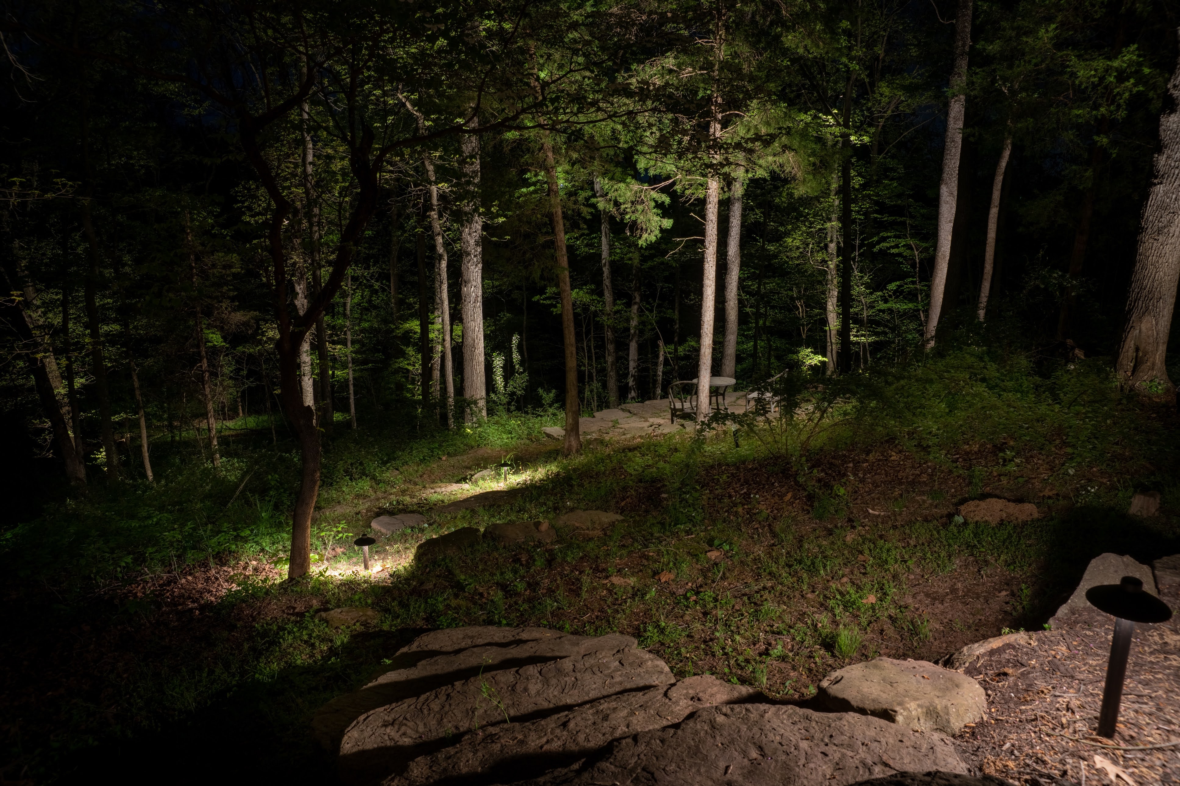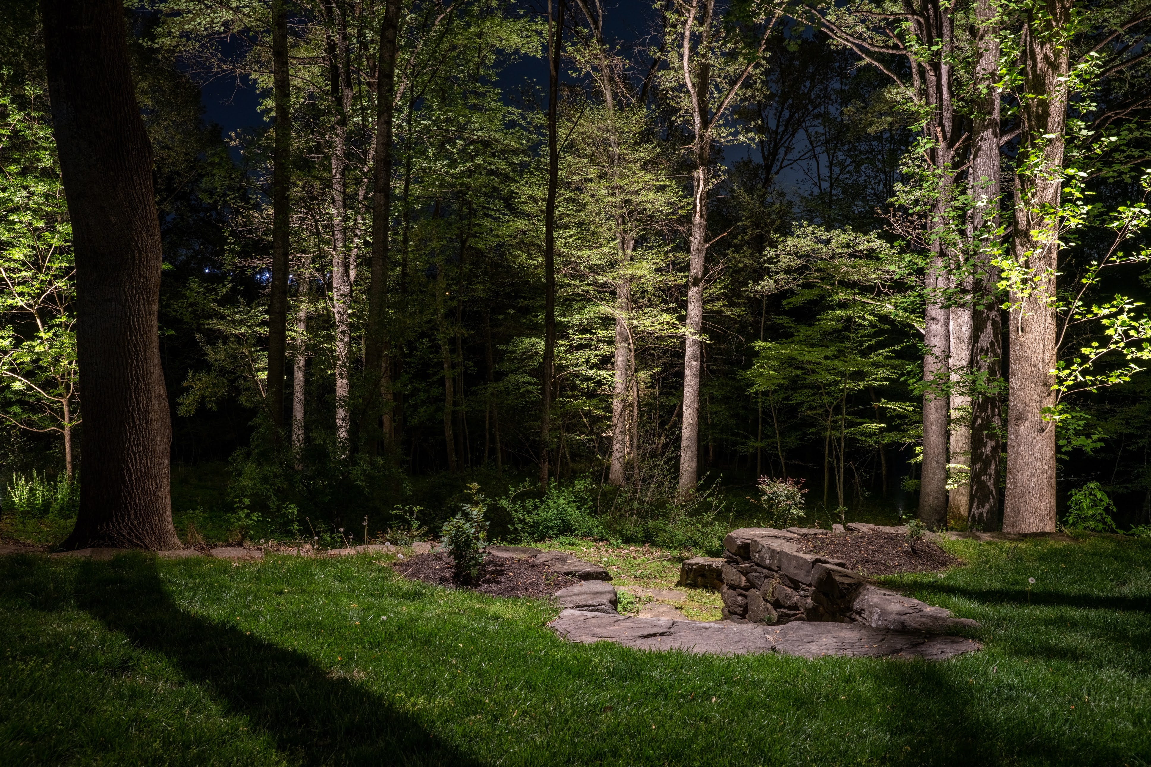 We illuminated stately sycamores and oak trees to provide a beautiful wash of light in the canopy. Smaller dogwoods and redbud trees were lit to add brilliant color and the most important zone of lighting in direct line of sight.