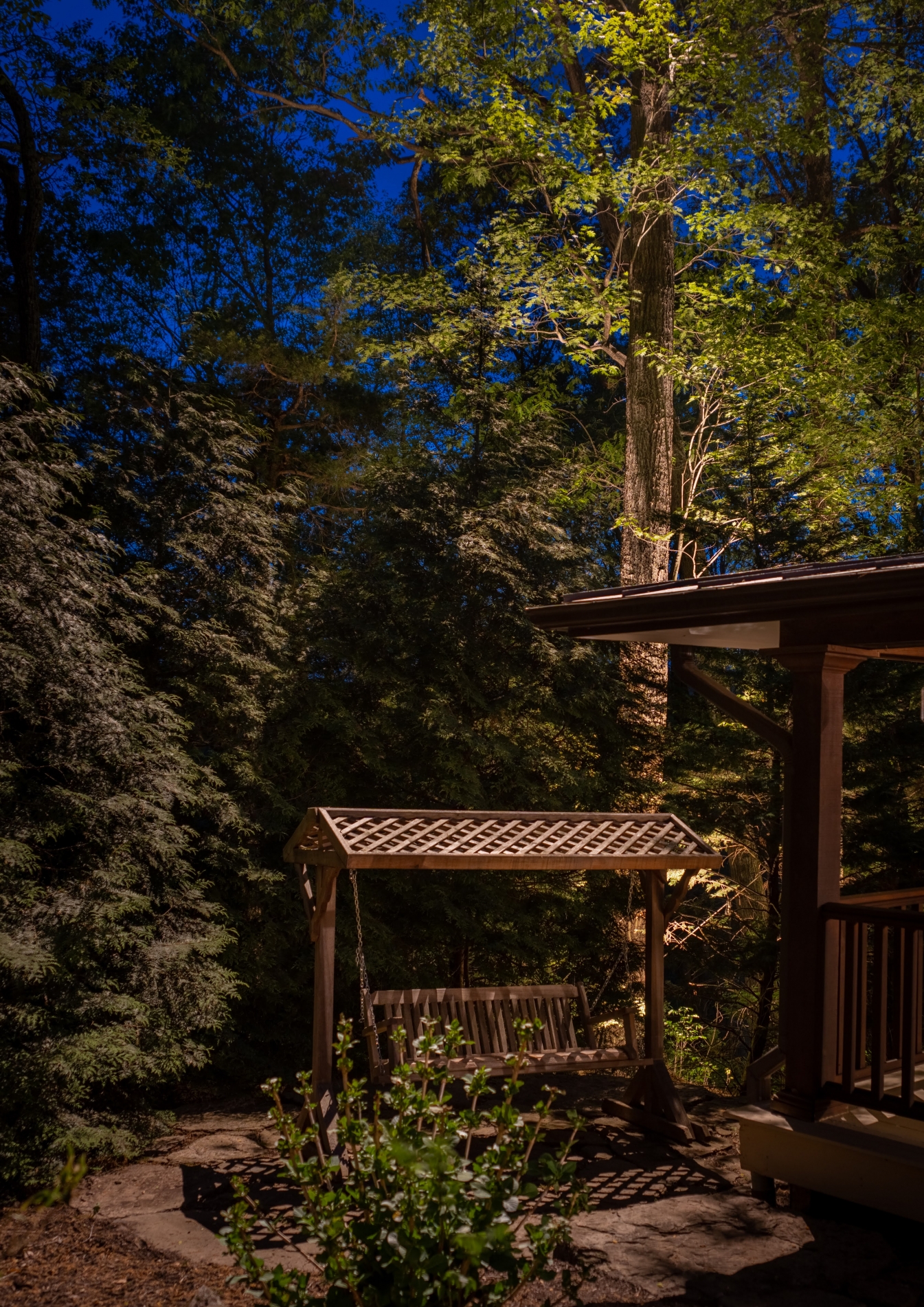 We tied in lighting from the front property by moonlighting the front porch swing from a tree that was part of the backyard lighting system.