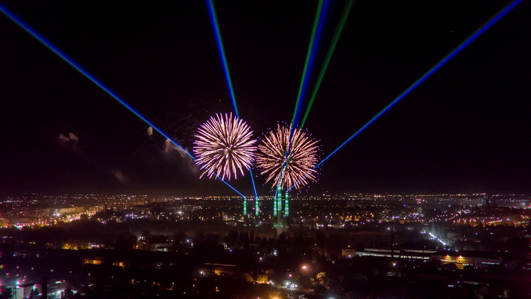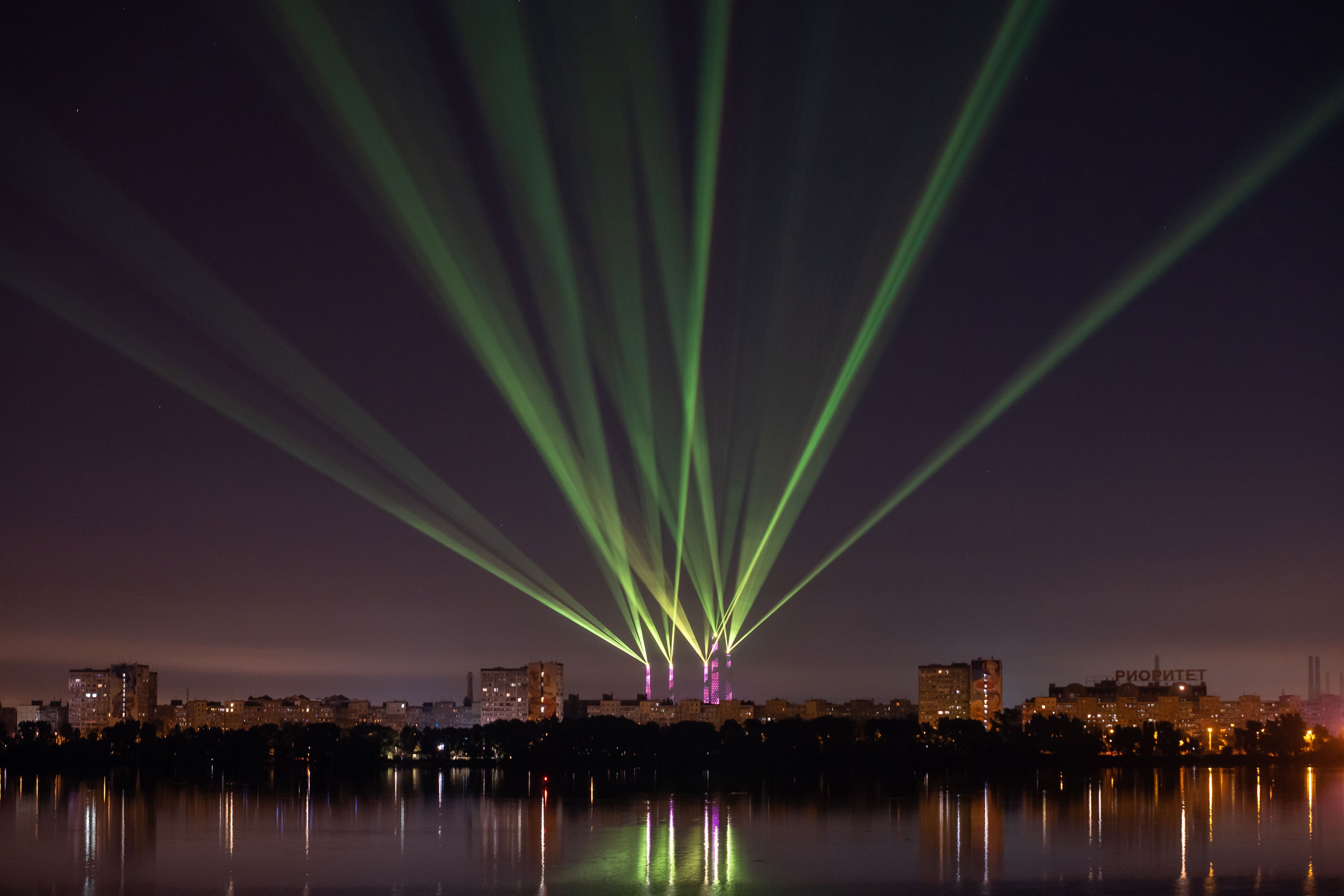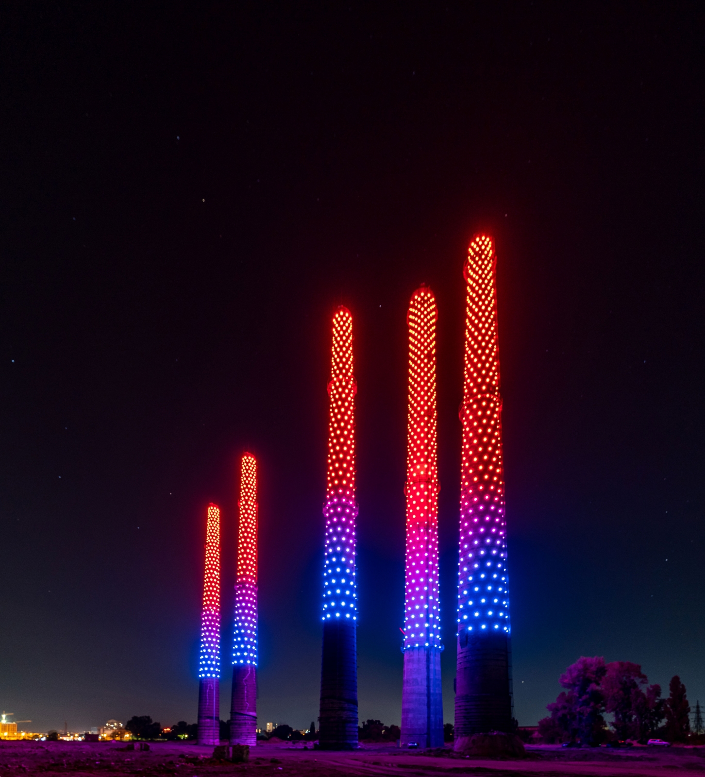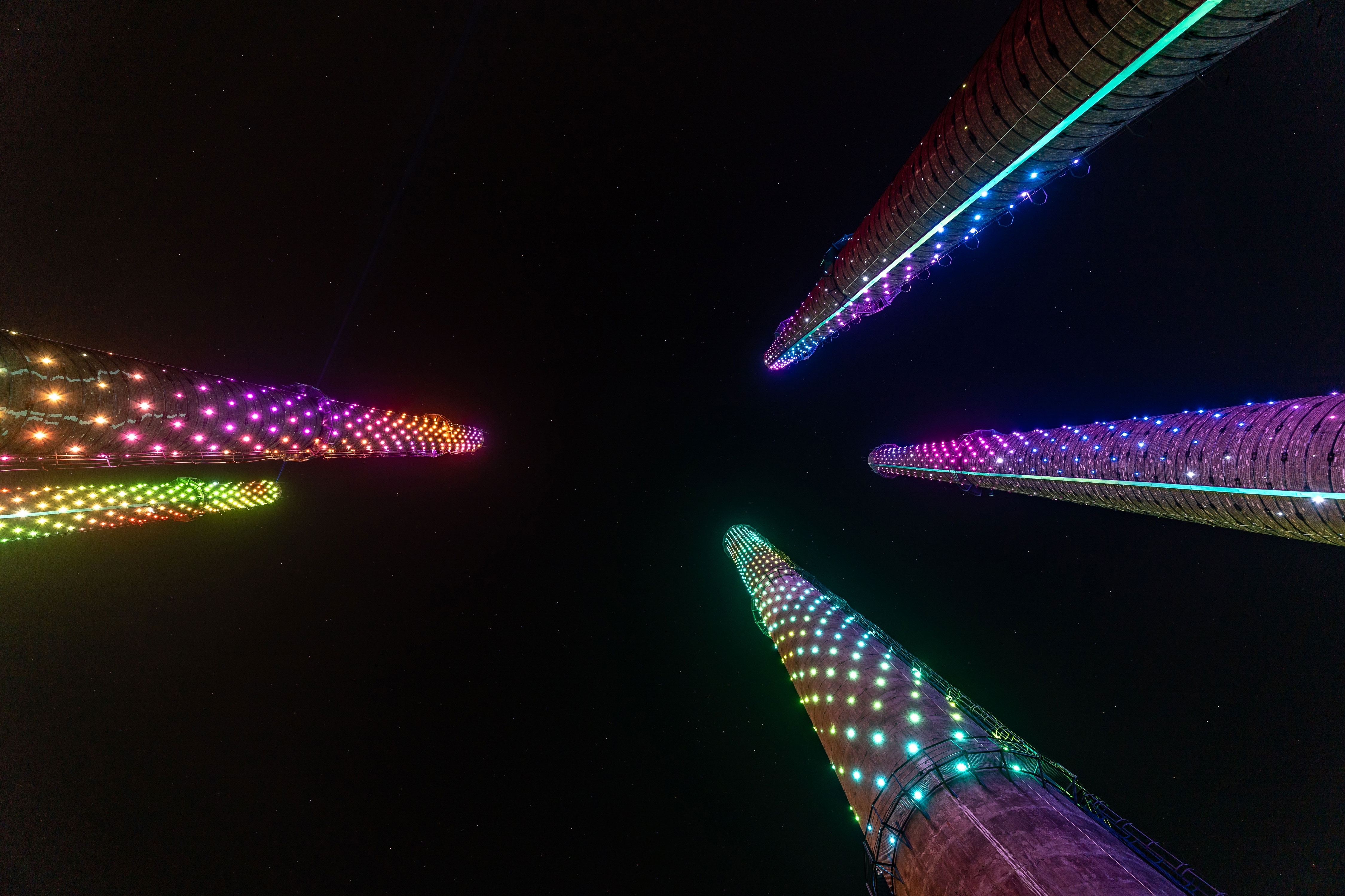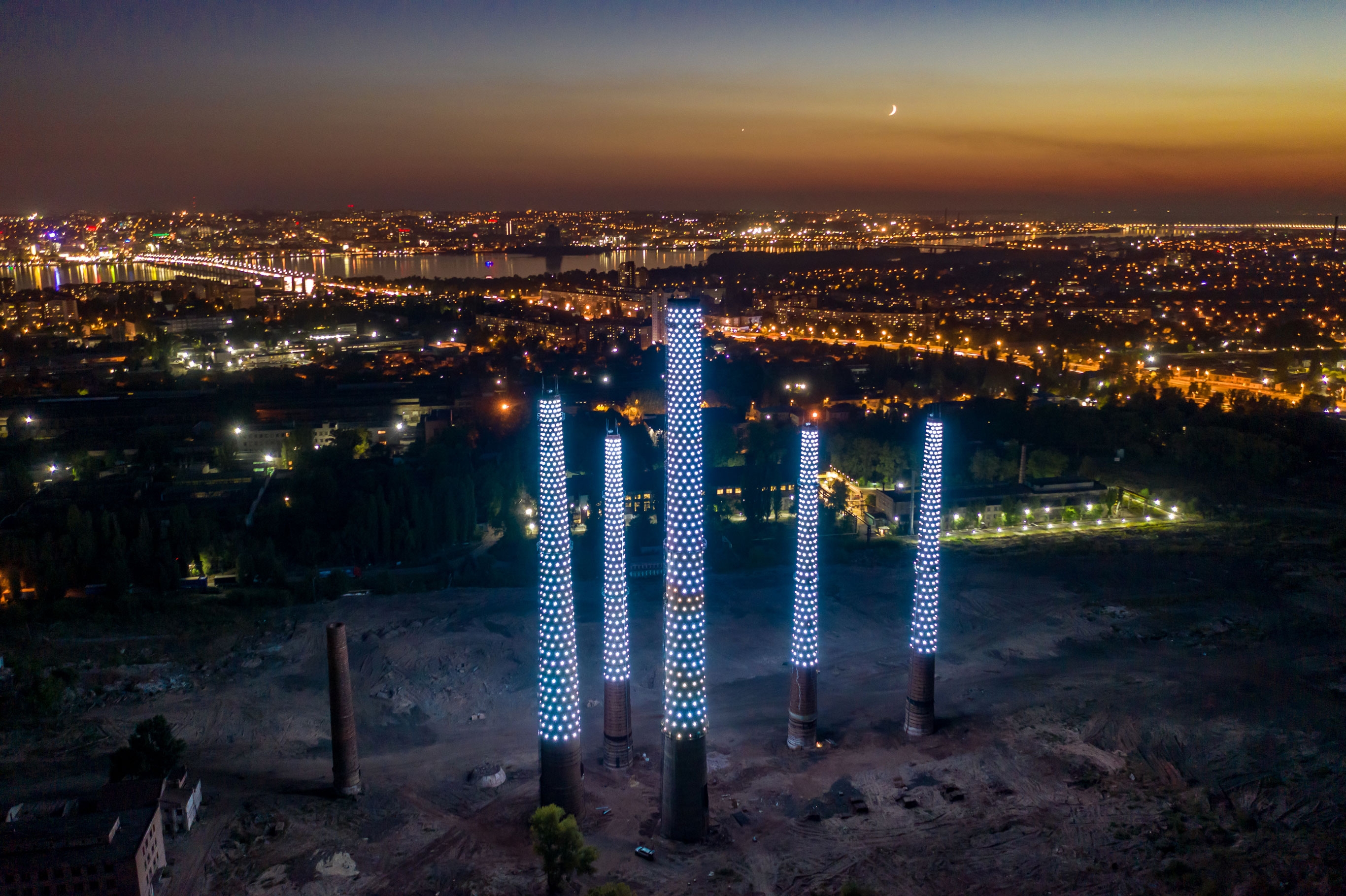 We revitalized and connected 5 plant chimneys; later, the number will grow up to 13 of them, covering the distance of 7 km. 2,500 pixel lights cover the pipes, and 60W lasers are installed on top. Their color scale and dynamics can be programmed depending on events and holidays.Light, lasers, and sound on the observation platforms we equipped are launched simultaneously in real-time through the sophisticated software we developed for wireless synchronization across the river. This art installation has become a tourist attraction. Every evening, this amazing light of pixels pleases the eyes of the city residents. And twice a week, lasers and sound are turned on and attract tourists to our city.