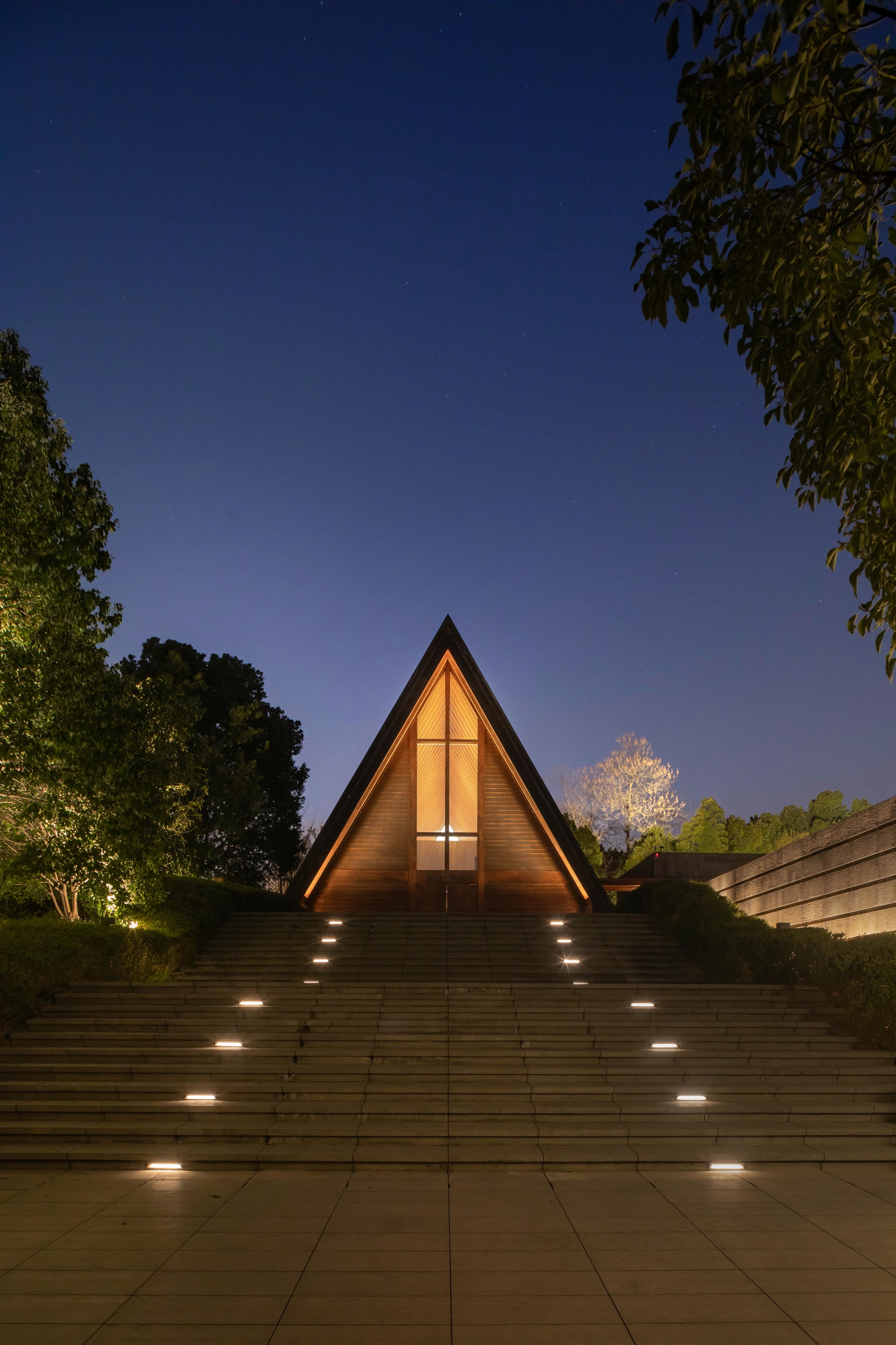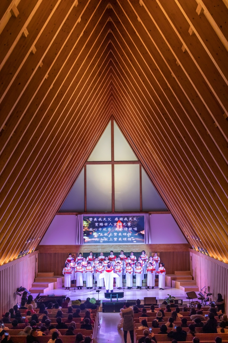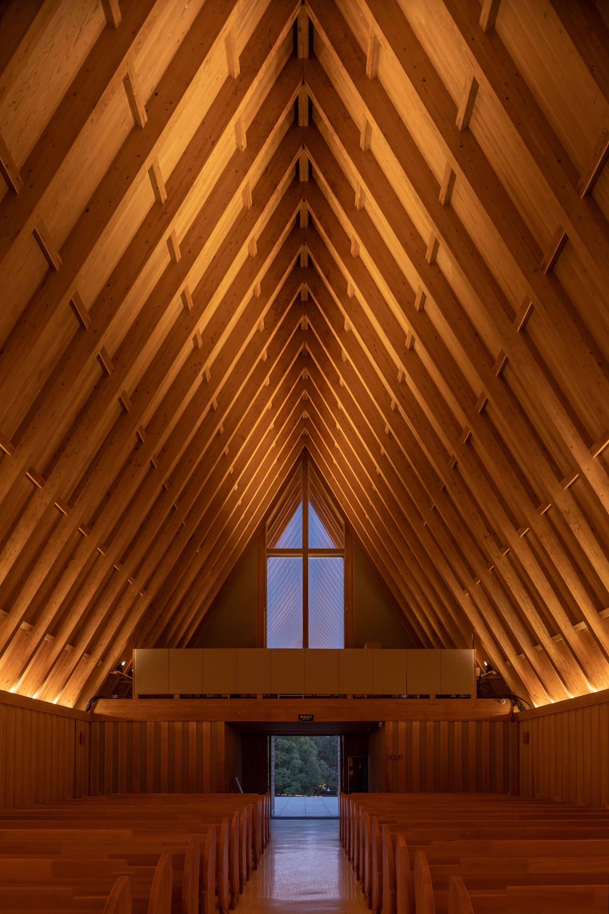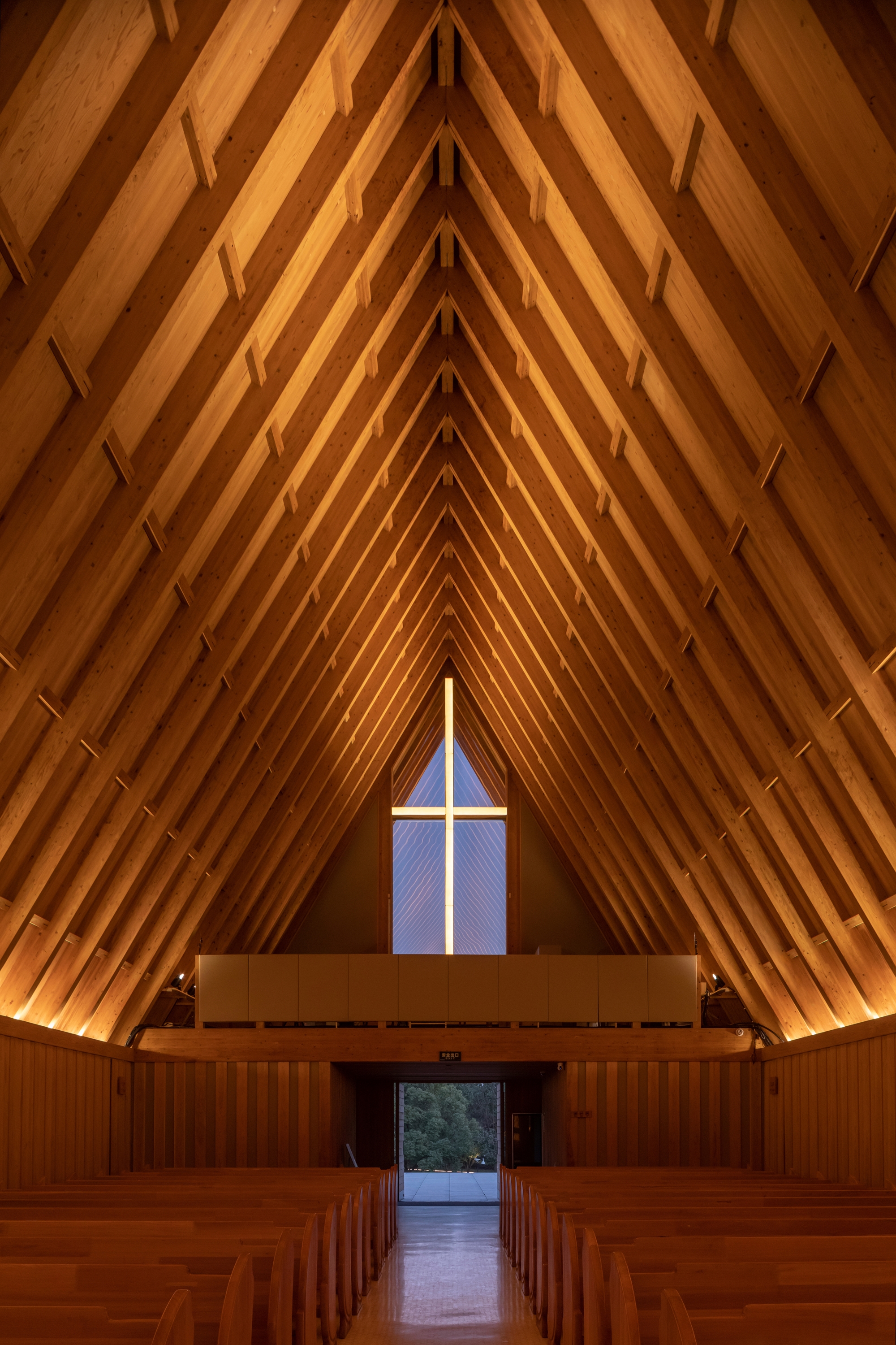 SPIRIT: When believers walk to the church. When they turned around after praying, they would be surprised to find that the pine wood structure has become a self-illuminating cross with a wood grain finish. The bright cross implies the eternity and purity after prayer.