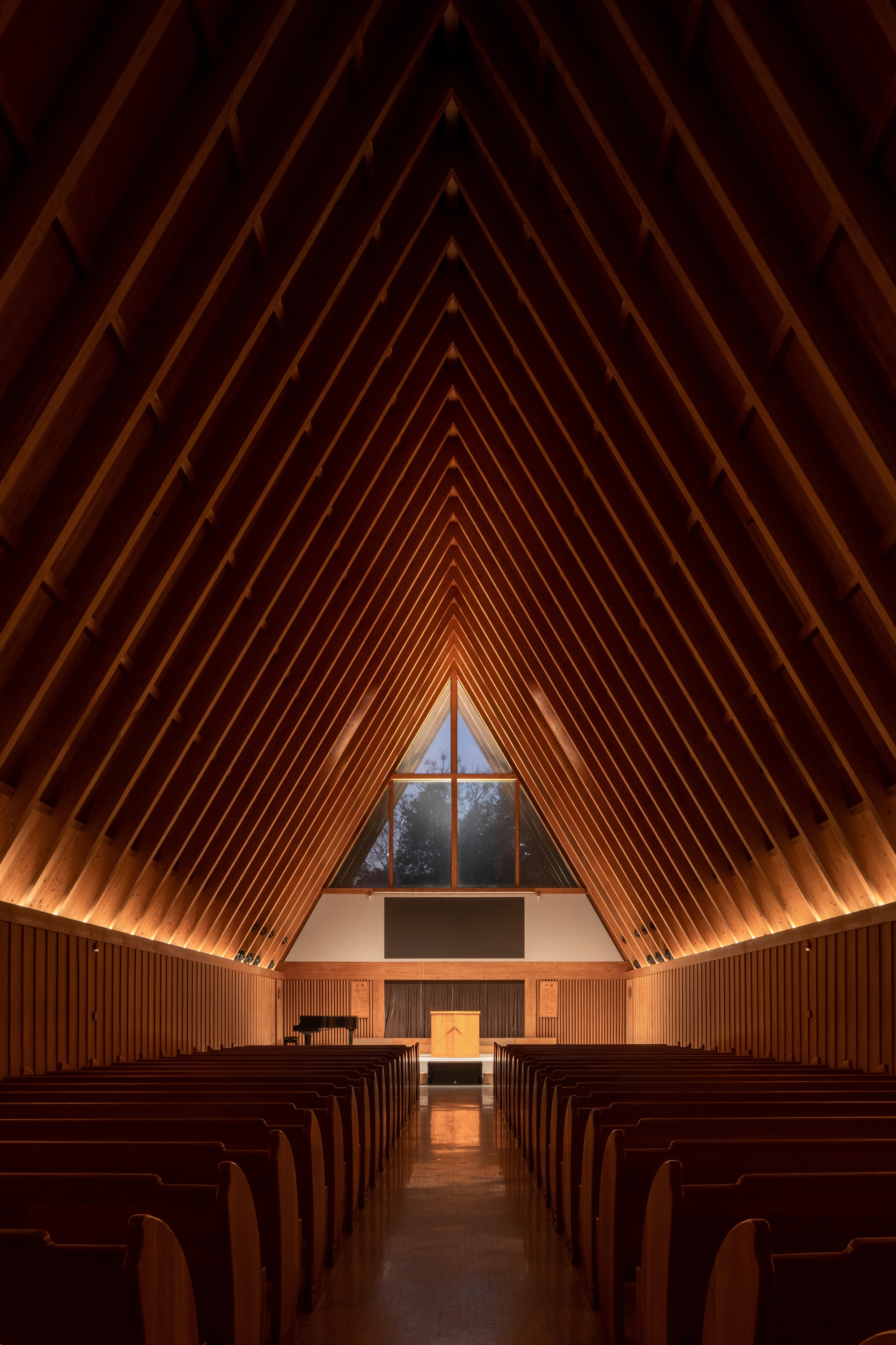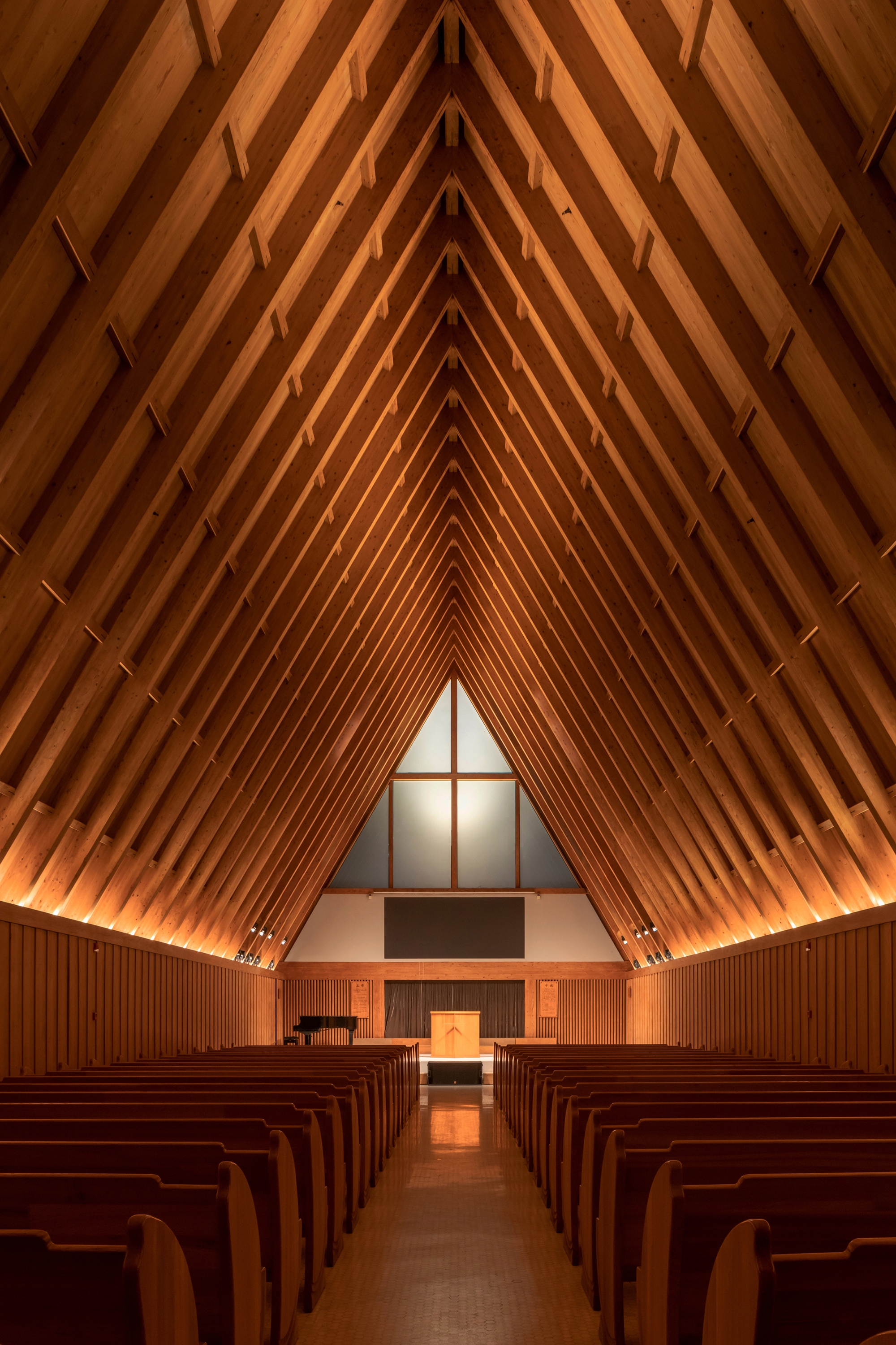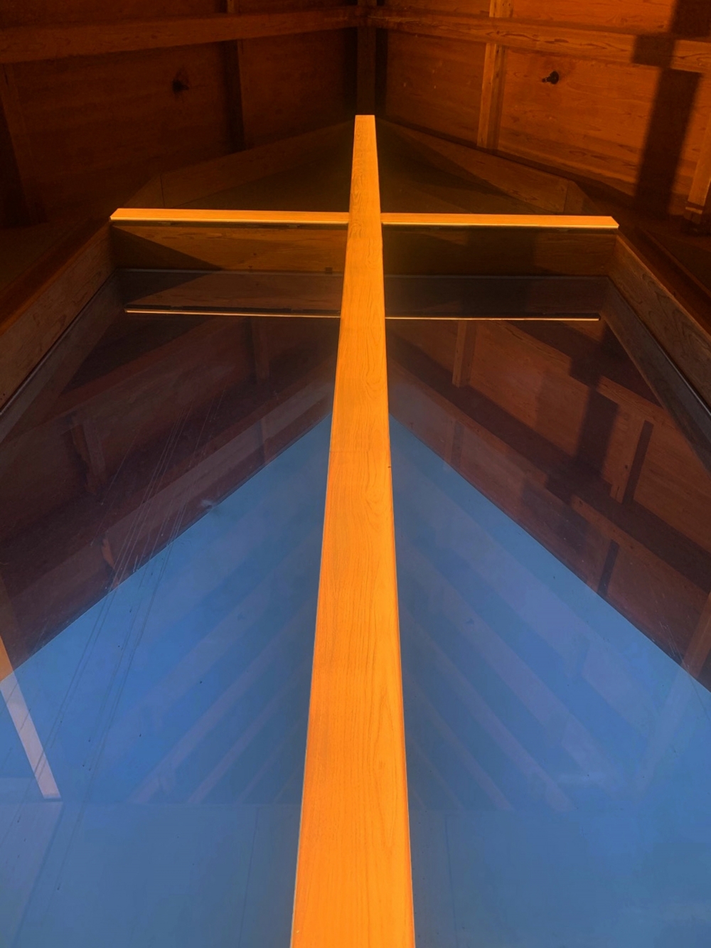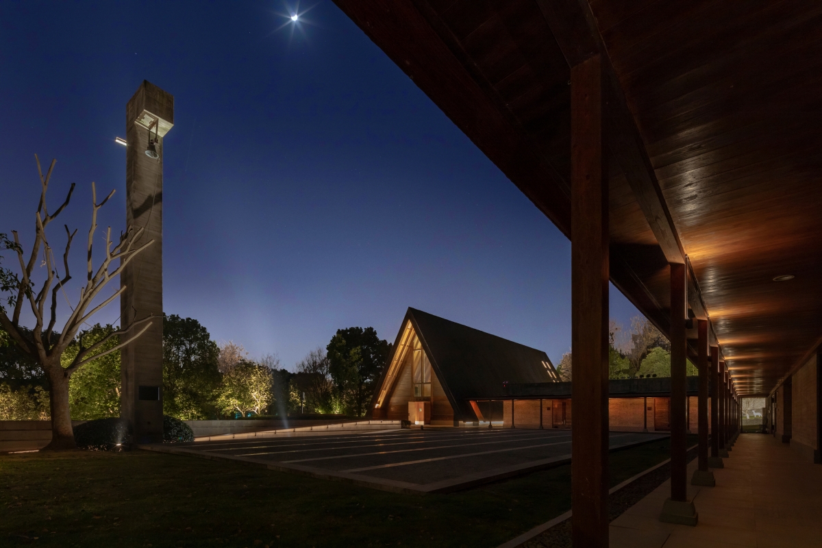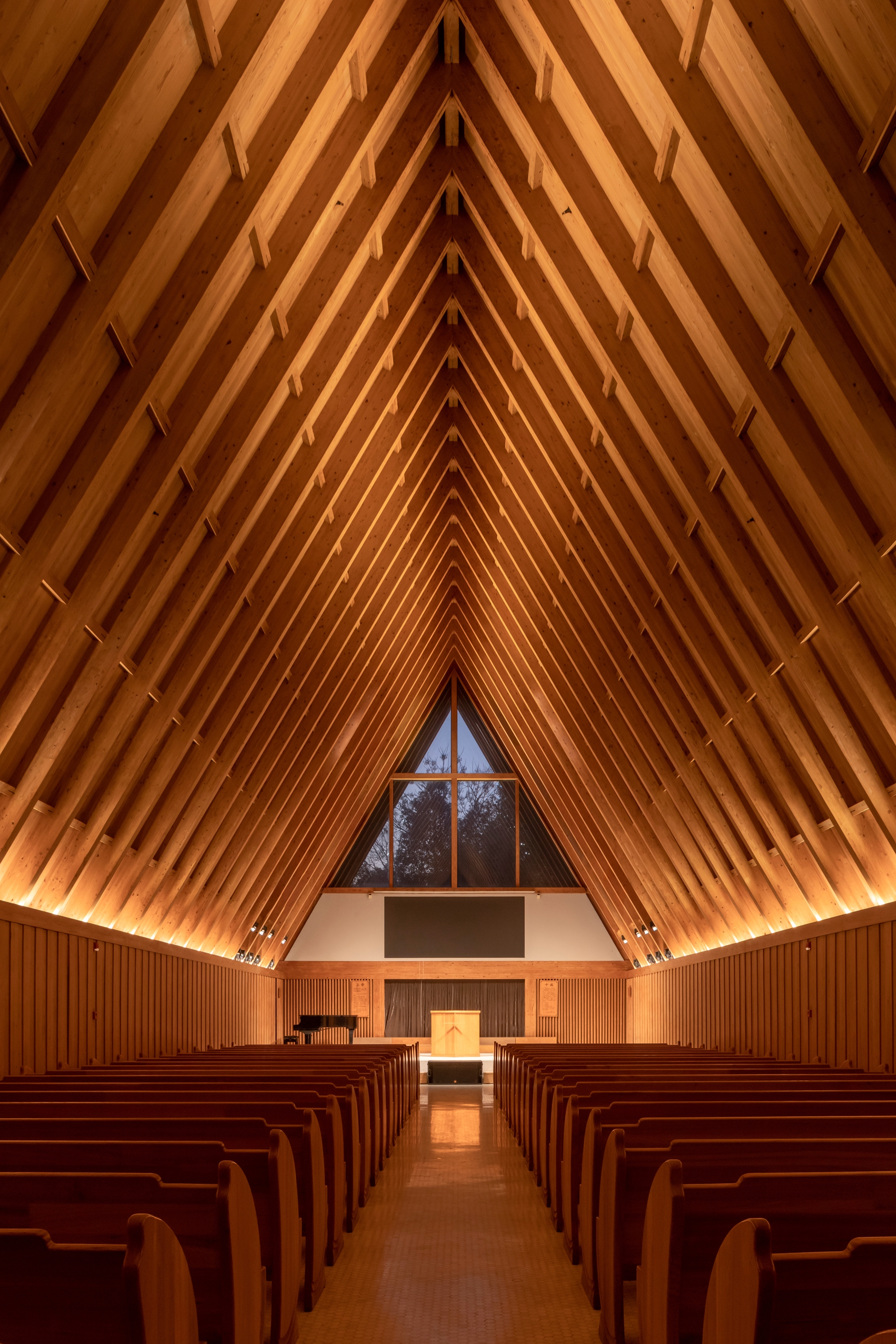 SPIRIT: When believers walk to the church. When they turned around after praying, they would be surprised to find that the pine wood structure has become a self-illuminating cross with a wood grain finish. The bright cross implies the eternity and purity after prayer.