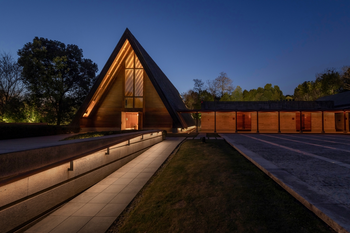 TIME: In order to balance the brightness of the interior space, the façade at the end of the entrance can adjust the atomization ratio of the switchable glass base on the intensity of outdoor sunlight during the day. As night falls, the switchable glass gradually becomes fully atomization. The spotlights in the backyard simulates natural light to supplement interior light and illuminate the cross structure to form a silhouette.
